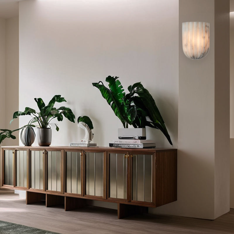 Brass Wall Sconce with Opal Glass Shade and Hand-Carved Alabaster - Elegant Light Fixture for Hardwired Installation, Perfect for Bathrooms