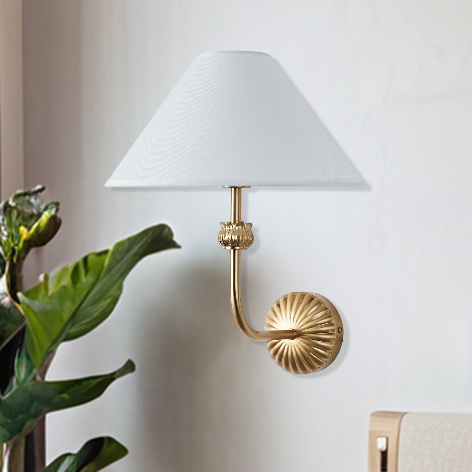 Mid-Century Sconce with Floral Linen Shade, Hardwired Indoor Wall Lamp with Curly Brass Arm, Vintage Wall Decor Lighting Fixture for Bedroom, Hallway, Bathroom, Staircase
