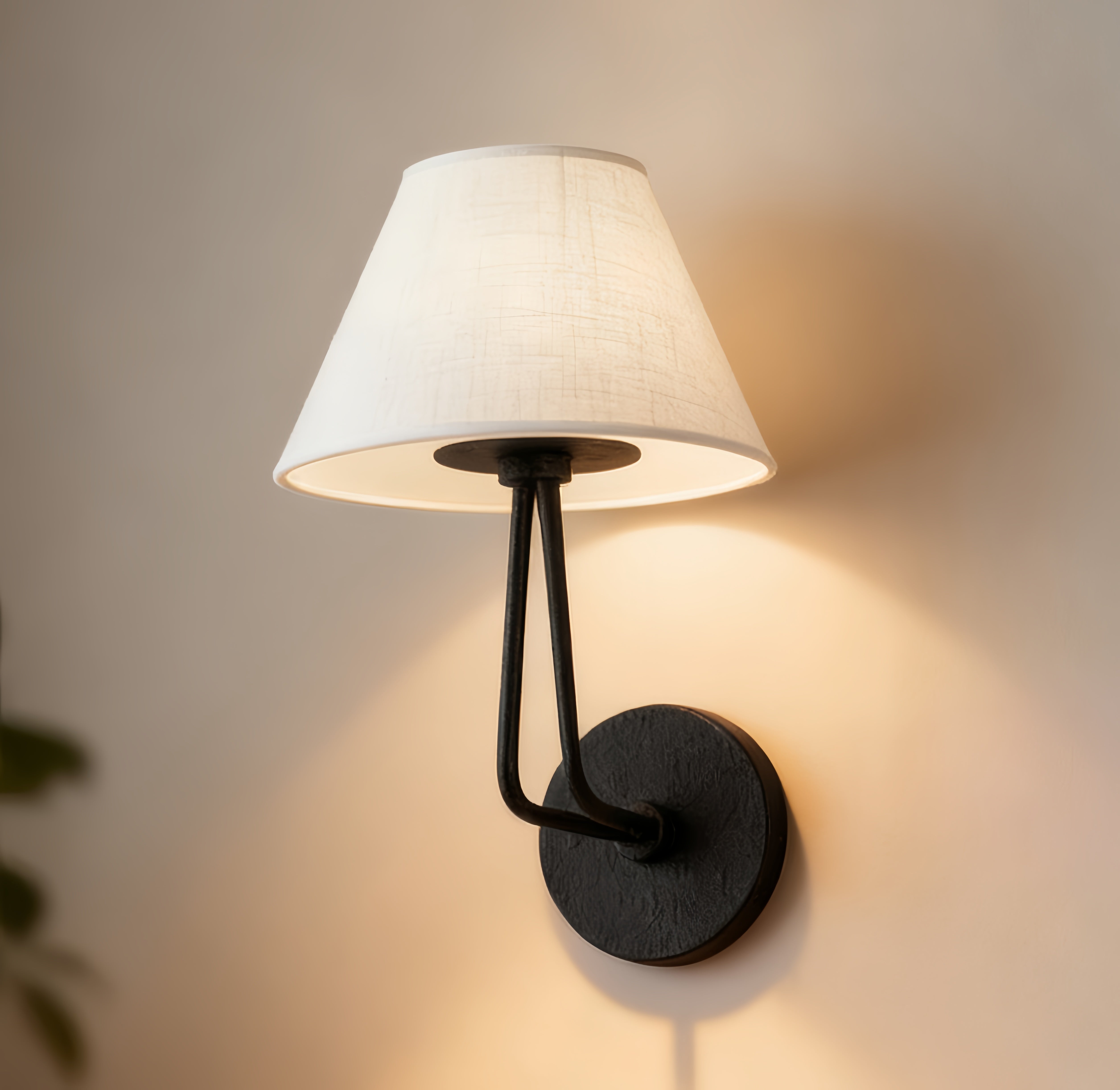 Iron Sconce with Demi-Lune Linen Shade - Hand-Forged Quality and Modern Design, Ideal for Bathroom and Modern Living Room Fixtures