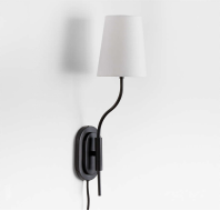 Mid-Century Single Light Wall Sconce with White Linen Shade, Industrial Wall Mounted Lamp with Wavy Black Forged Iron Arm, Hardwired Night Light for Bedroom, Living Room, Hallway