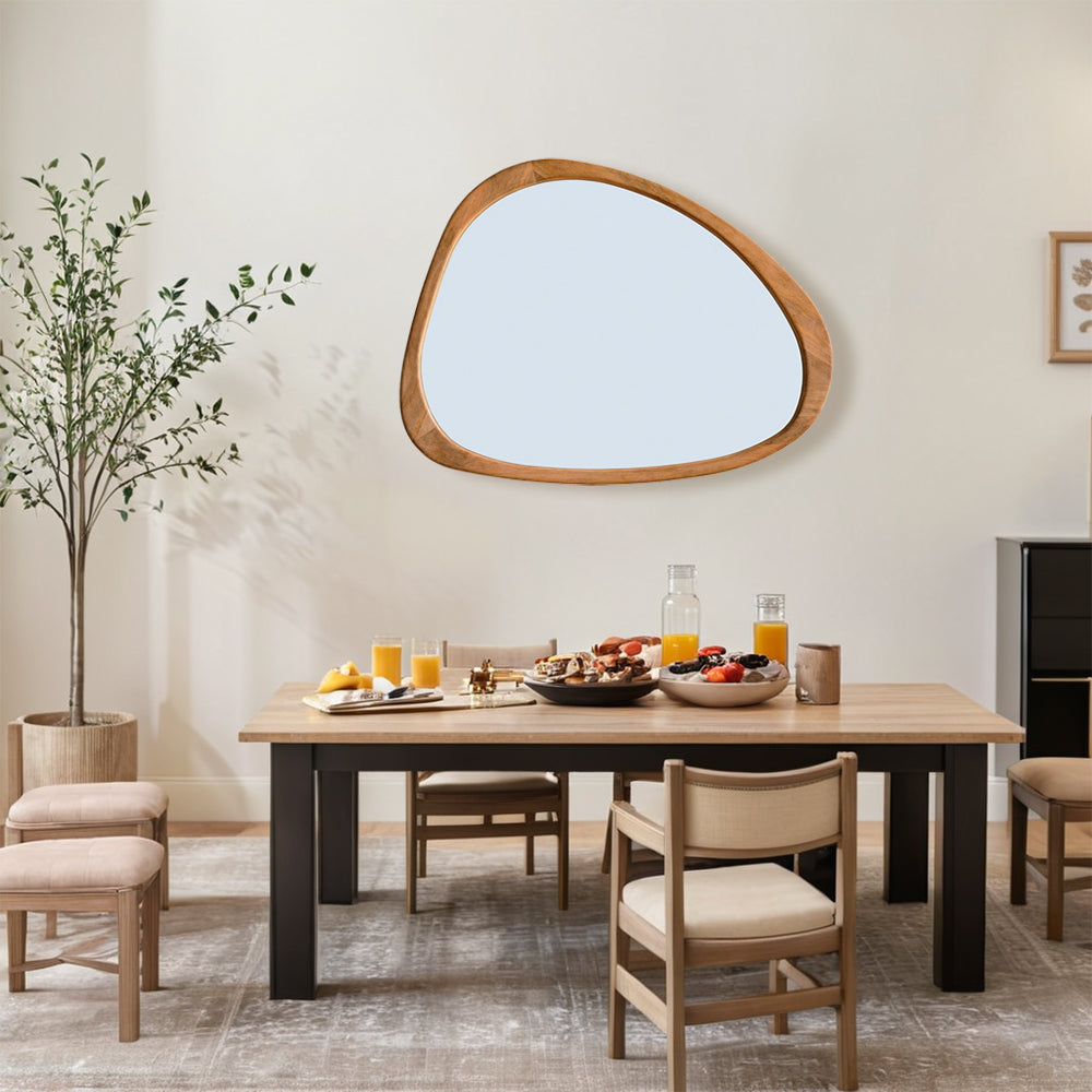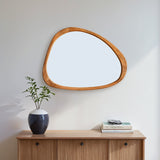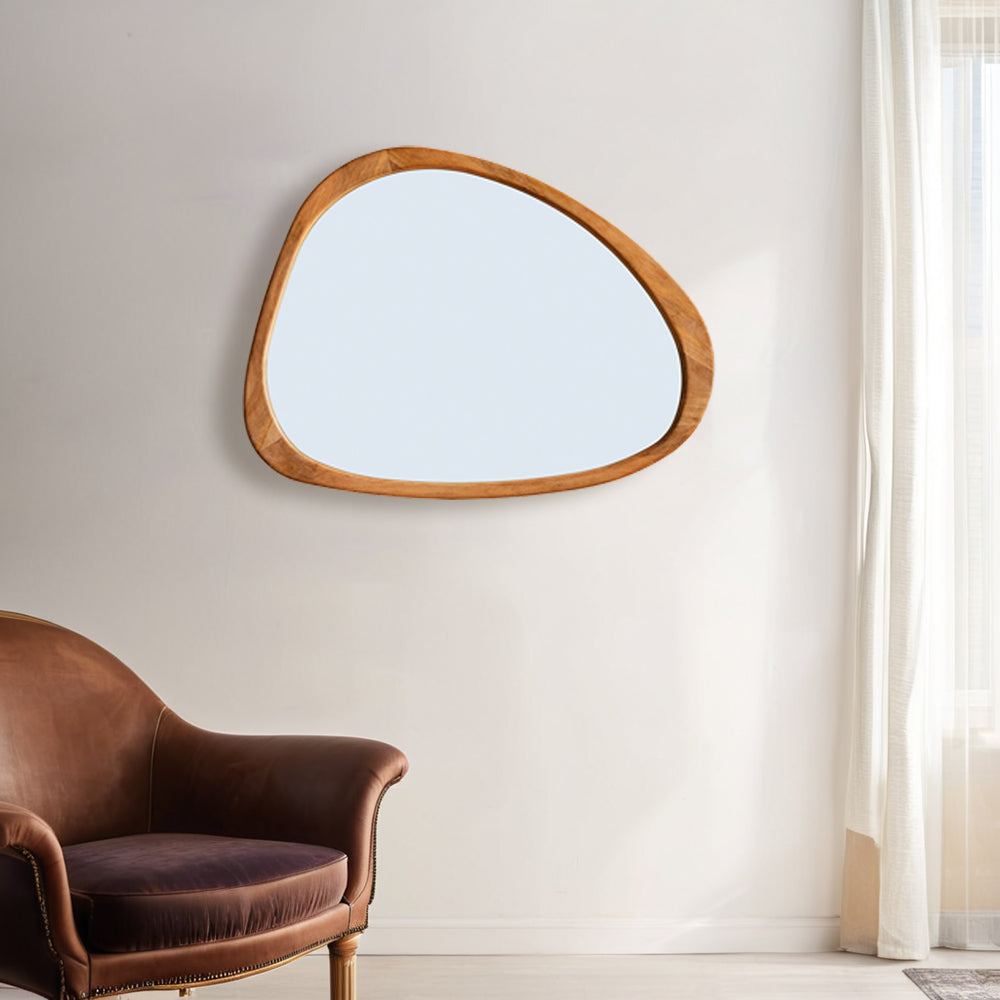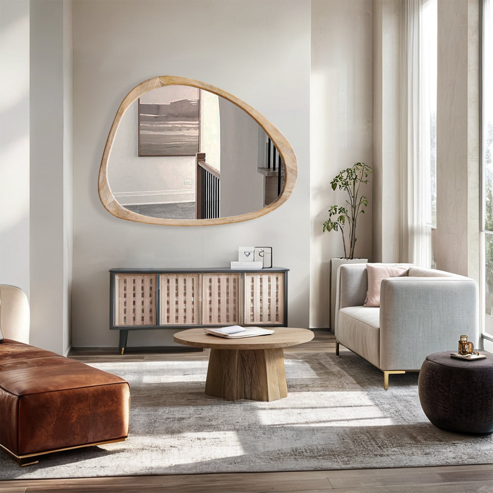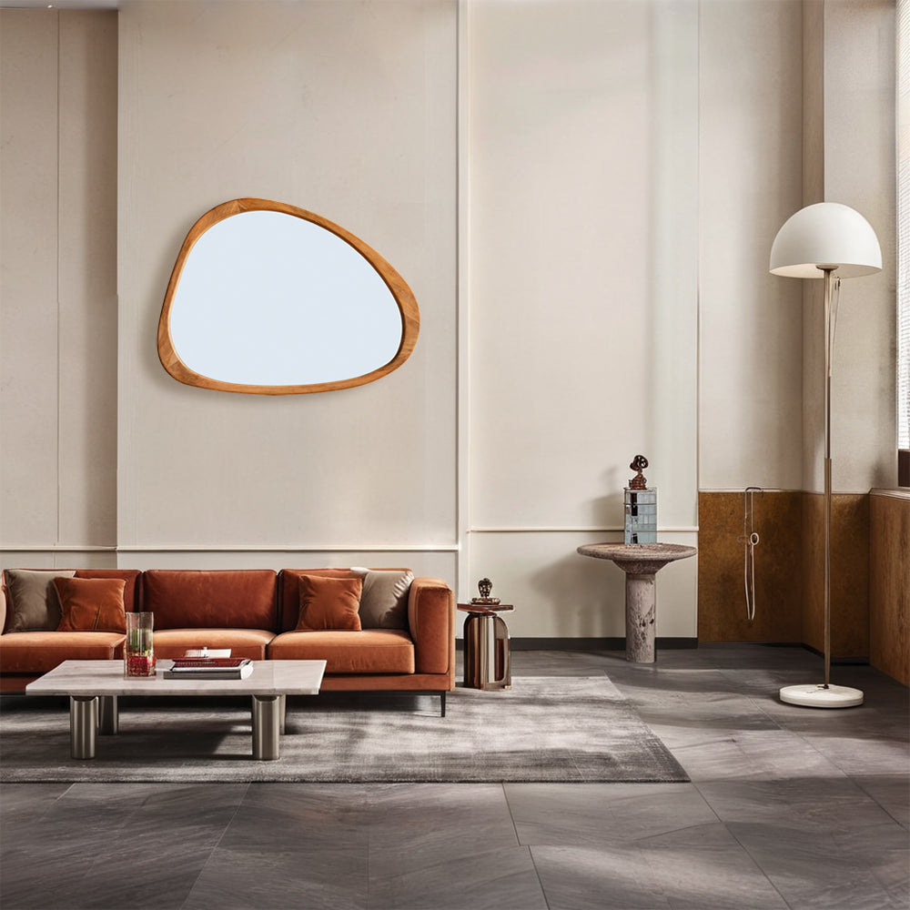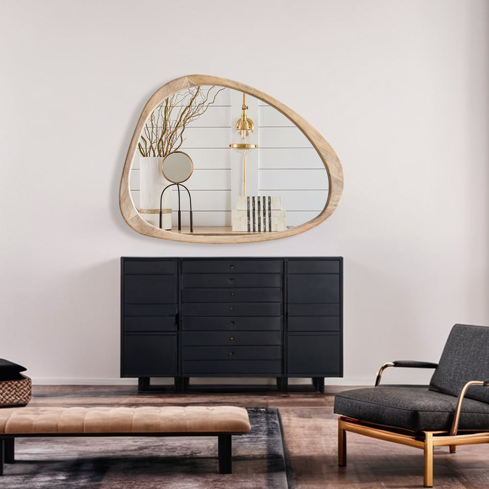 Introducing our stunning Asymmetrical Wall Mirror, a must-have for your home decor! This Large Asymmetrical Mirror features a handcrafted polished wood frame that adds a touch of natural elegance to any space. The solid and classic Acacia wood frame ensures durability and timeless style.