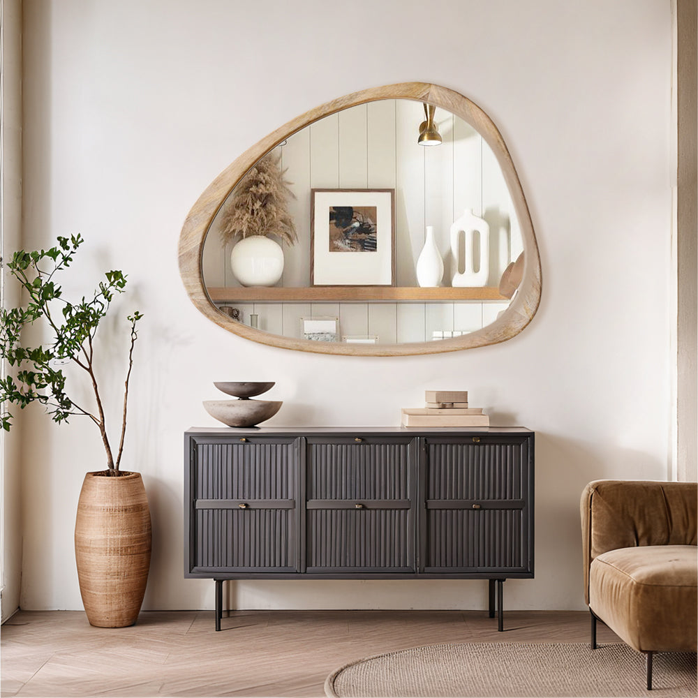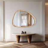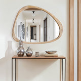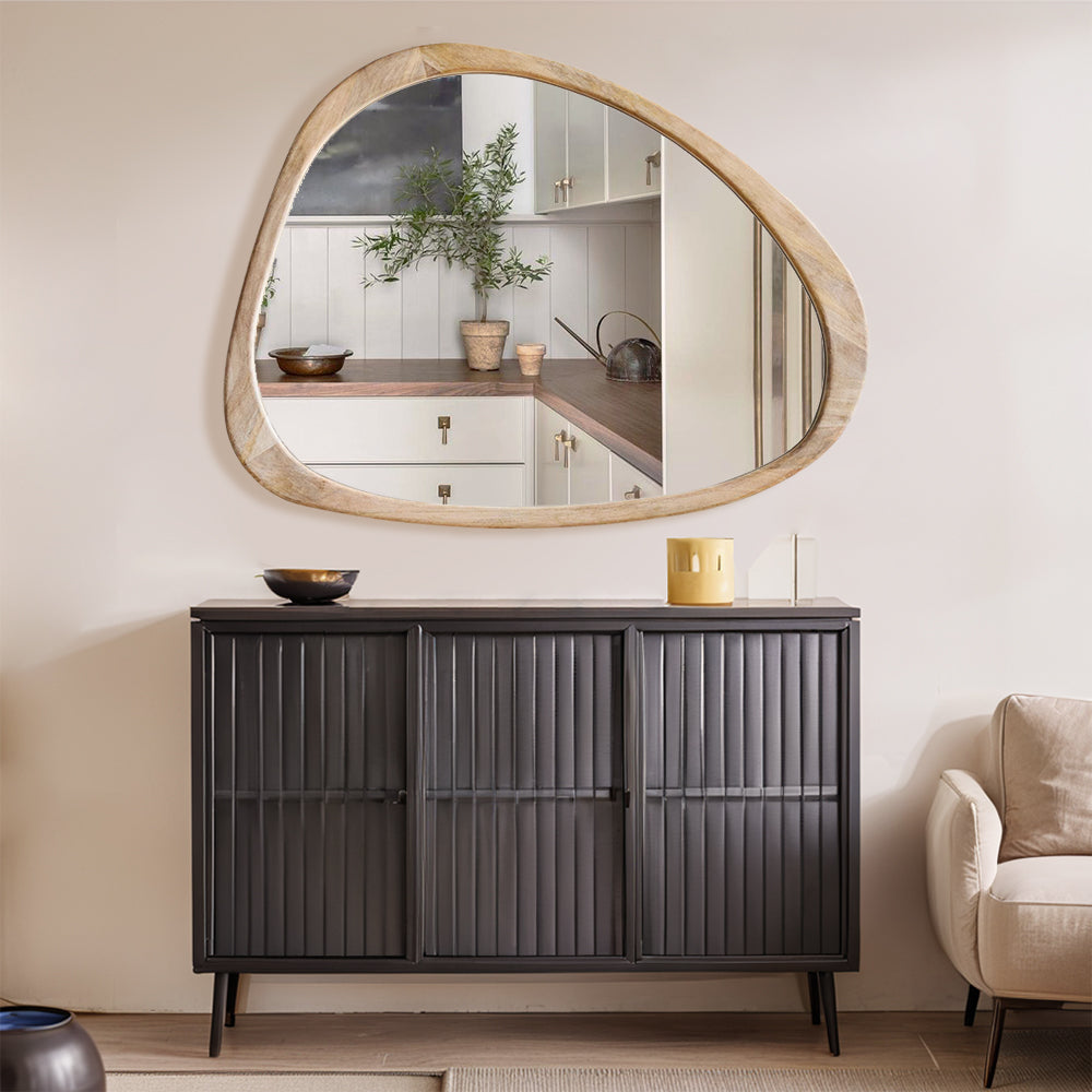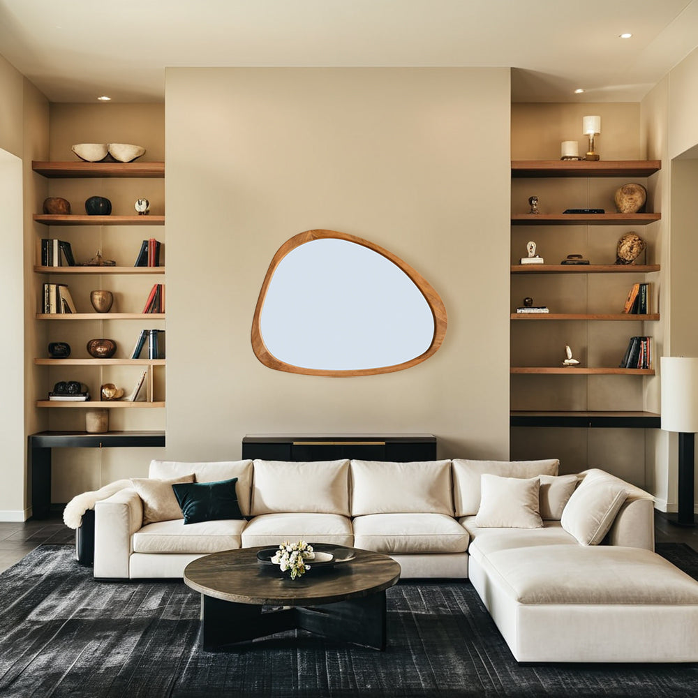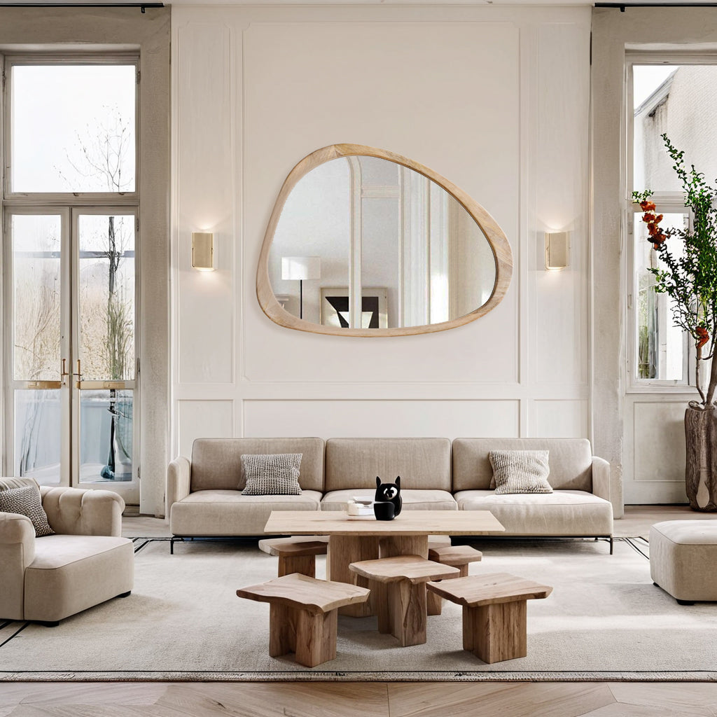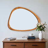 Introducing our stunning Asymmetrical Wall Mirror, a must-have for your home decor! This Large Asymmetrical Mirror features a handcrafted polished wood frame that adds a touch of natural elegance to any space. The solid and classic Acacia wood frame ensures durability and timeless style.