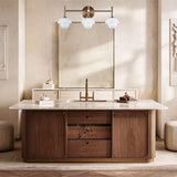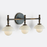 - Crafted with elegant brass construction, this bathroom sconce features rounded glass shades nestled into opal or alabaster bowls, each meticulously hand-carved by Italian artisans to showcase unique veining variations.