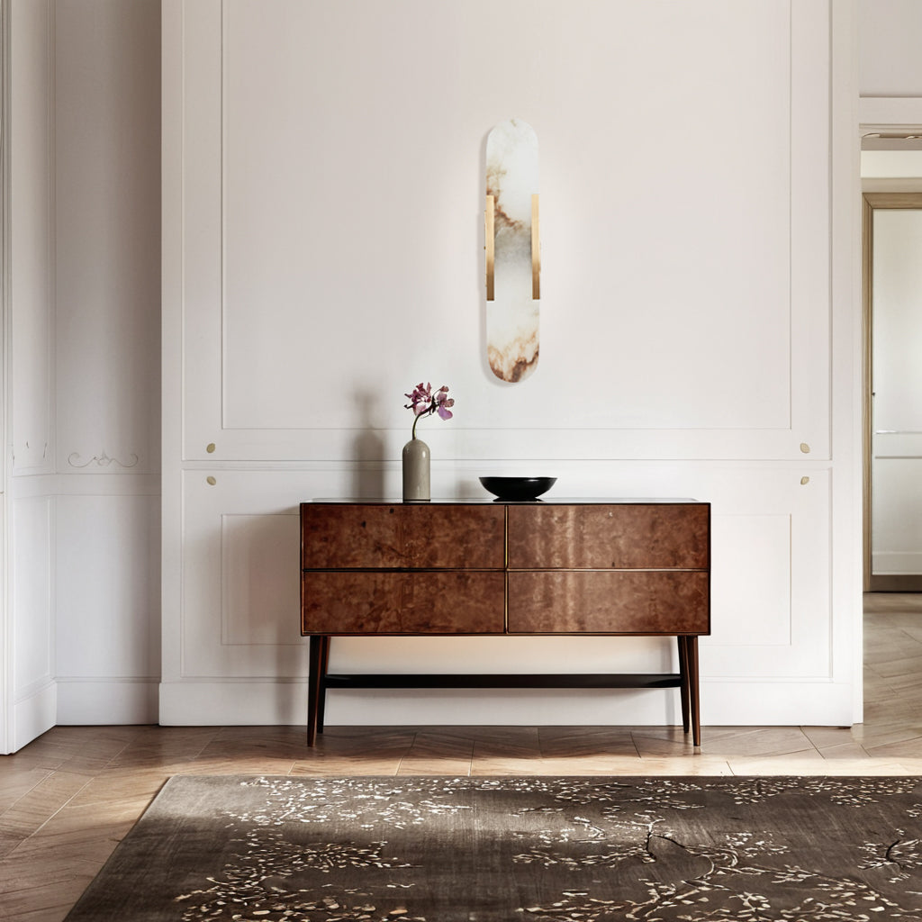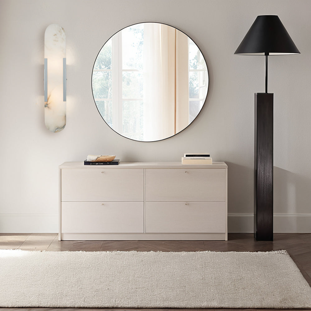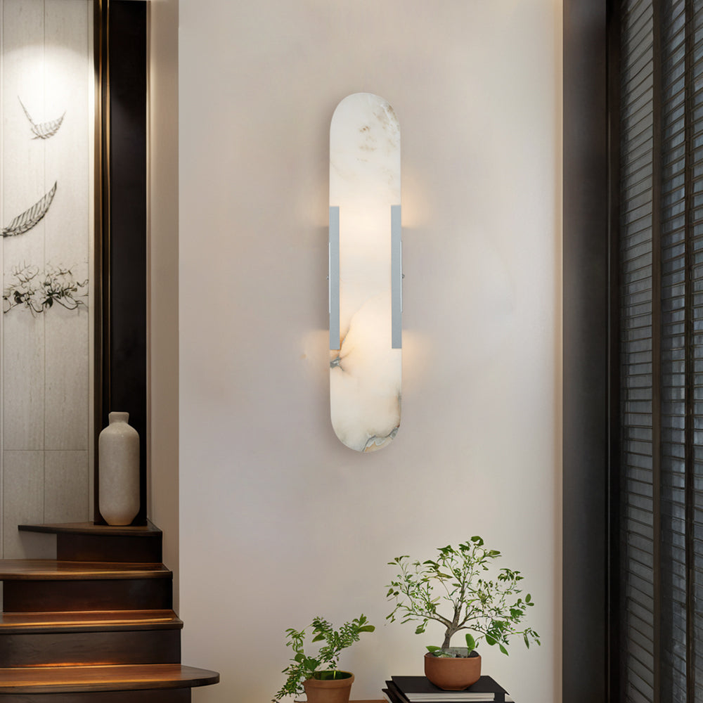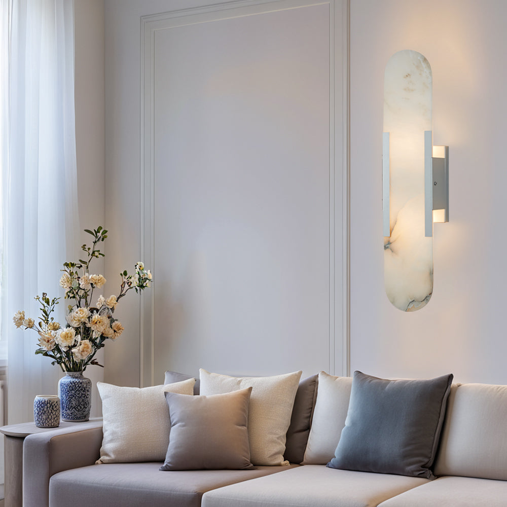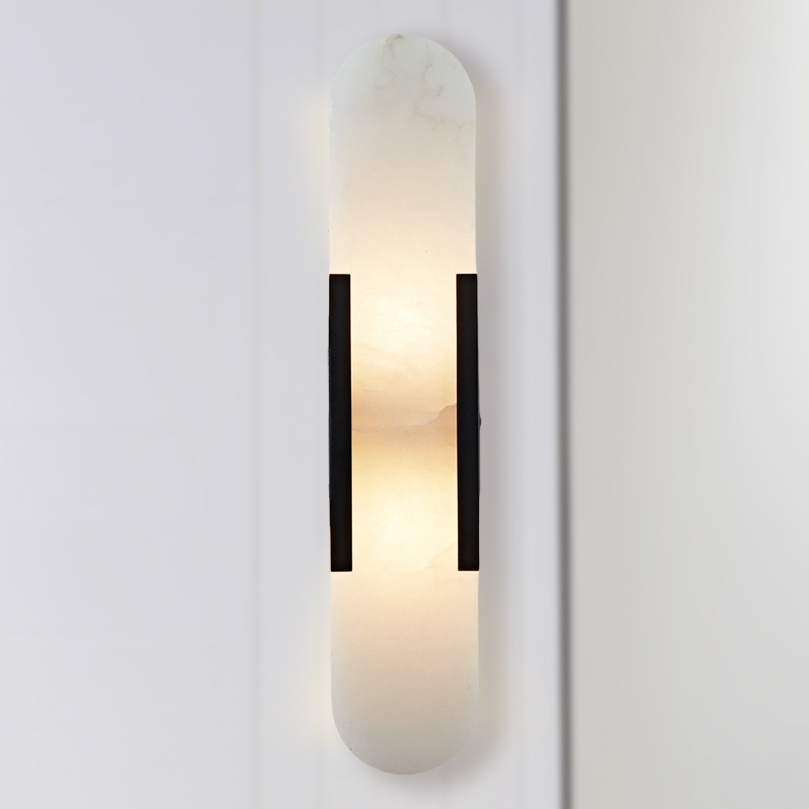 - This sleek sconce is designed with a pure alabaster shade and comes in three sophisticated finishes to elevate your bathroom decor.