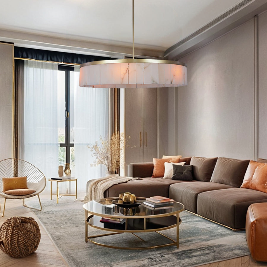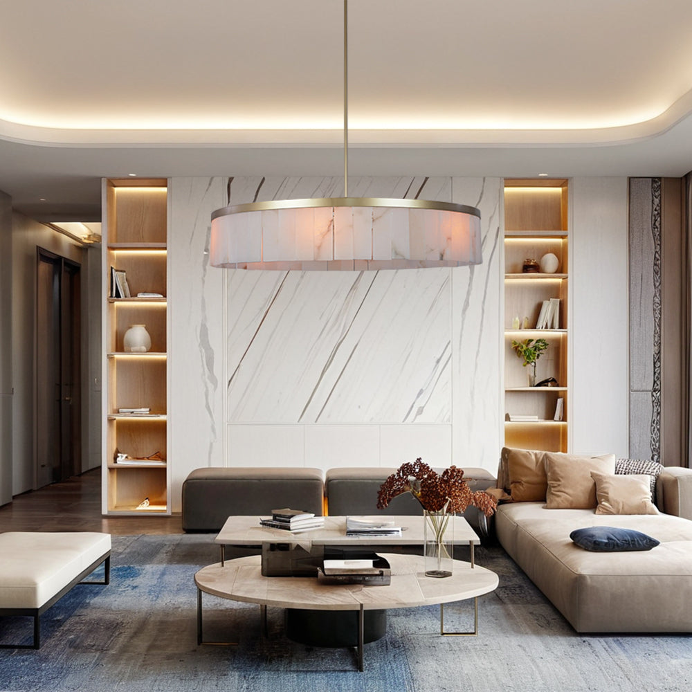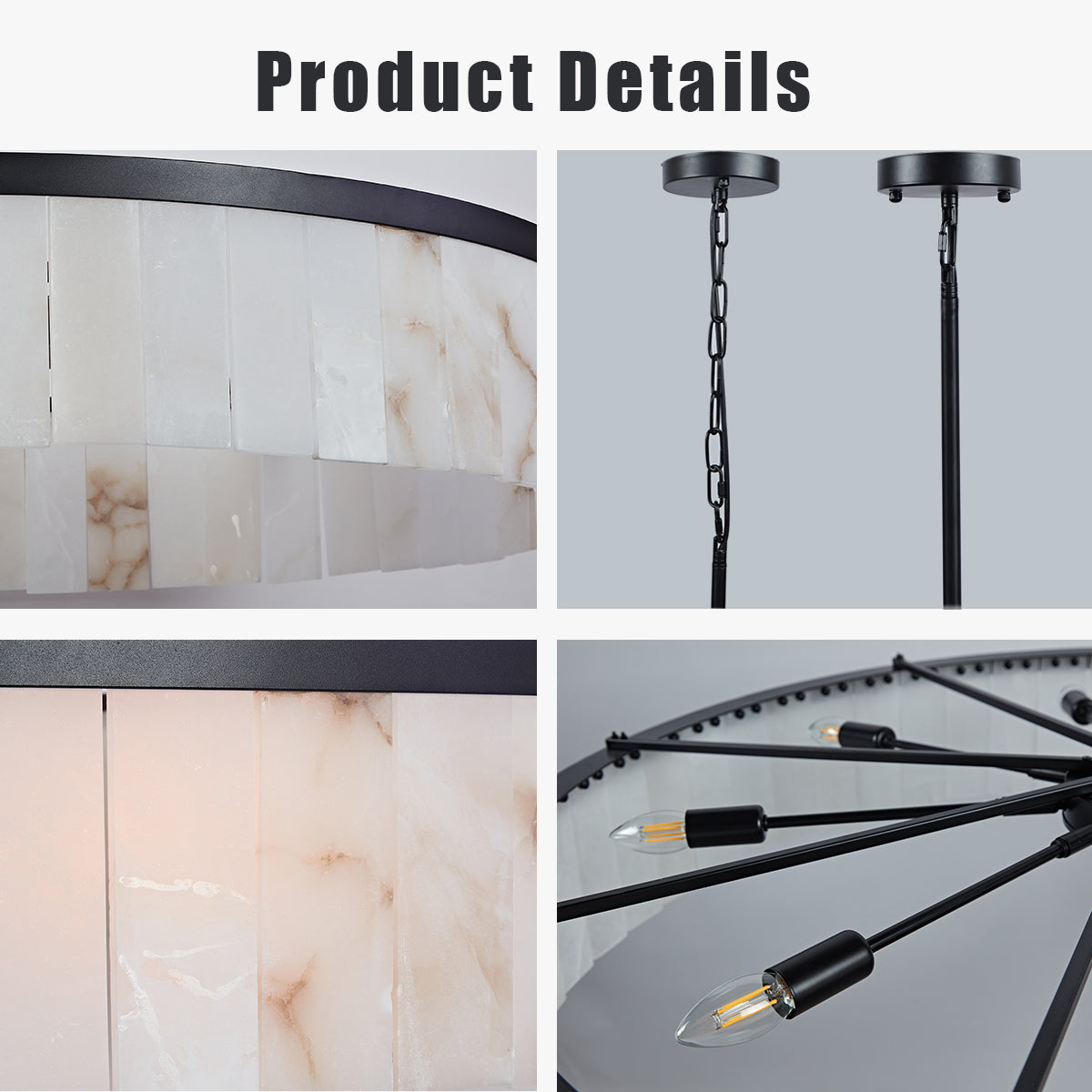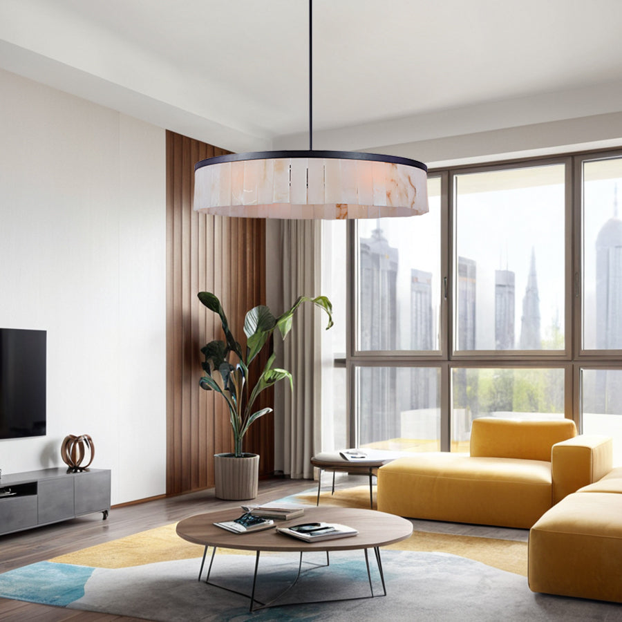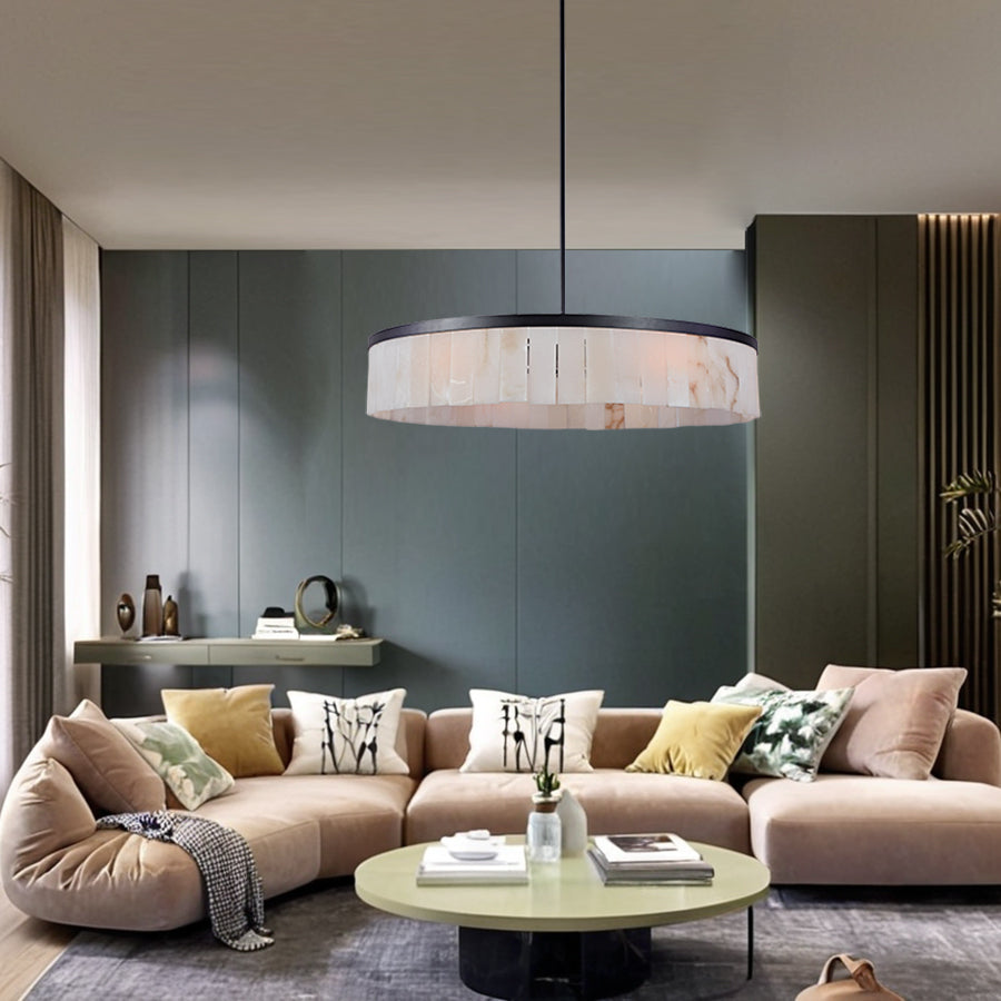 - Elevate the ambiance of your living space with our exquisite Living Room Chandelier Collection. This hanging light fixture exudes modern elegance with its iron frame adorned with solid alabaster tiles, creating a captivating focal point in any room.