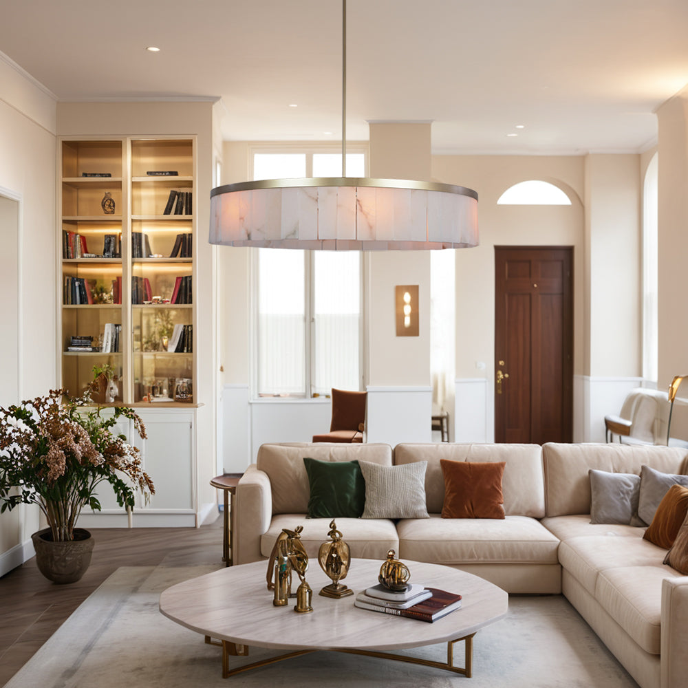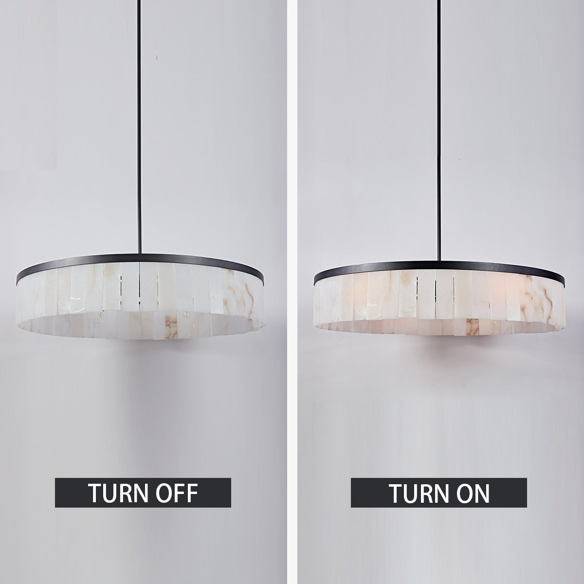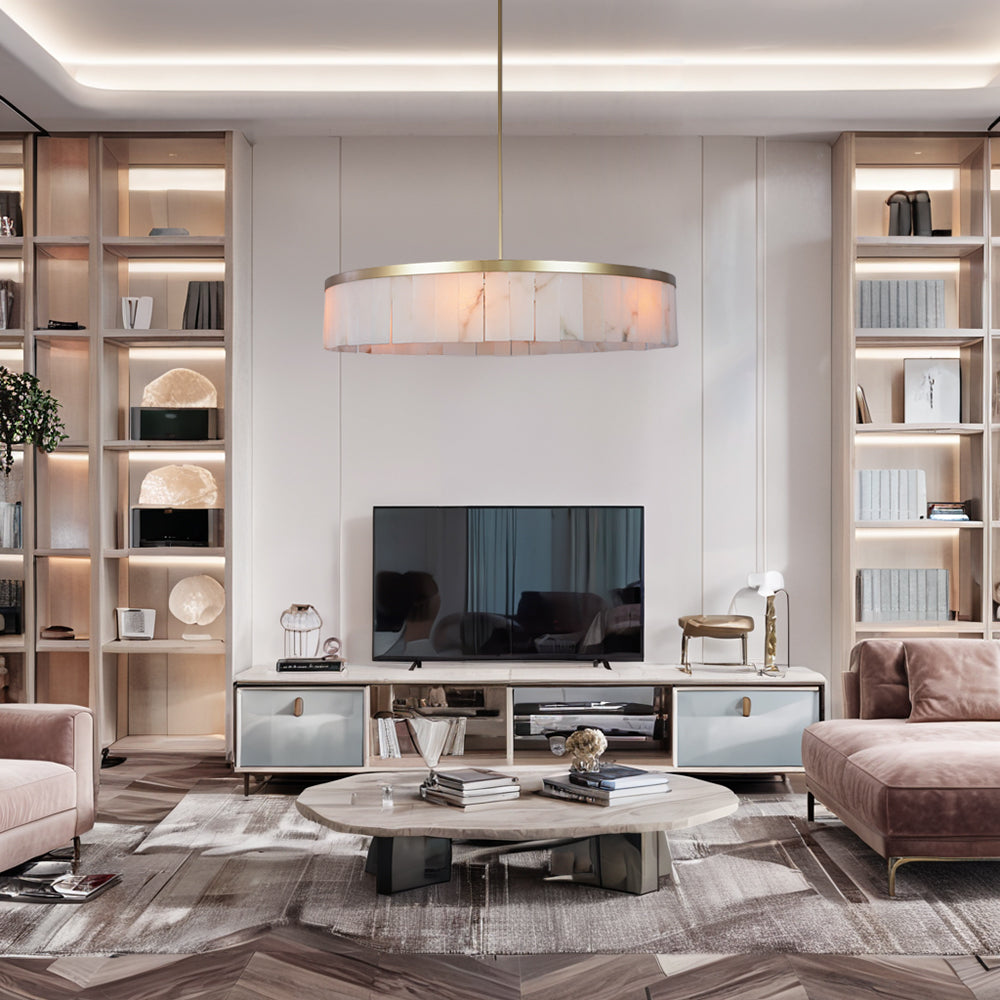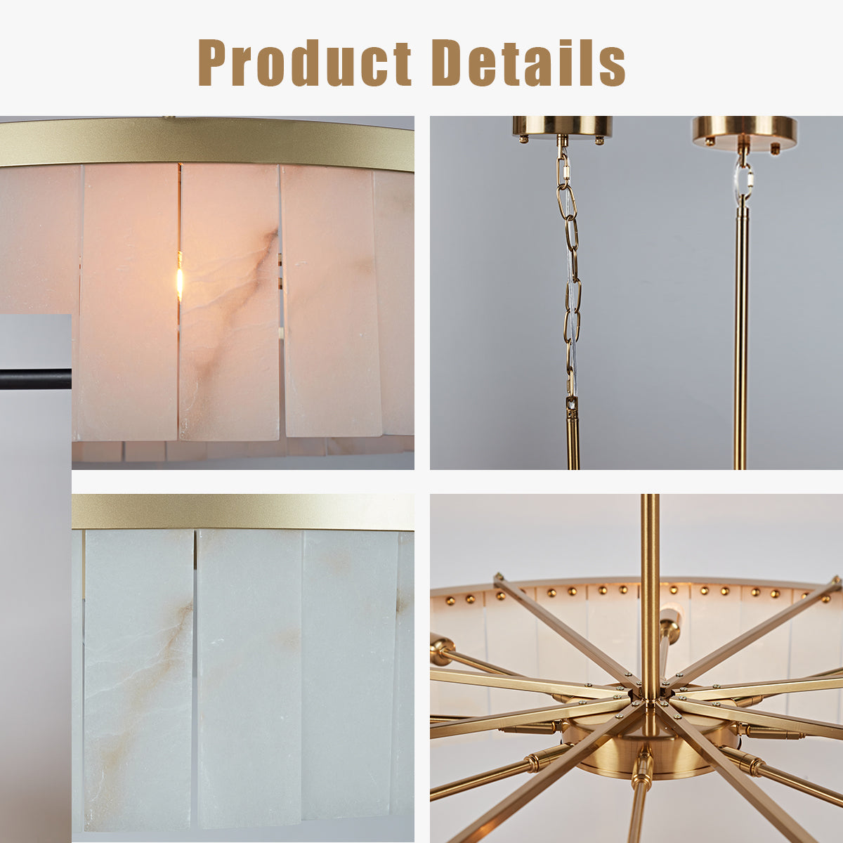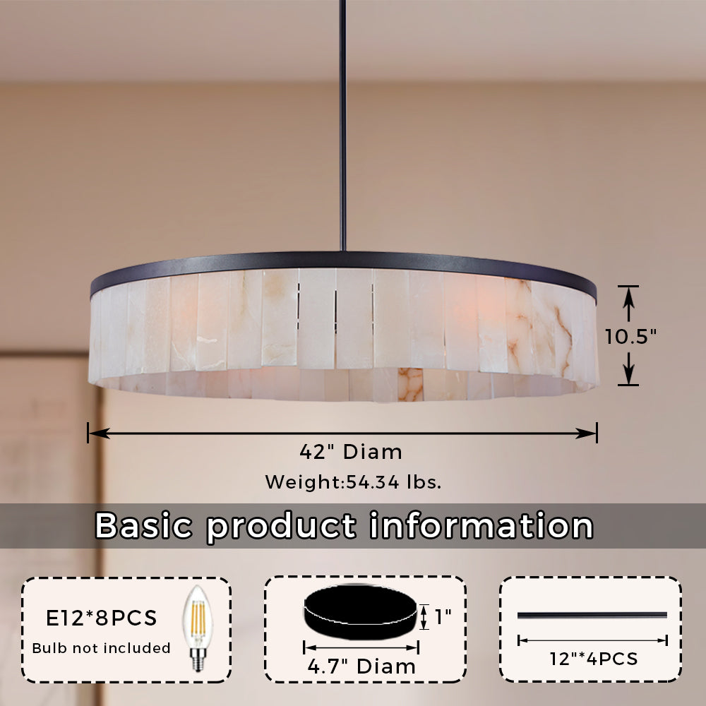 - Elevate the ambiance of your living space with our exquisite Living Room Chandelier Collection. This hanging light fixture exudes modern elegance with its iron frame adorned with solid alabaster tiles, creating a captivating focal point in any room.