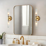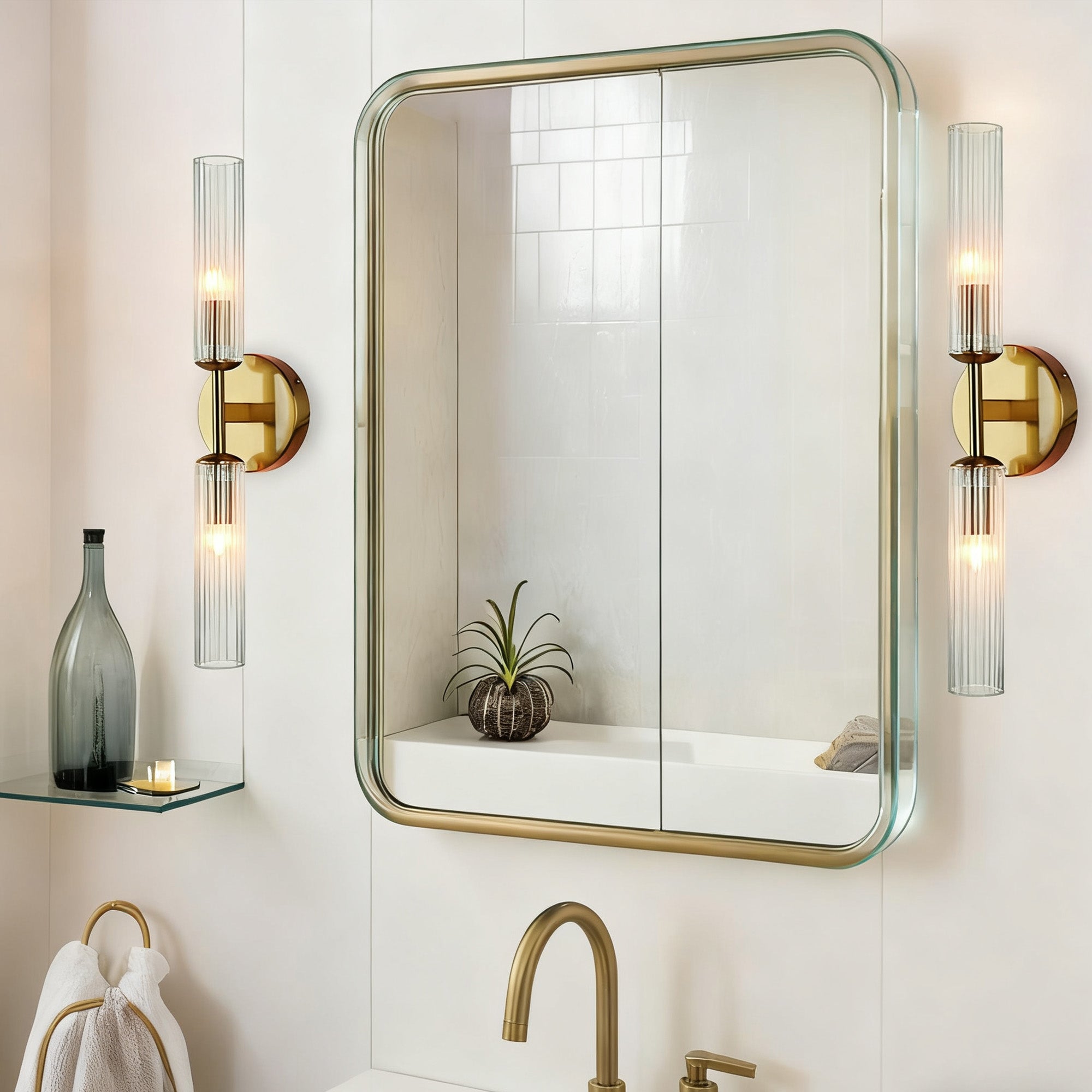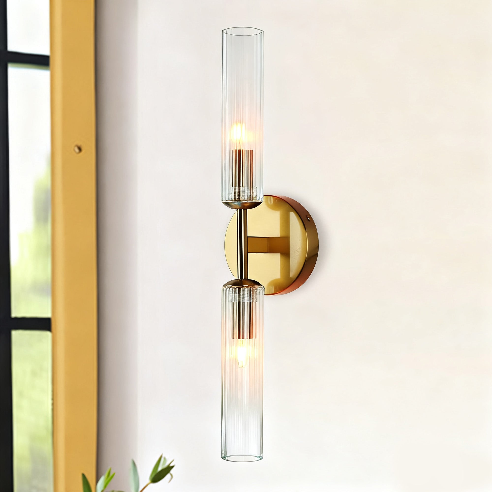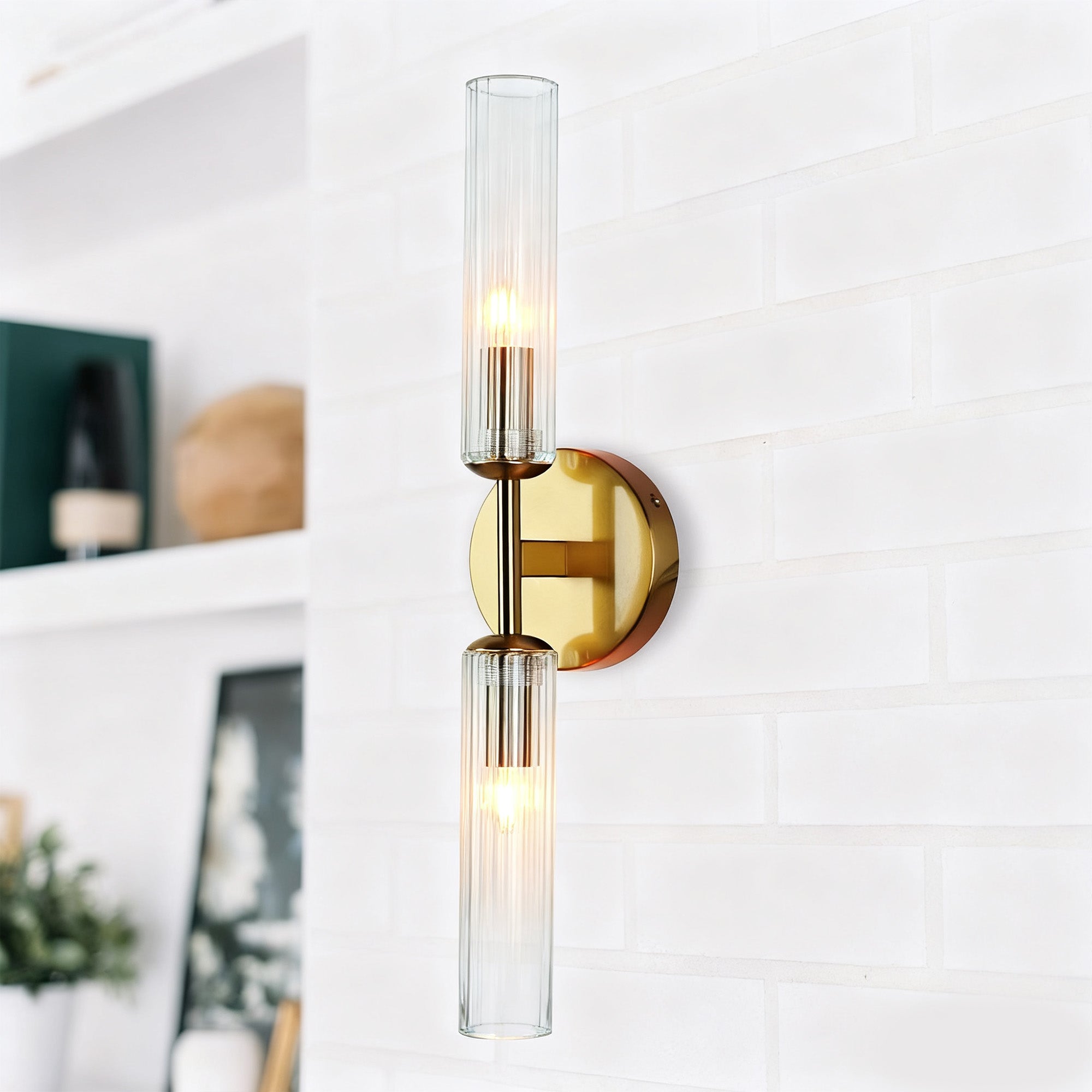 - Crafted with beautiful ribbed glass shades, this fixture casts a warm, inviting glow that instantly transforms your ambiance. Its elegant cylindrical design, available in finishes like Antique Bronze, Satin Nickel, and Tumbled Brass, fits perfectly with a variety of decor styles—making it a fantastic choice for wall lights for the bedroom or as bath sconces to give your bathroom that spa-like feel.
