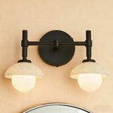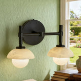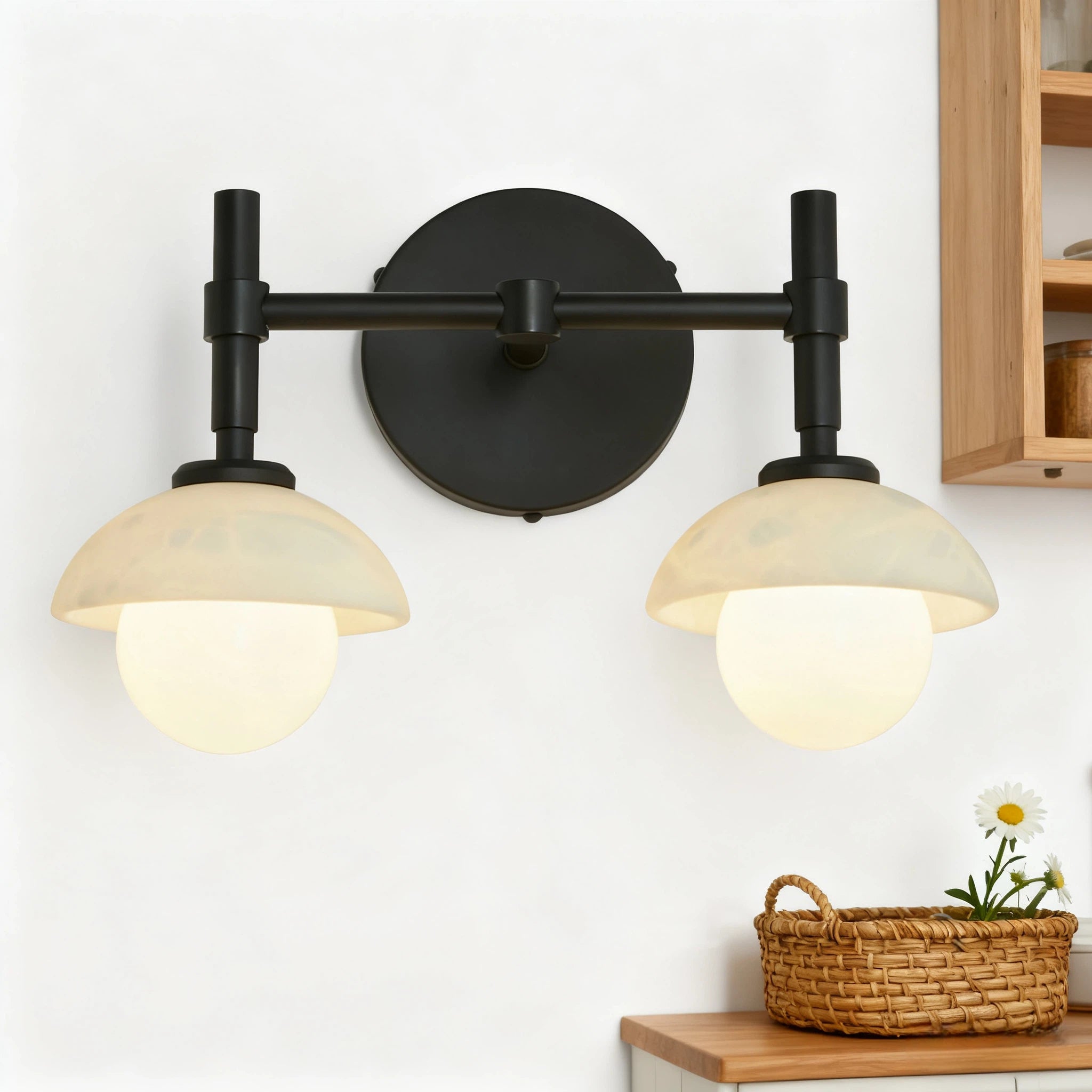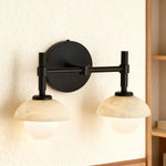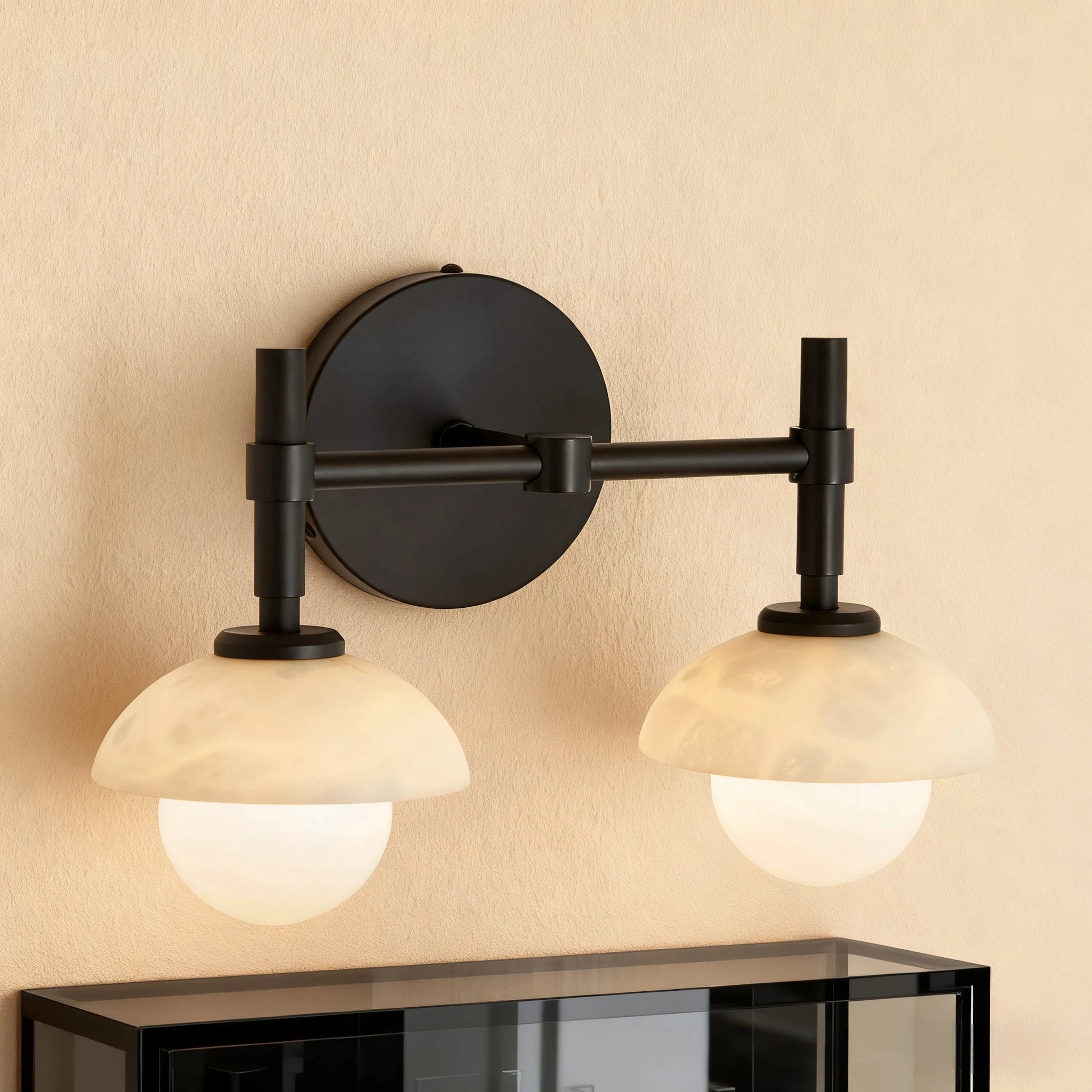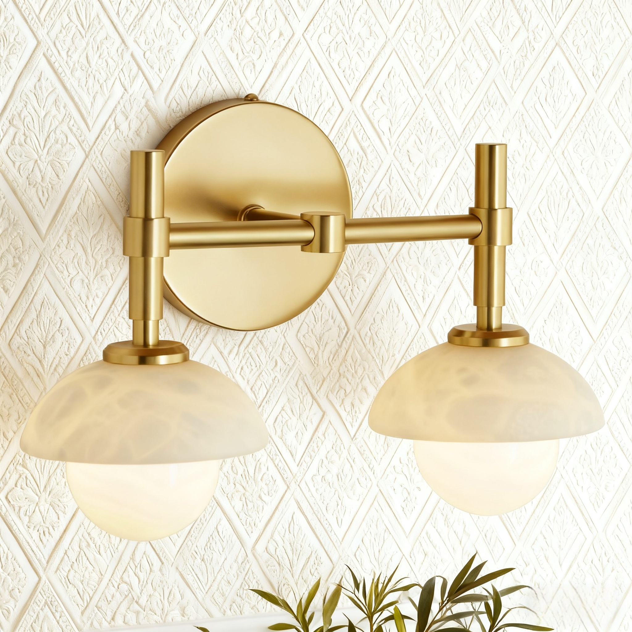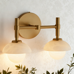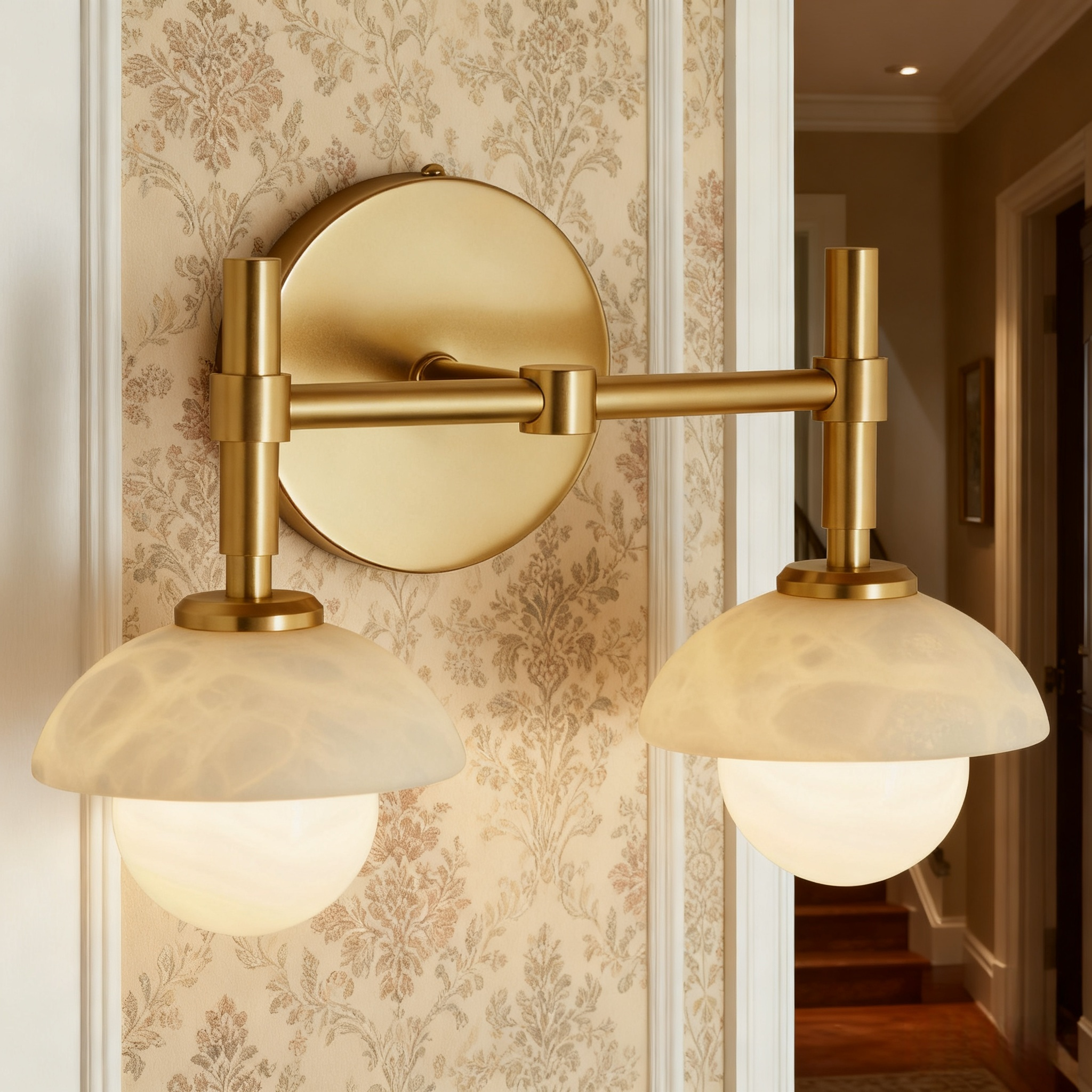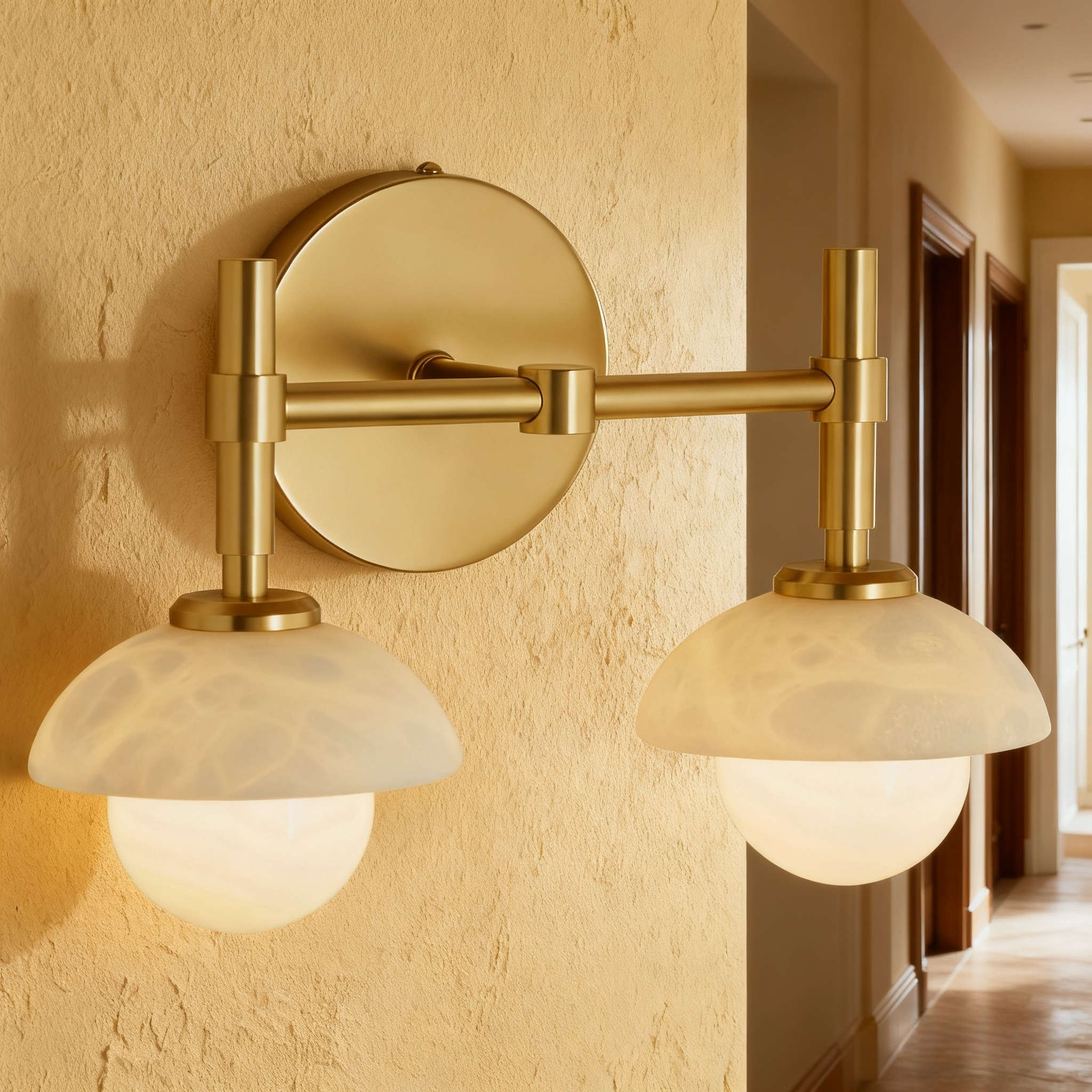 - Sophisticated Design: This stunning sconce features elegant brass construction, beautifully highlighting rounded glass shades that are nestled within bowls made from opal glass or natural alabaster, showcasing unique variations in veining for added beauty.