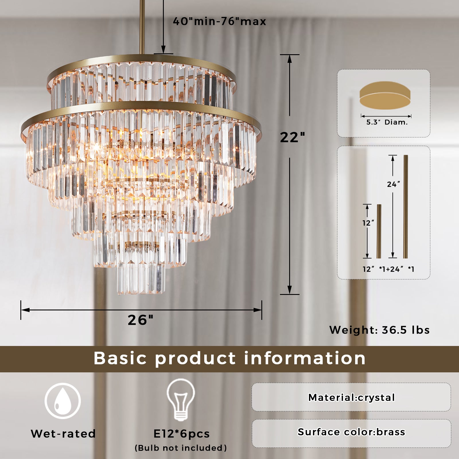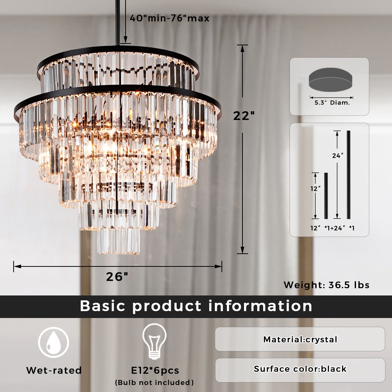 - 26" accommodates six 40 watts, type B Candelabra bulbs or LED equivalent.