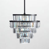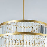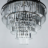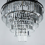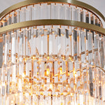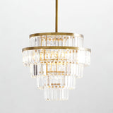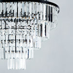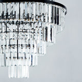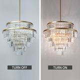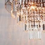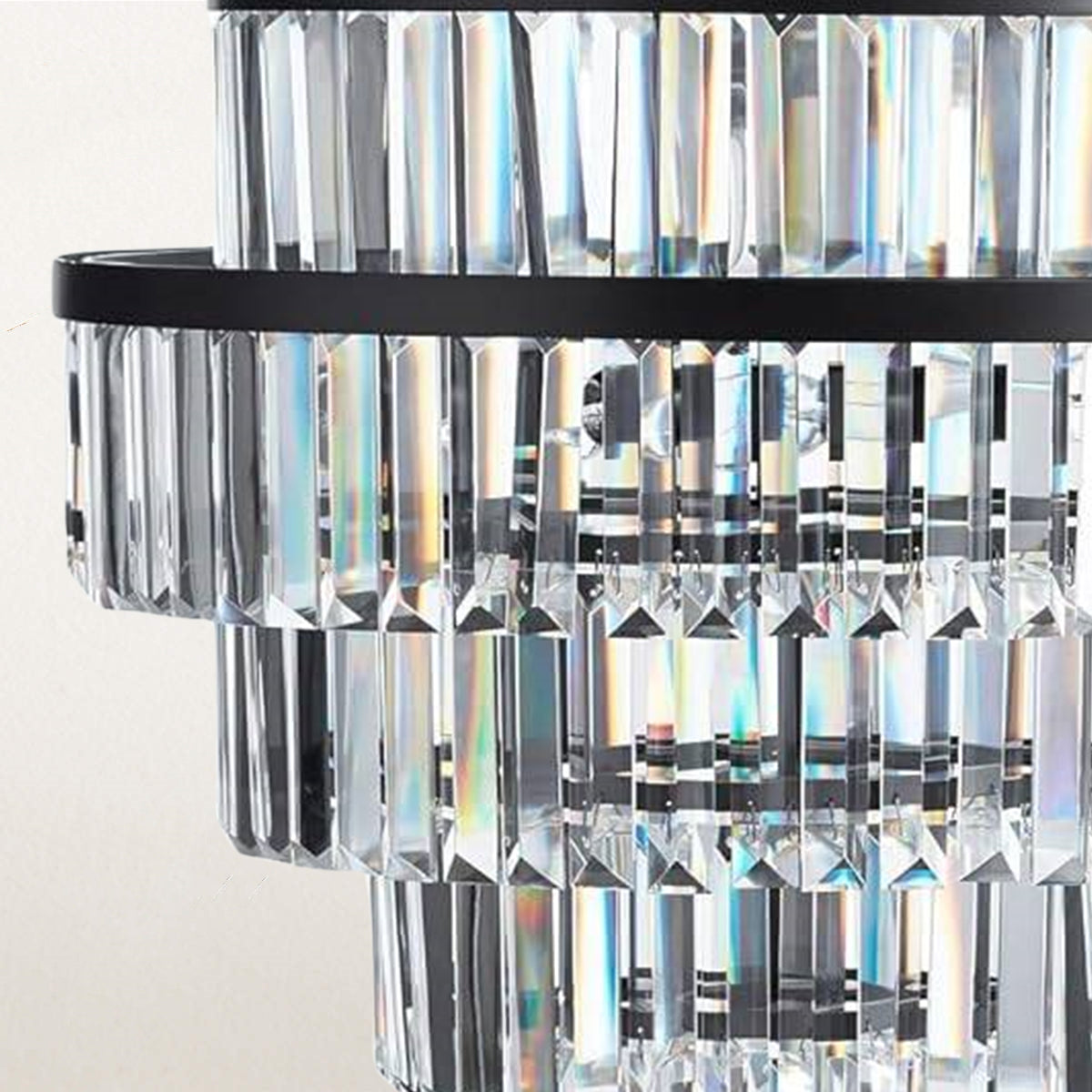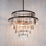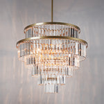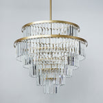 - This stunning piece features tiers of clear, faceted crystals delicately suspended from antique bronze or vintage brass-finished bands, adding a touch of contemporary elegance to a classic design.