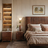 - Illuminating Shade: The narrow white linen shade beautifully complements the frame and provides warm, inviting light through its sleek angled construction.