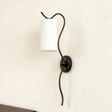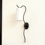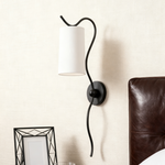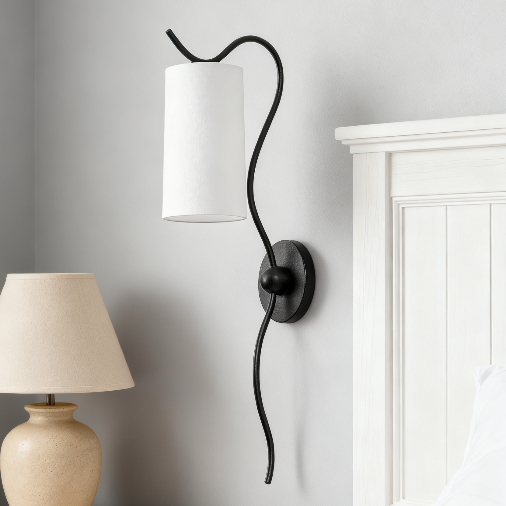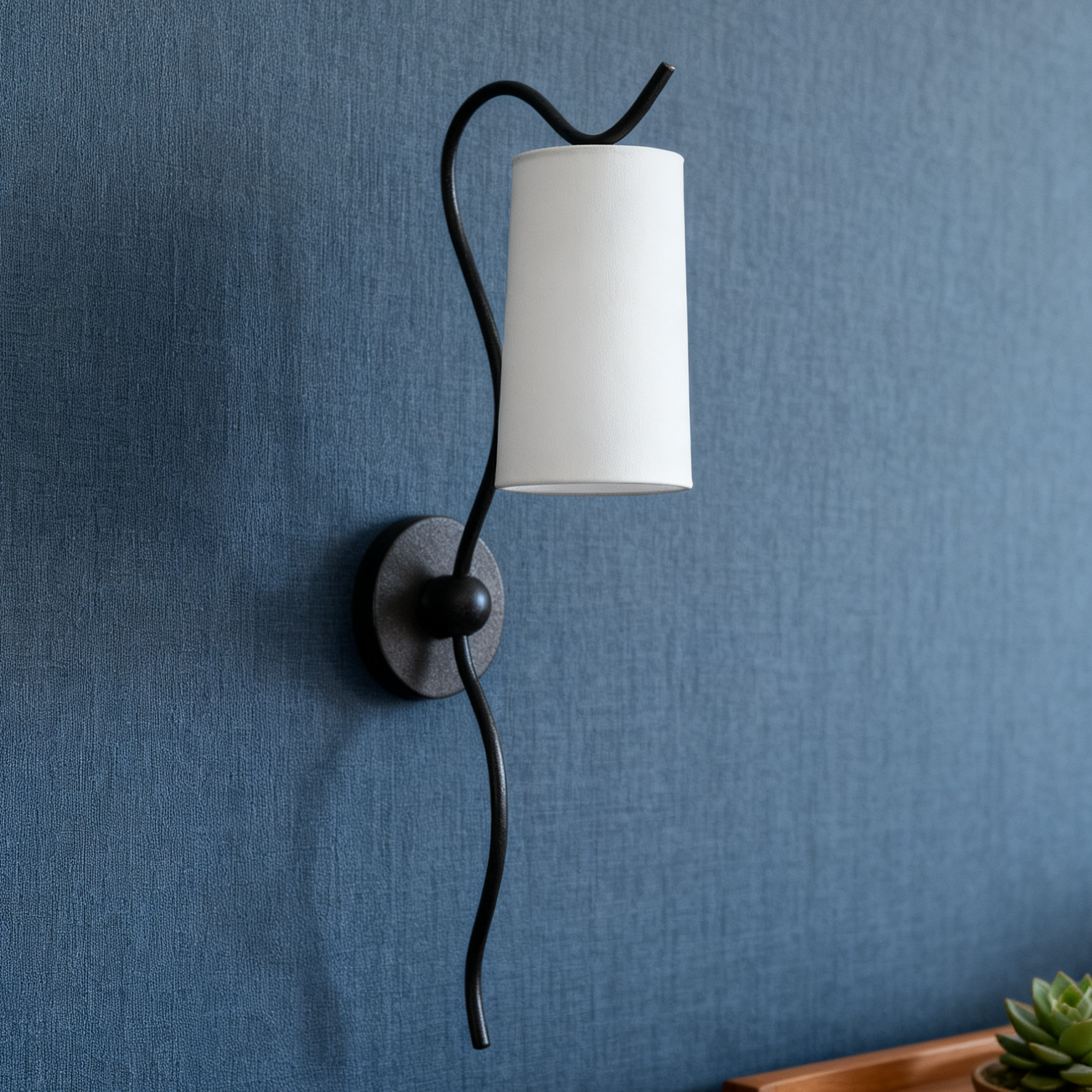 - Introduce an artful touch to your lighting design with the wavy arm featured of this modern wall sconce. Grounded by a forged iron construction, this sconce light sconce is adorned with a linen drum shade for soft, diffused illumination. The compact profile is ideal for smaller spaces, or installed in series to light a larger living area.