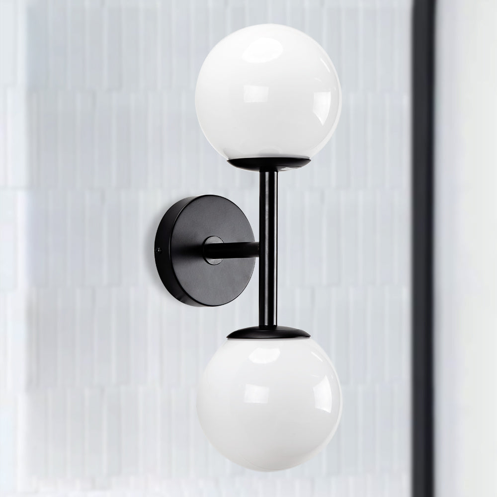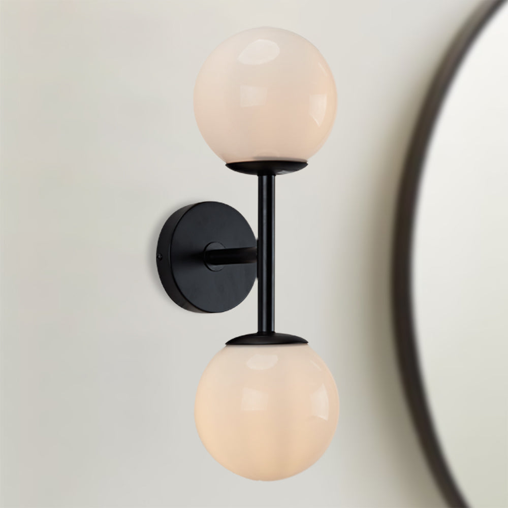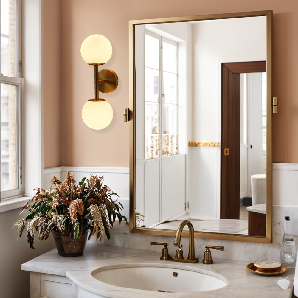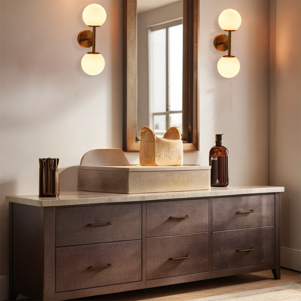 - Crafted from solid brass and adorned with opal globe shades, this sconce radiates a soft and sophisticated glow, perfect for illuminating your kitchen walls, bathroom vanity, or outdoor living areas.