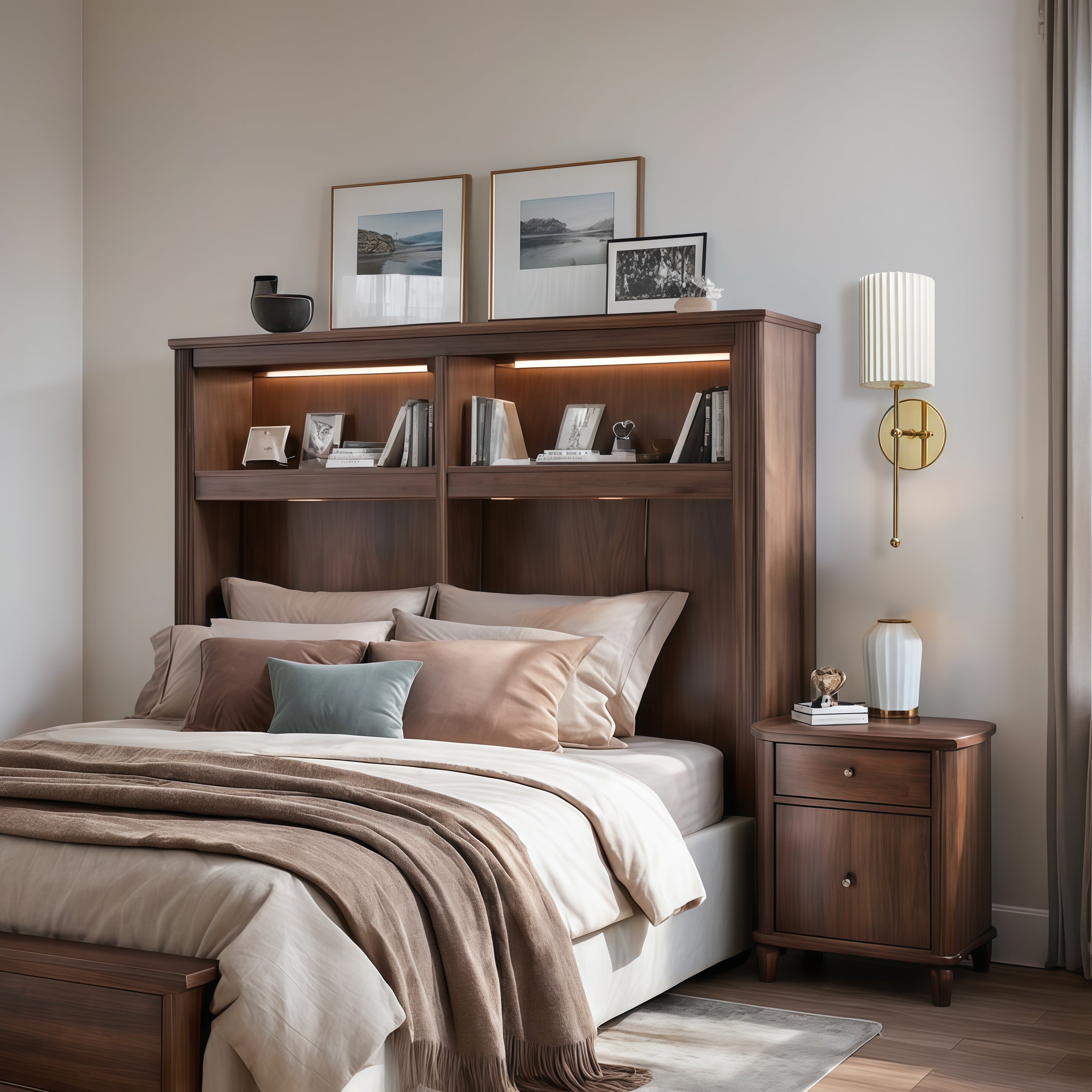 - The pleated linen shade, accented by a brass "boule," adds a touch of sophistication to your bedroom decor.