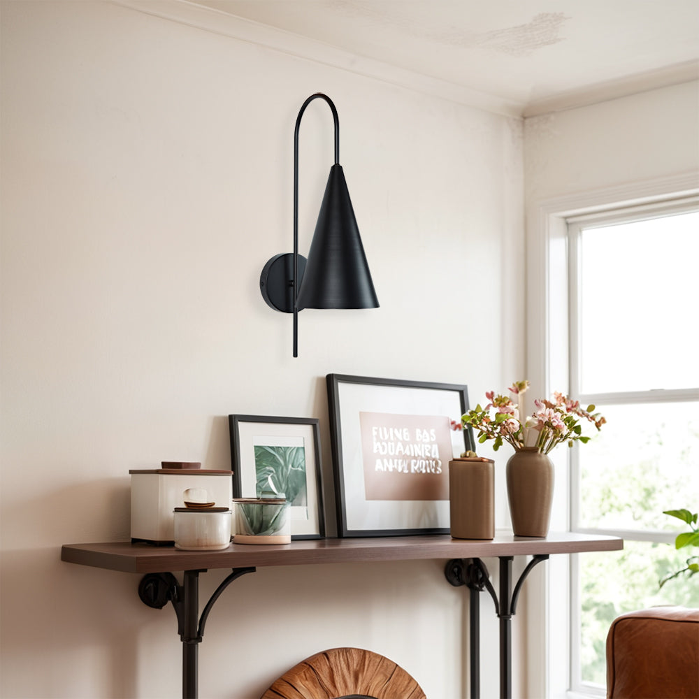 - This piece is perfect for brightening up your space with modern elegance. This exterior wall light doubles as an outdoor wall light, making it perfect for both indoor and outdoor environments. The sconce design adds a cozy ambience to any room, while the sleek arched pole and conical shade create a stylish statement.