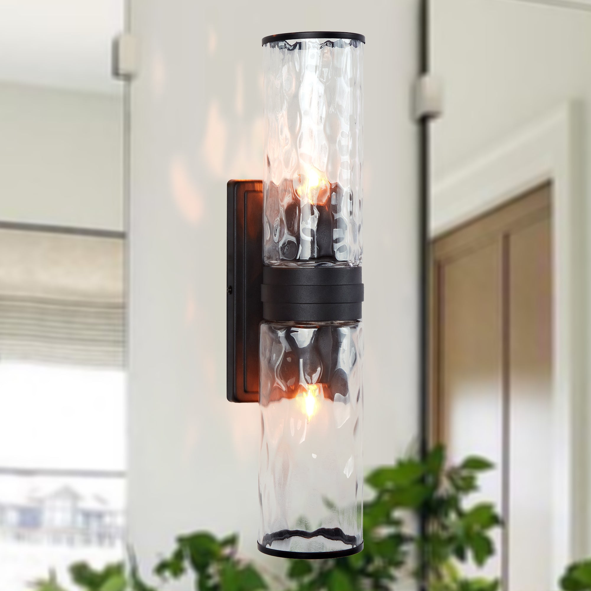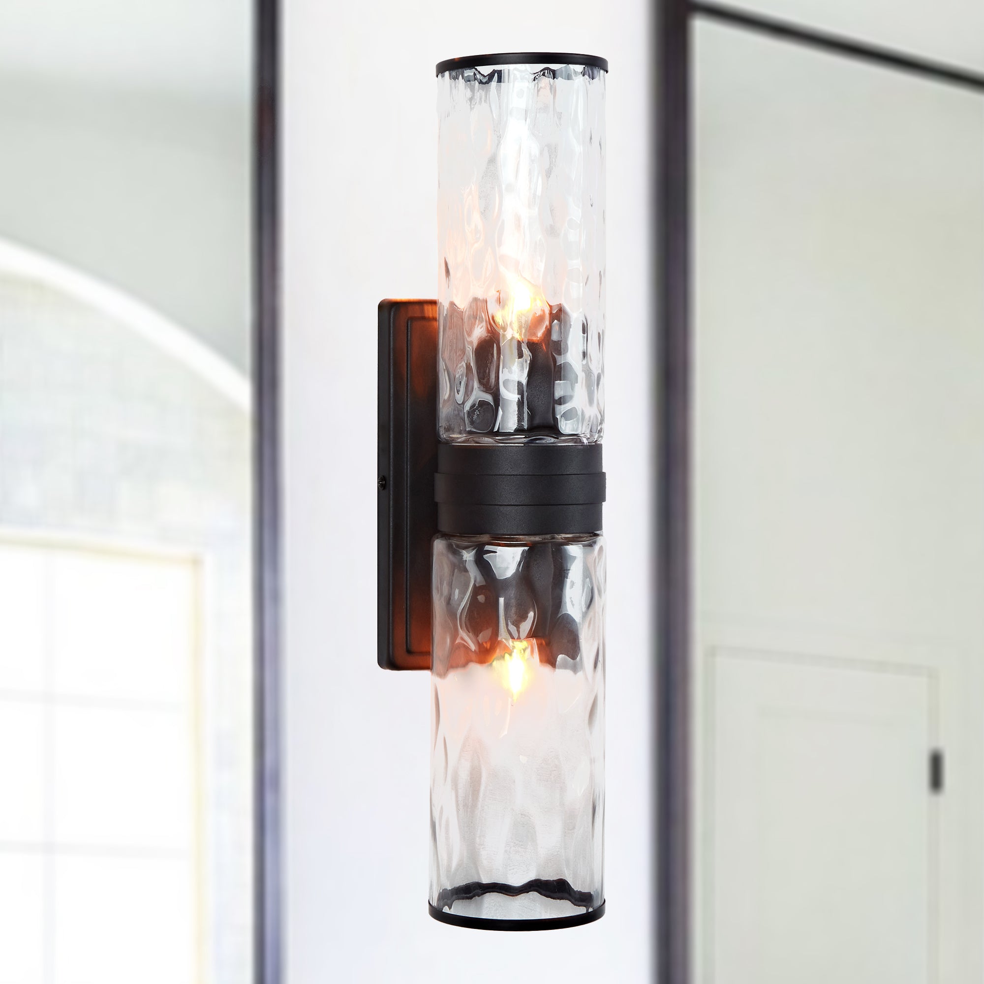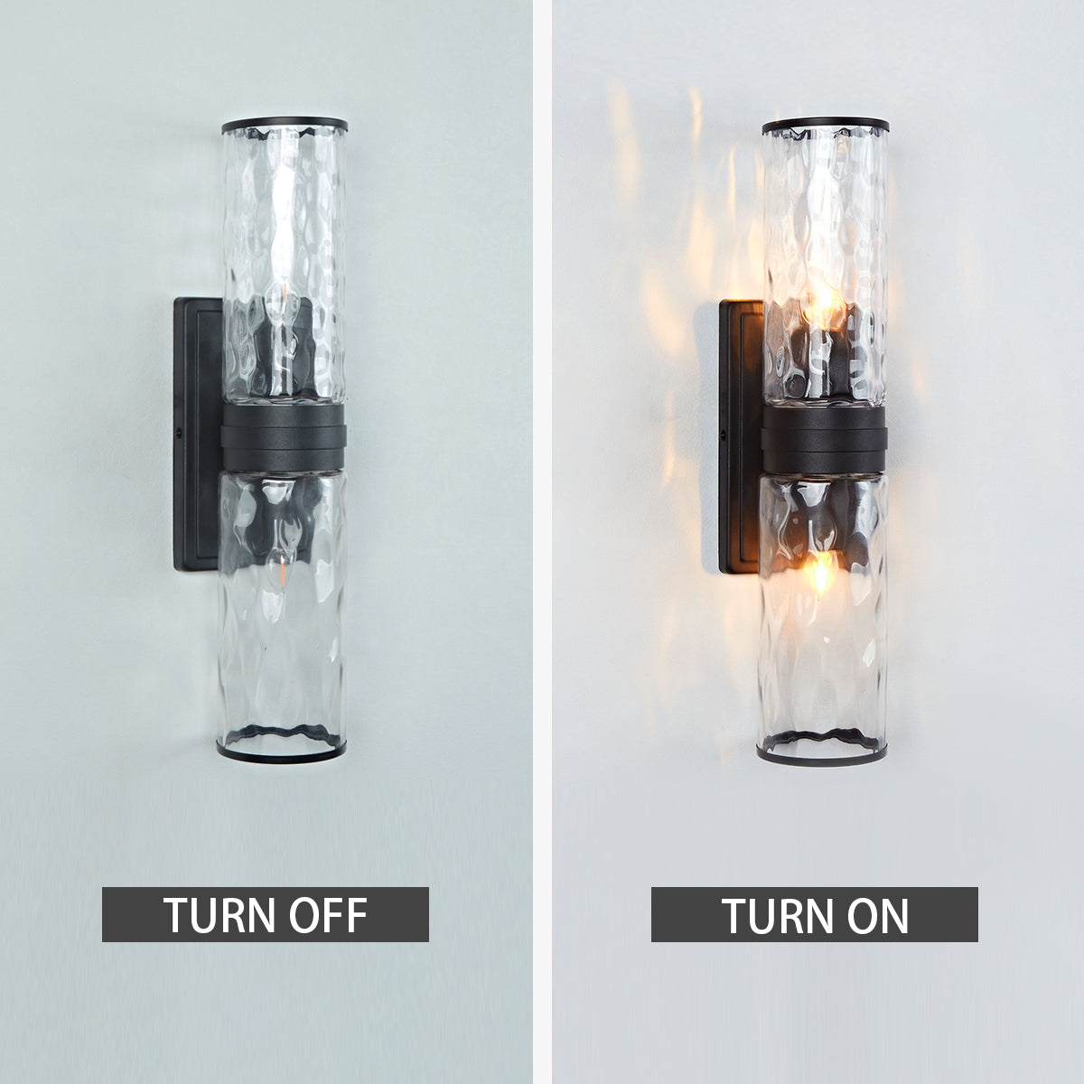 - The combination of hammered glass and candelabra bulbs creates a calming and modern illumination for your bath.