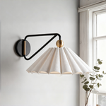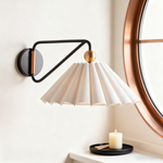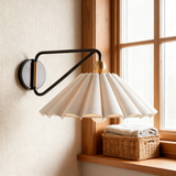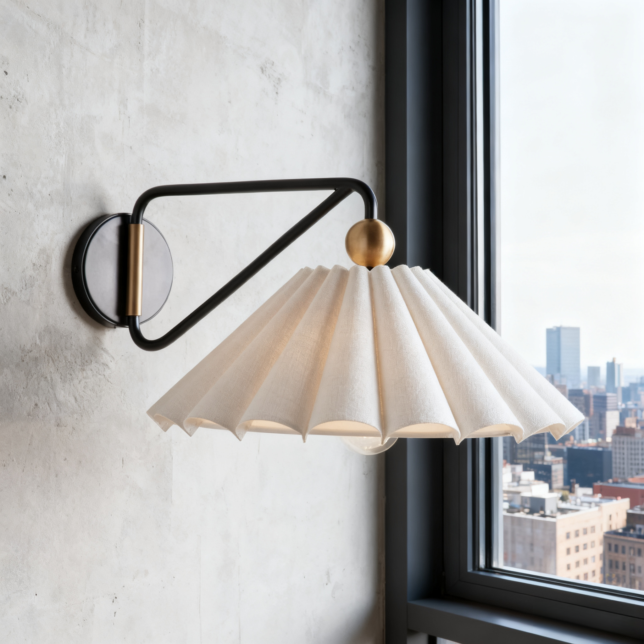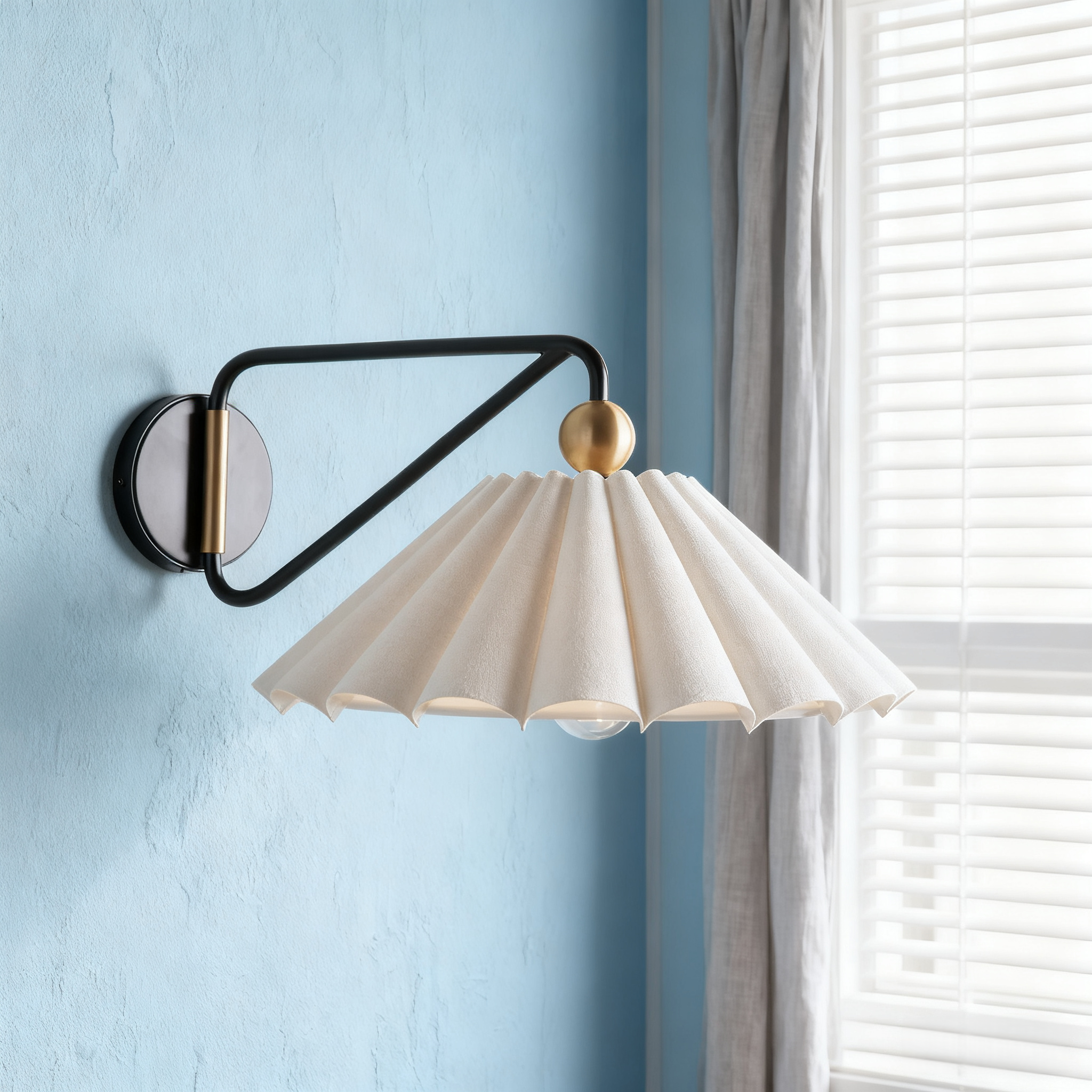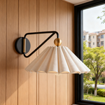 Adjustable Arm Linen Pleated Brass Wall Sconce, 14.75 Inch Vintage Industrial Wall Light Fixture for Bedroom, Home Office, Living Room, Hallway