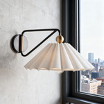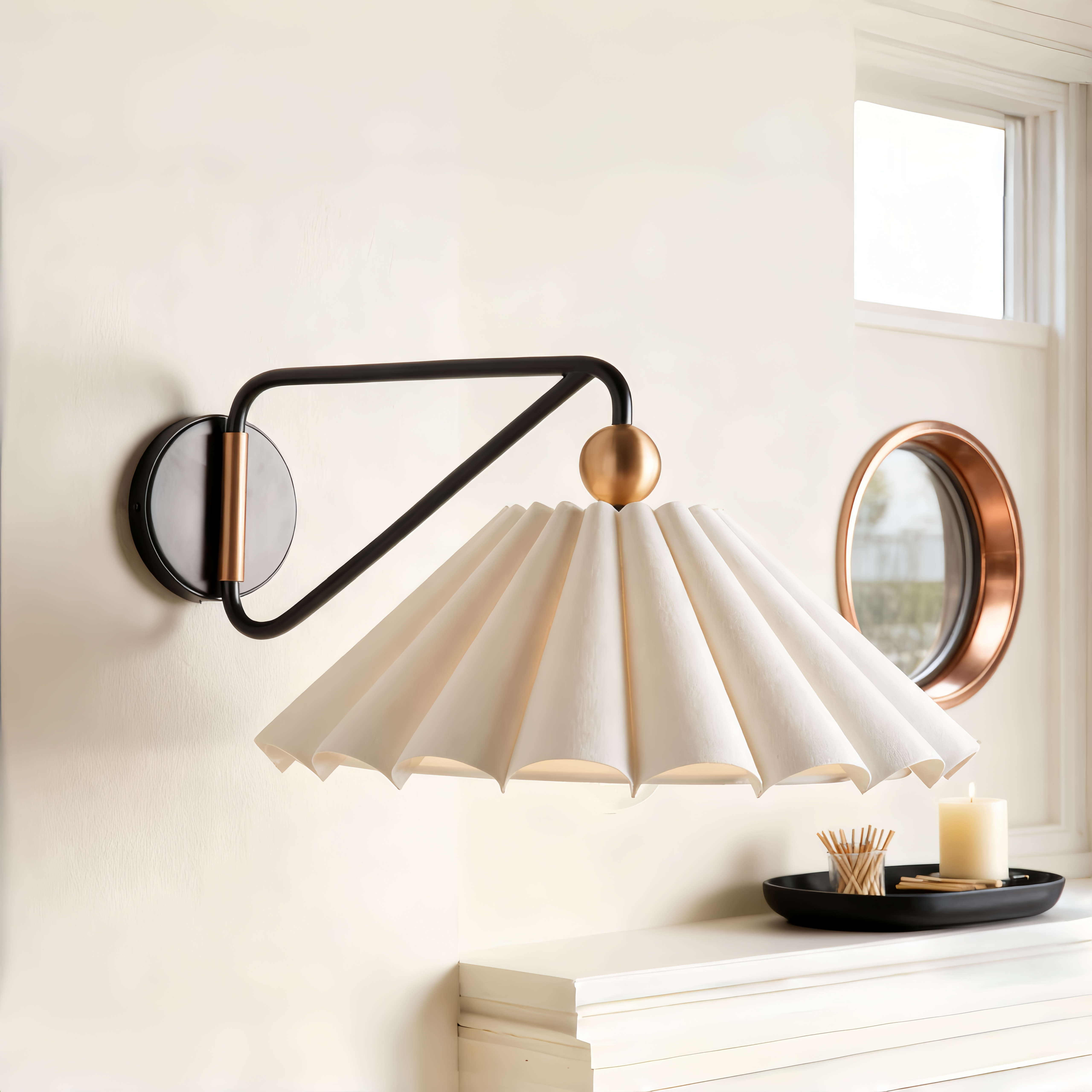 Featuring a two-tone brass finish paired with a beautiful natural linen pleated shade, our Haylen Wall Sconce conveniently filling your space with a relaxing glow.
