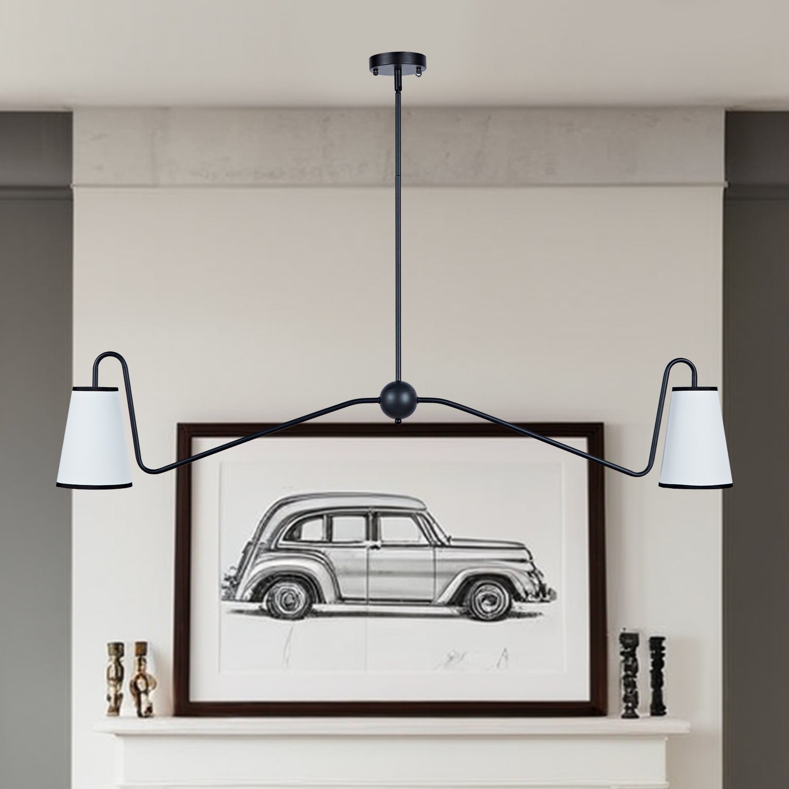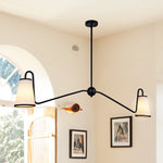 - Crafted with a steel frame and white linen shades, this chandelier is built to last. You can adjust the hanging height to suit your space and it comes with multiple metal rods for customization.