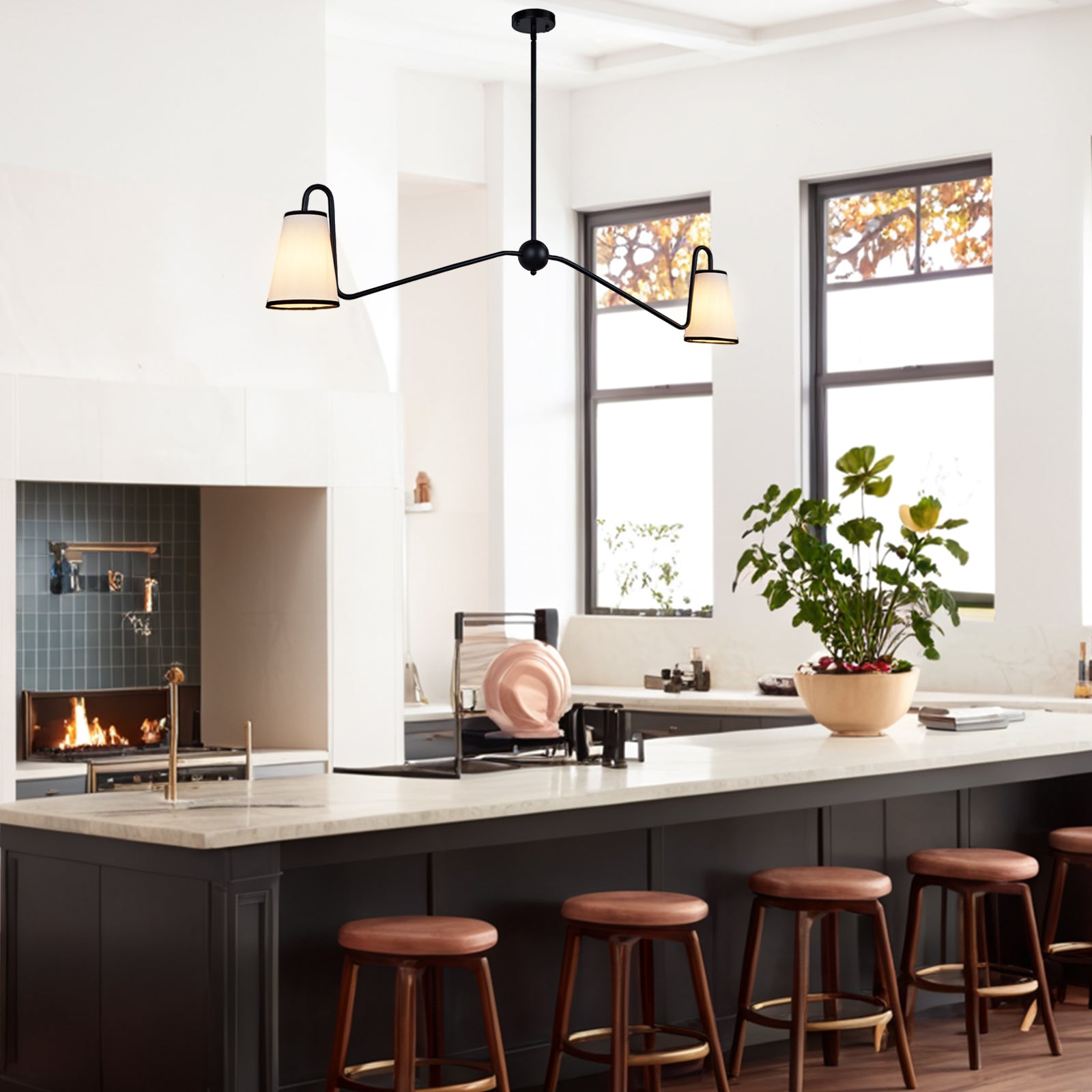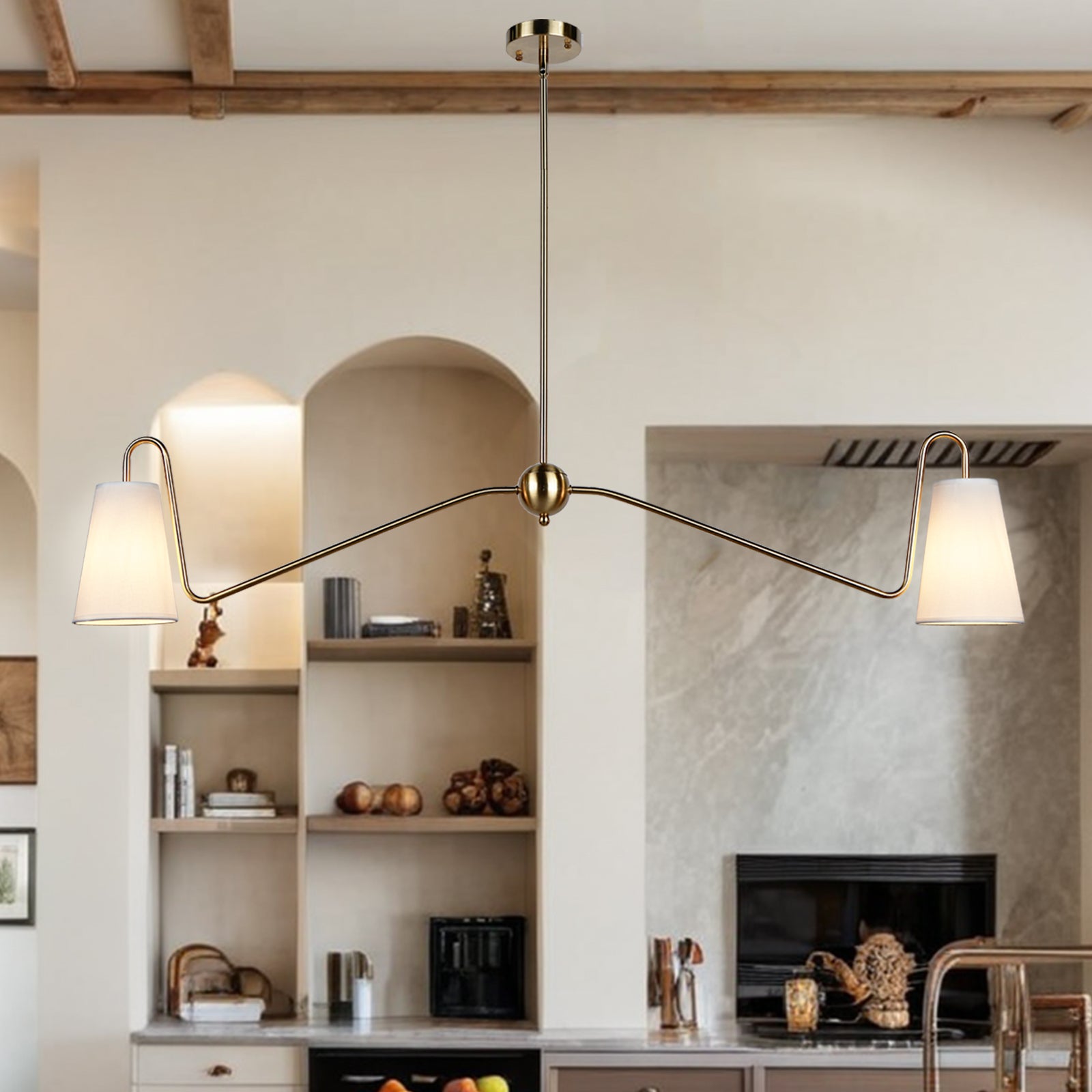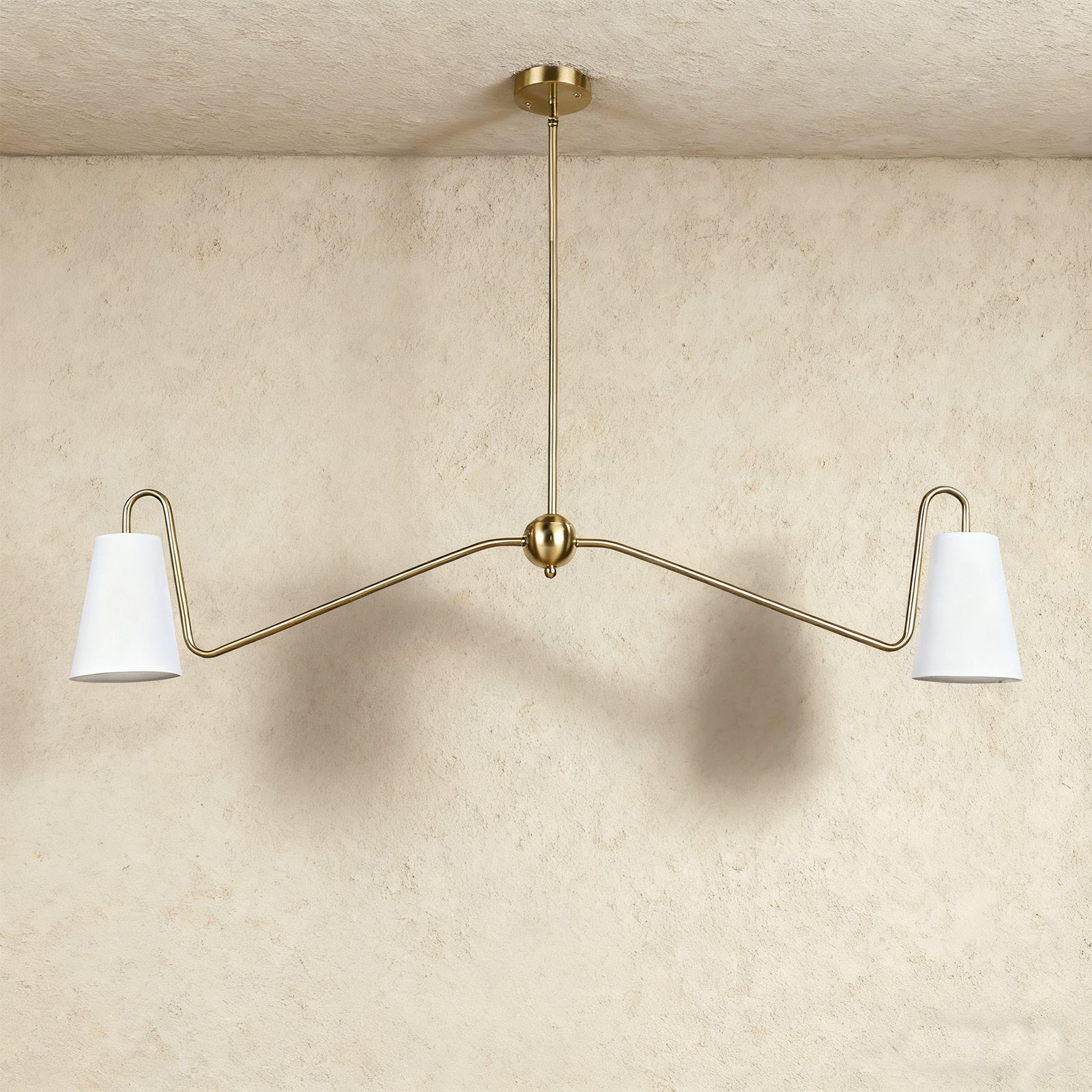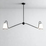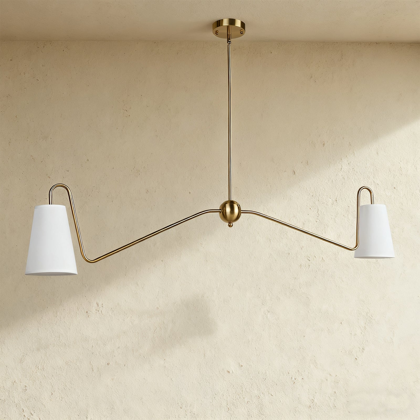 - In a minimal elegant design, our Jonas Linear Chandelier has subtly curved arms in two striking finishes. Its narrow linen shades complement the modern frame and illuminate your space with its sleek angled construction.