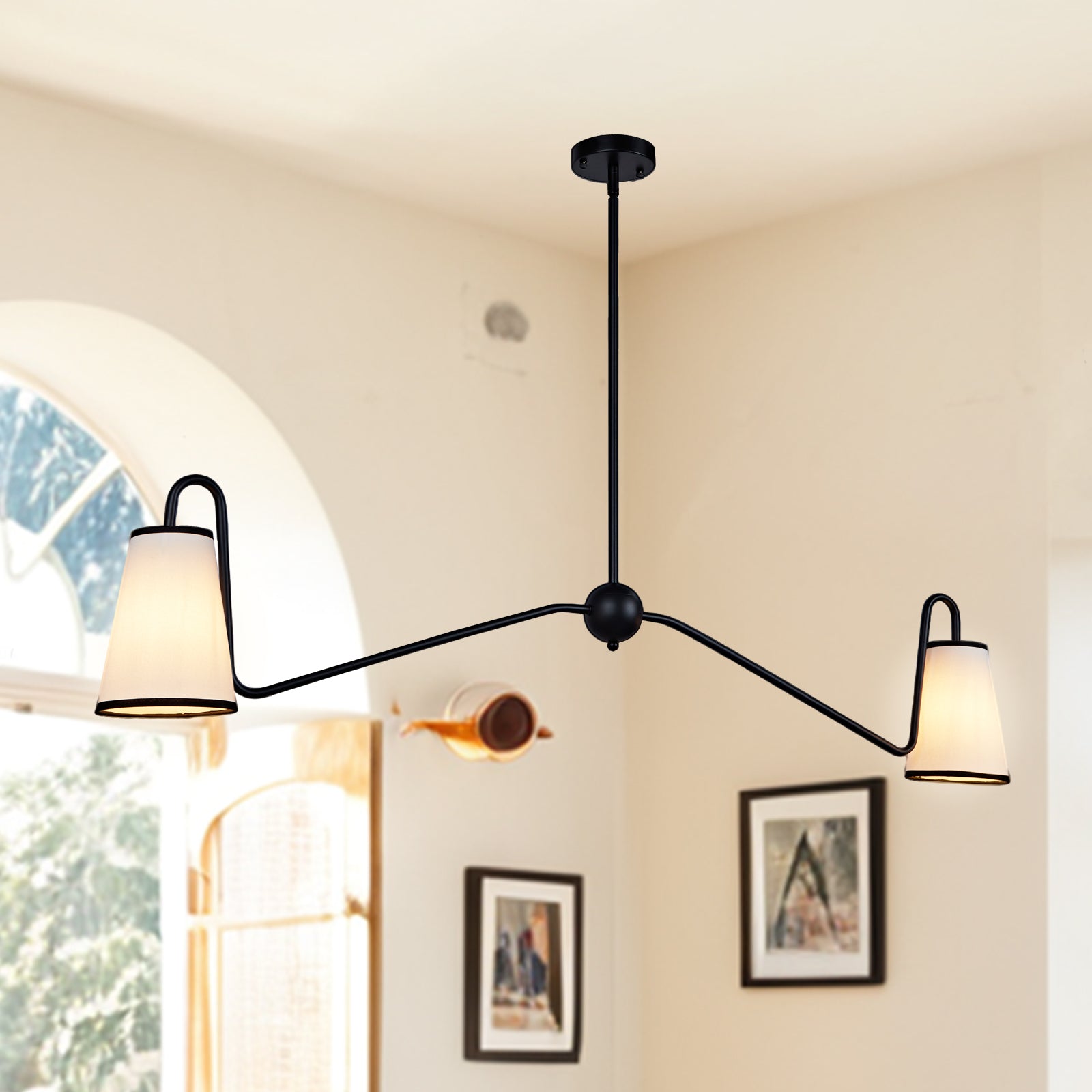 - Introducing our stunning Linen Chandelier, a versatile lighting fixture perfect for your dining room, bedroom, or living room. This chandelier features a modern and angular design with tapered linen shades that add a touch of sophistication to any space.