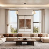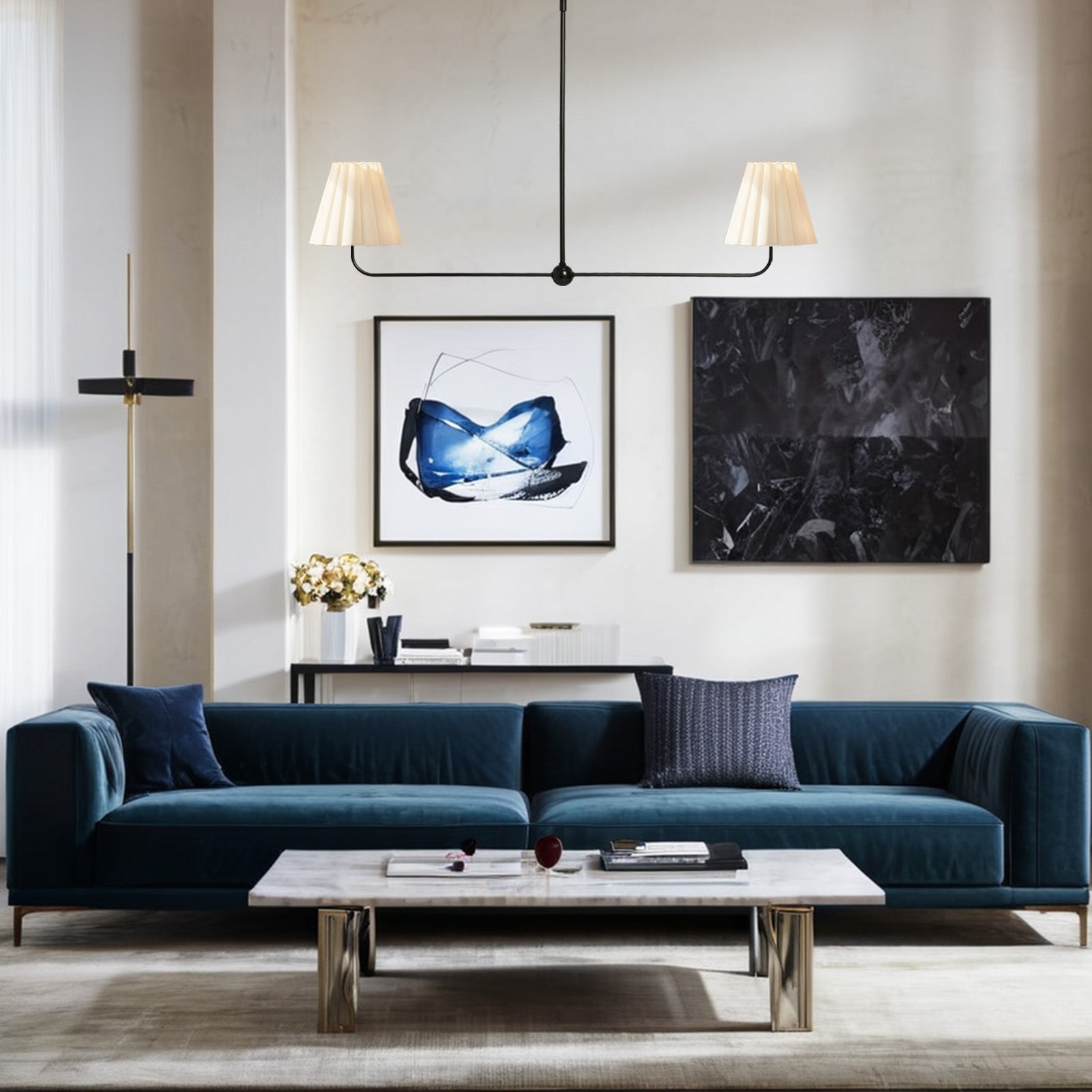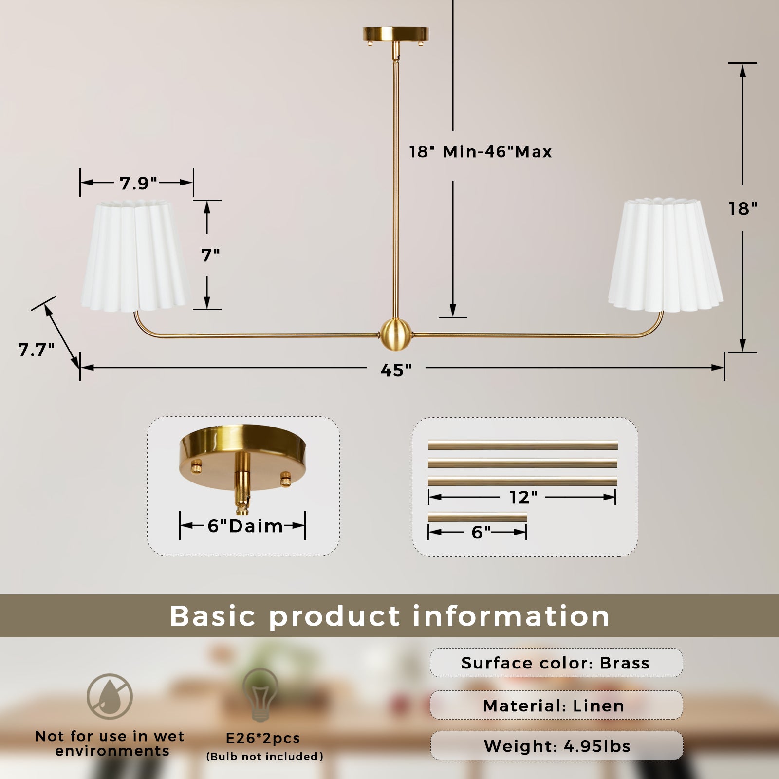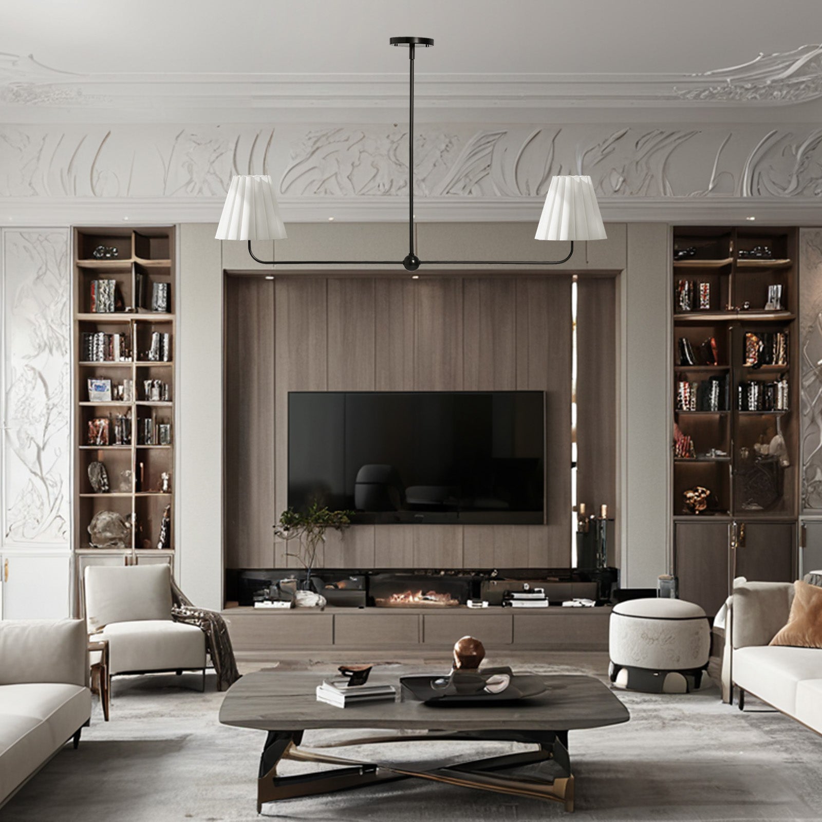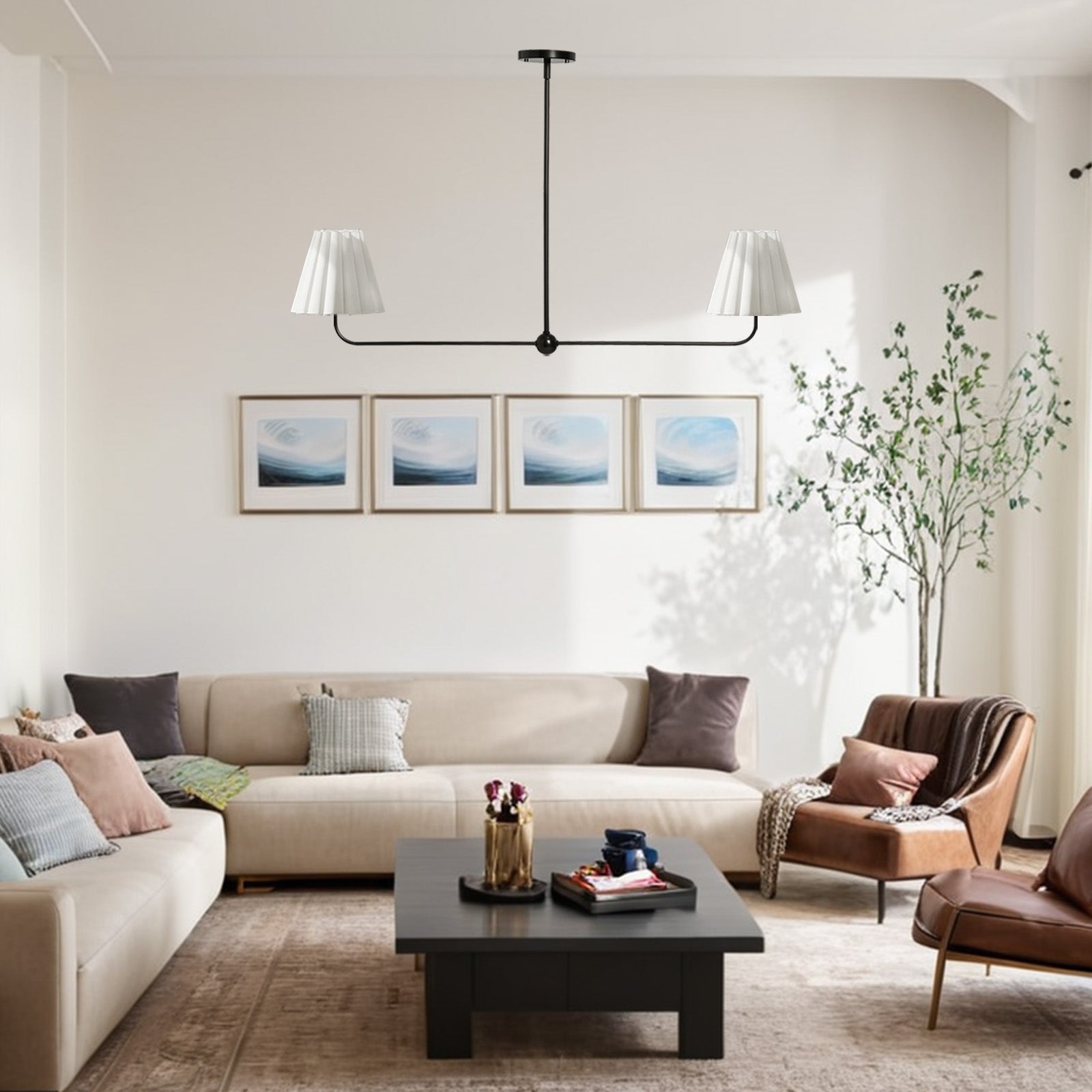 Kitchen Island Lighting with Pleated Linen Shade, 2 Lights Linear Chandelier with Adjustable Height (18-46"), Modern Ceiling Hanging Pendant Light for Dining Room, Living Room, Bedroom