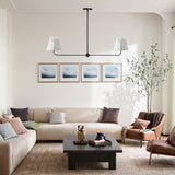 - Crafted with a steel frame and white linen shades, this chandelier is built to last. You can adjust the hanging height to suit your space and it comes with multiple metal rods for customization.