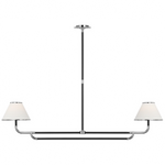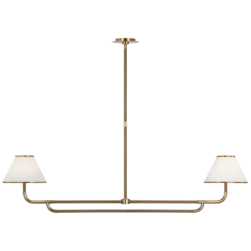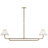 - With a modern silhouette, the Rigby Linear Chandelier brings simplicity to your decor with a unique mix of materials. The white linen fabric shades are accented by wood arms that contrast the metal structure in two bold finishes.