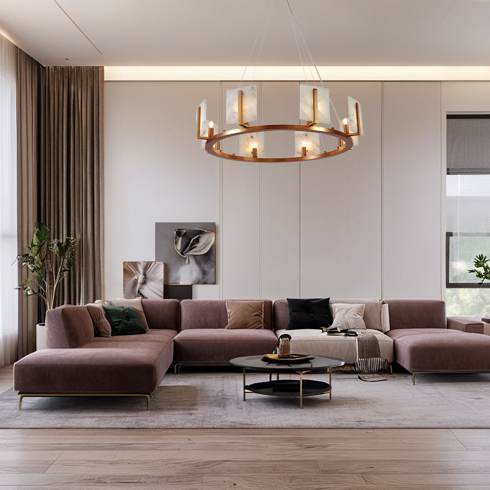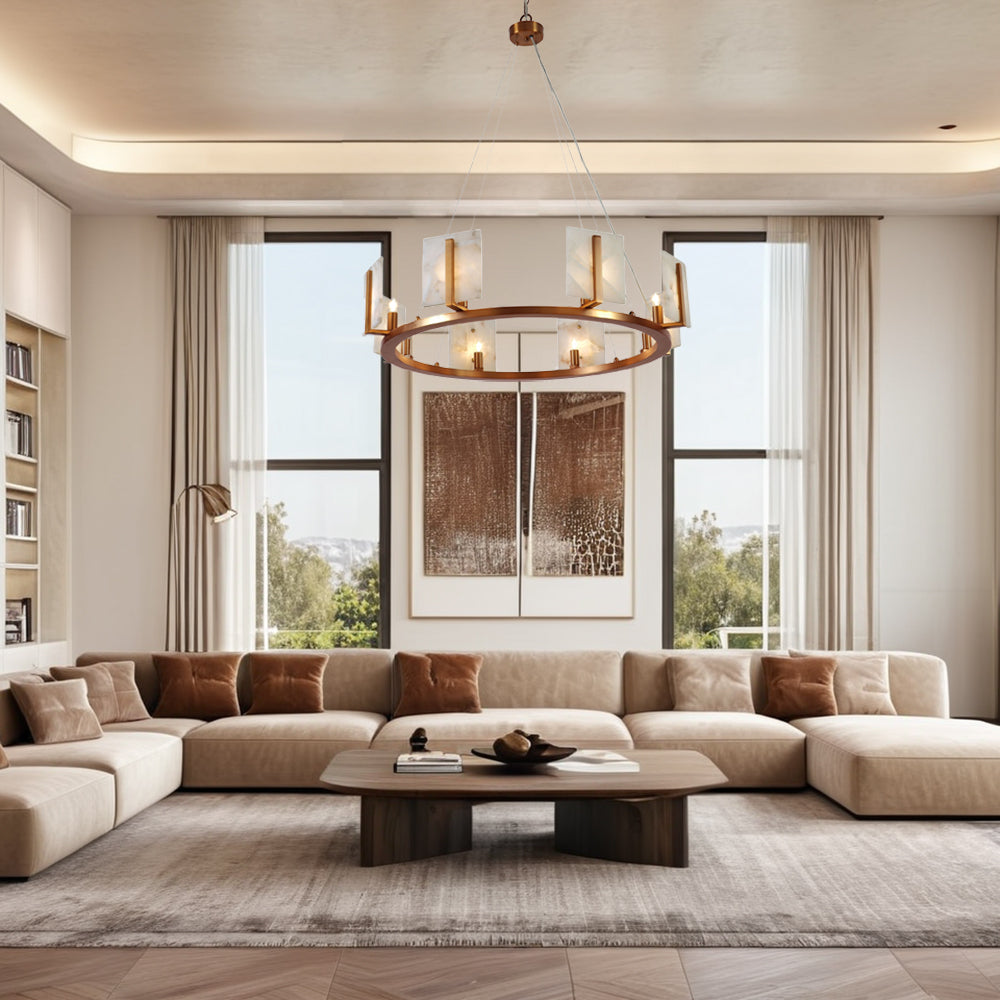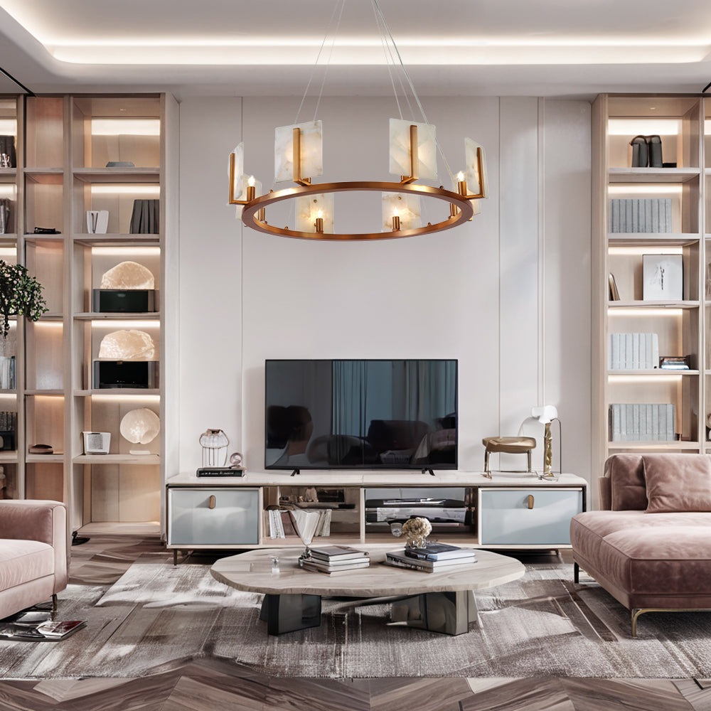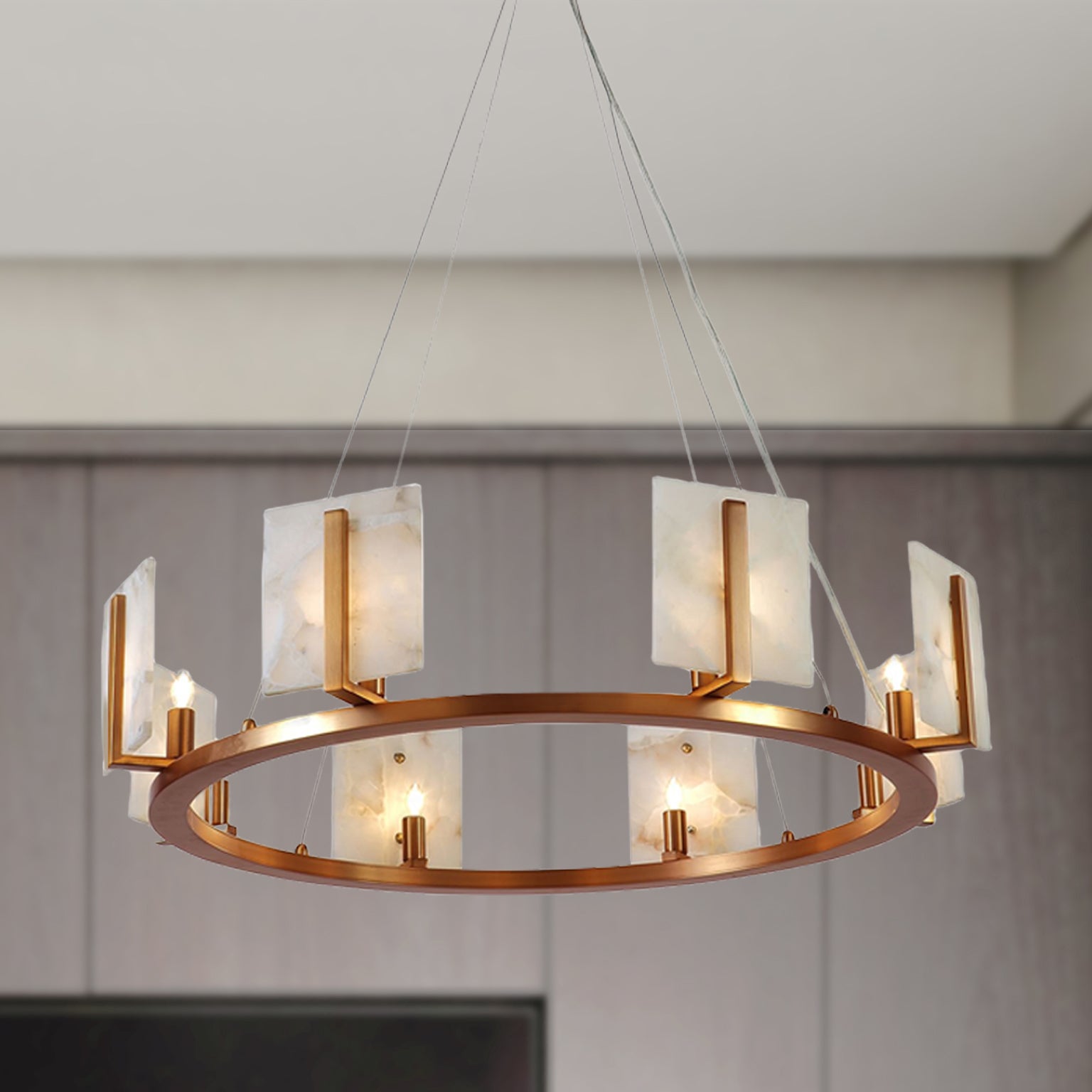 - Elevate your space with our stunning Alabaster Round Chandelier, the perfect addition to any living room! This modern chandelier features a beautiful blend of organic materials and sleek design, with a minimalist brass ring and angular arms that showcase elegant square alabaster panels. It creates a warm, glowing halo of light that adds instant ambiance to your home.