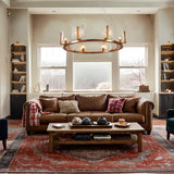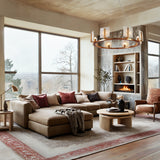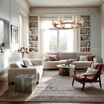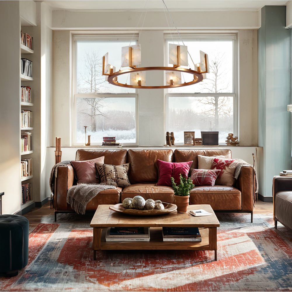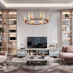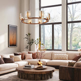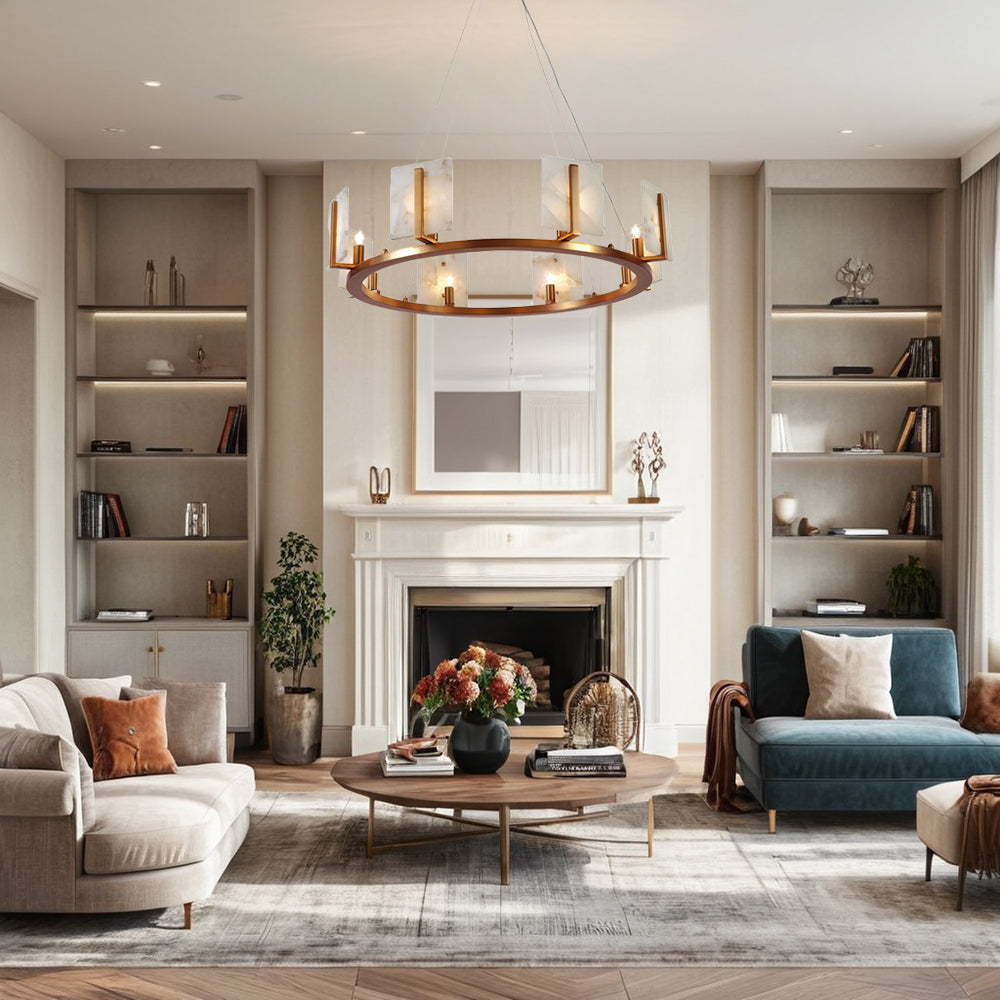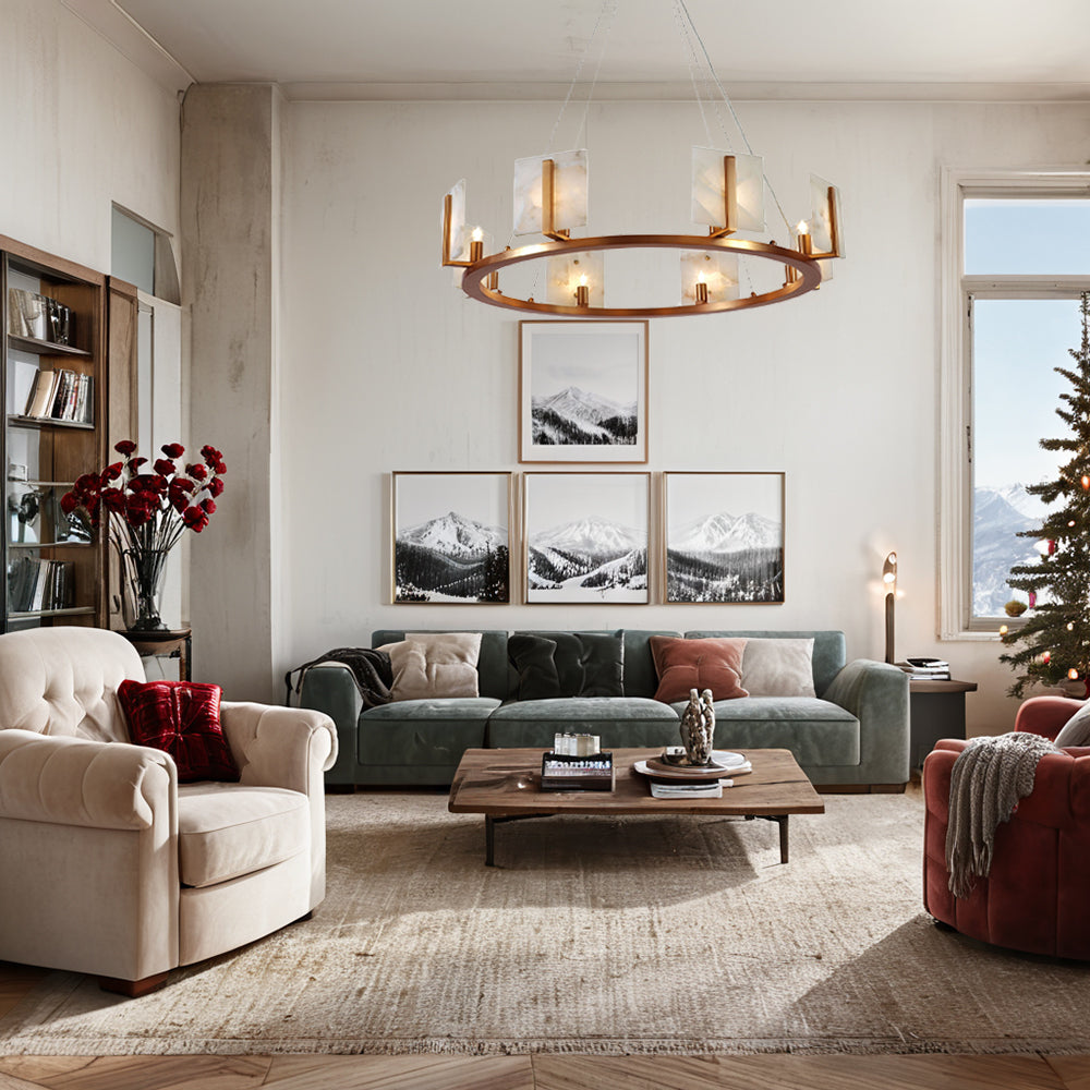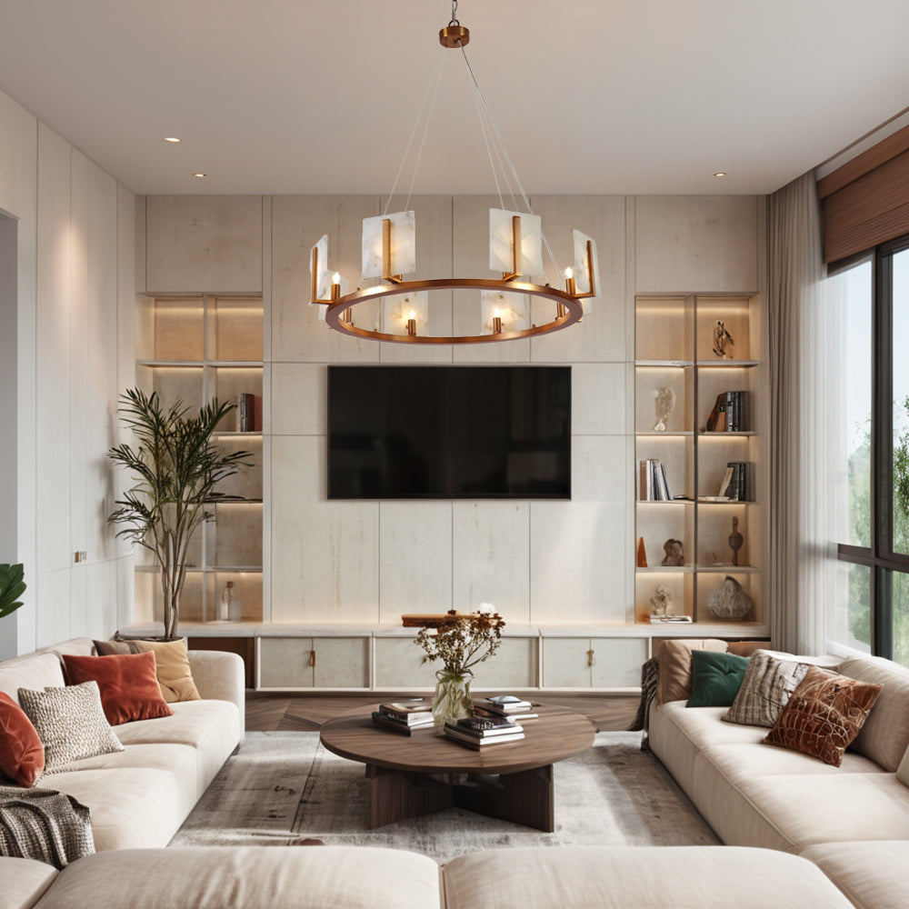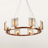 - Elevate your space with our stunning Alabaster Round Chandelier, the perfect addition to any living room! This modern chandelier features a beautiful blend of organic materials and sleek design, with a minimalist brass ring and angular arms that showcase elegant square alabaster panels. It creates a warm, glowing halo of light that adds instant ambiance to your home.