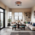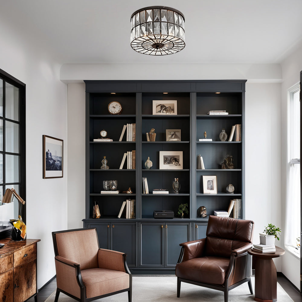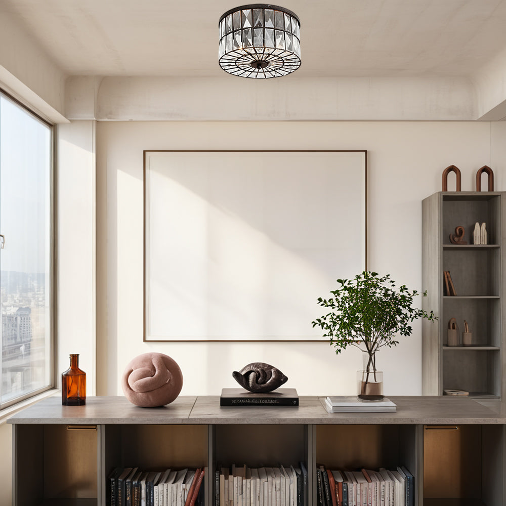 - With its shimmering glass crystals, this flush mount creates a captivating play of light, making it an exquisite option for sitting room ceiling lights. Its modern design with clean, symmetrical lines makes it a fantastic addition to your living room flush mount collection, adding sophistication and charm to your space.