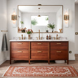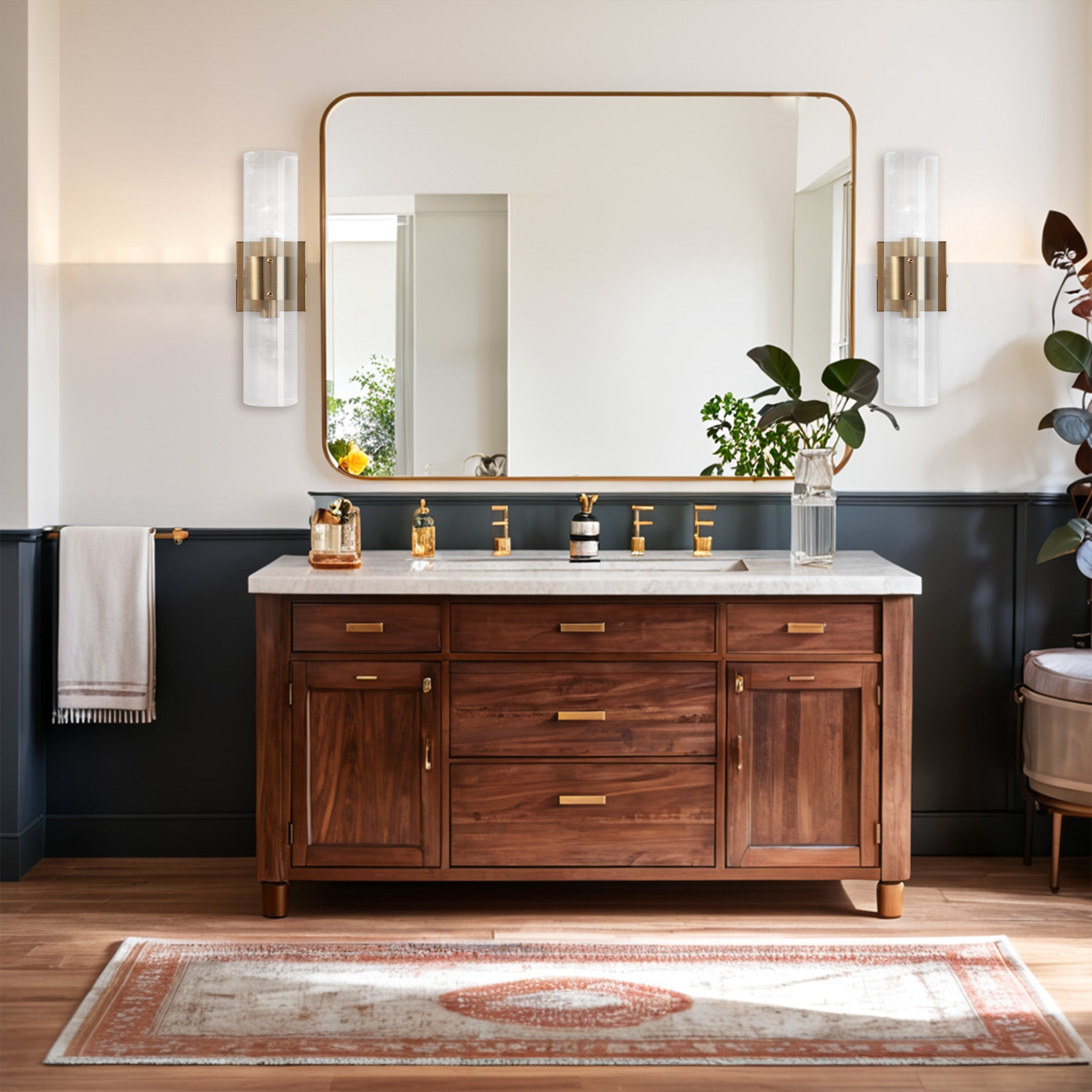- This double sconce provides a warm glow that creates a relaxing ambiance in your bath or bedroom. Whether you’re getting ready in the morning or winding down in the evening, these bath sconces bring a cozy feel while completely transforming your decor.