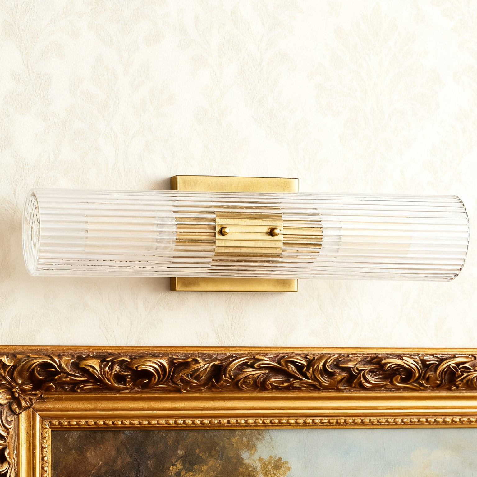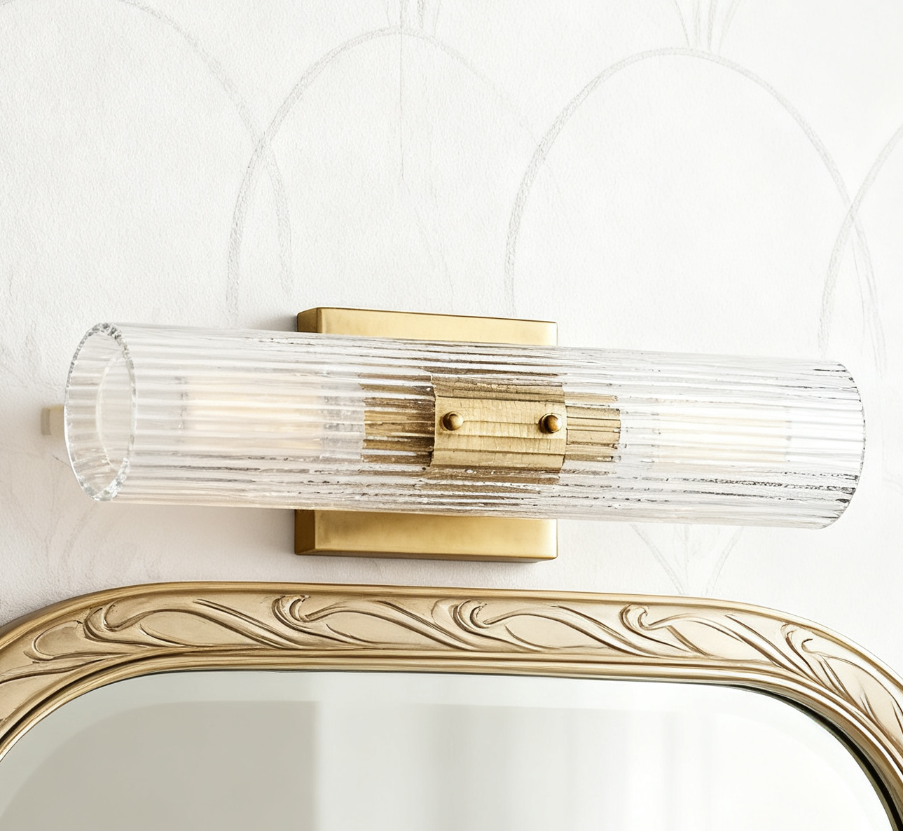 - A modern take on classic Art Deco style, our Soleil sconce adorns walls with sparkling glass and gleaming brass. A square wall plate with a burnished brass finish supports a slender tube of clear fluted glass. The narrow ribbing filters the light from a bulb at both ends in a fascinating fashion, and the shade can be arranged vertically or horizontally to suit your space. The two-light Soleil sconce sparkles lining a hallway or flanking a painting or medicine cabinet.