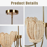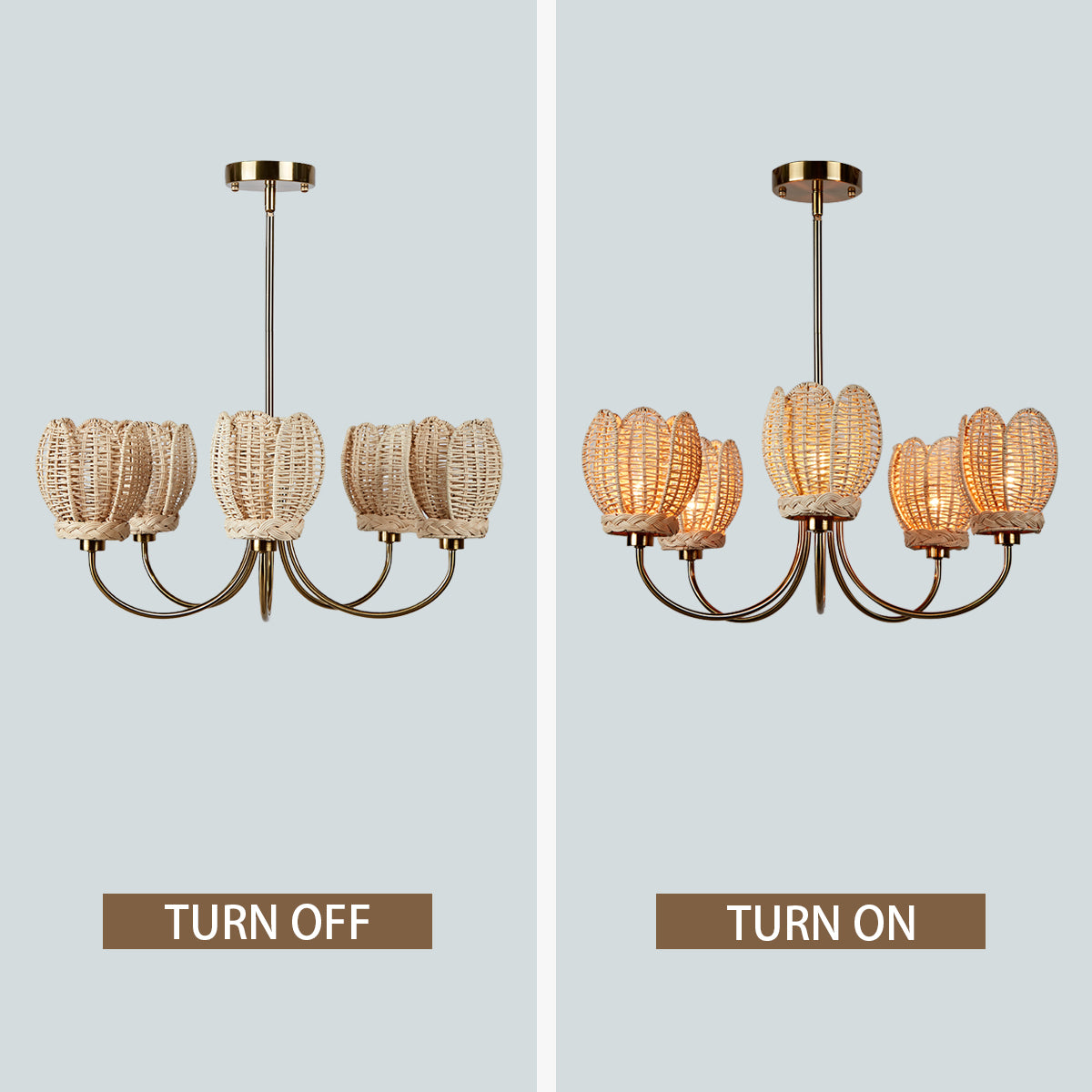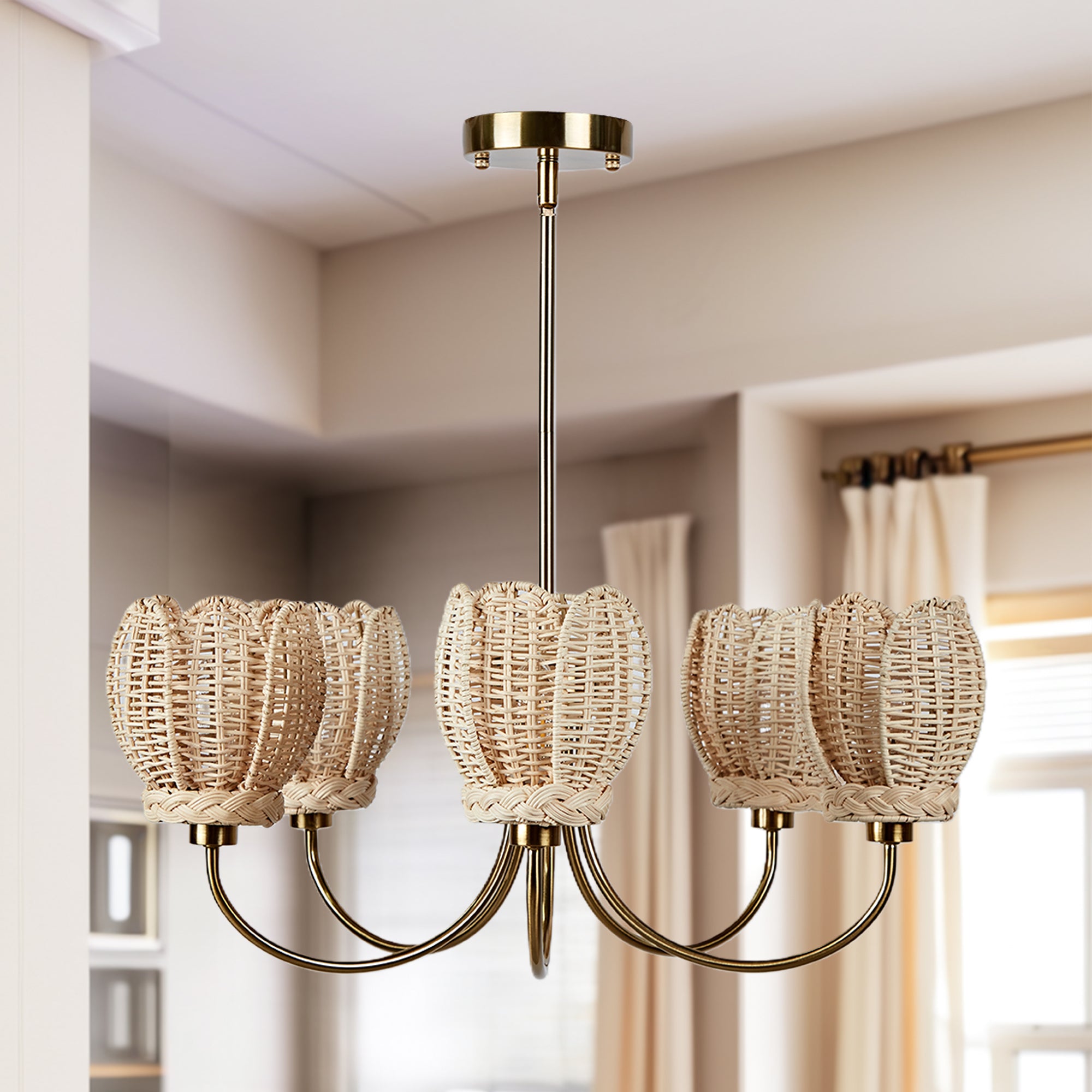 - Natural wicker shapes blossom like petals with our chandelier. Suspended from a slender frame and finished by hand in burnished brass, four tulip-style shades are balanced on curving rods.