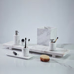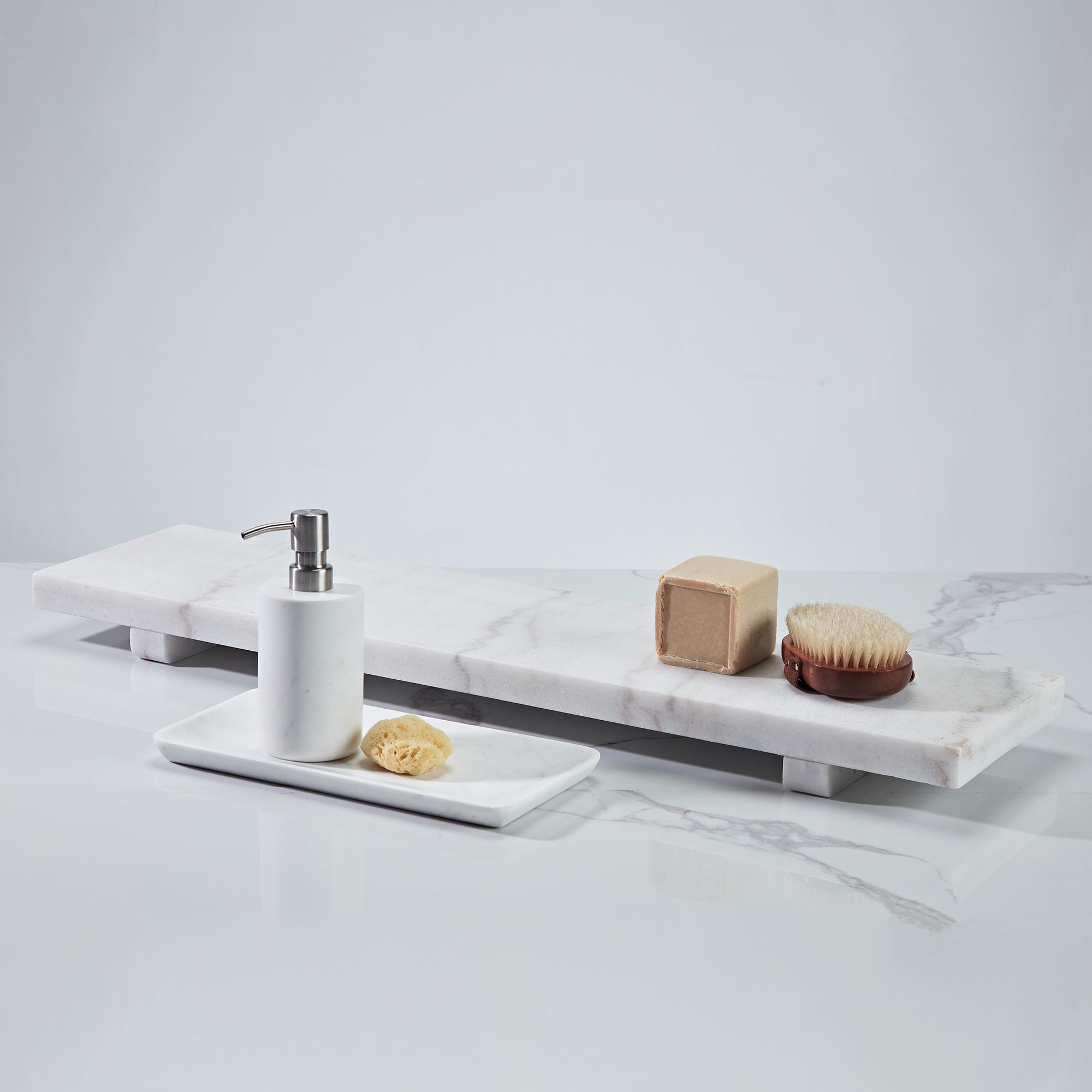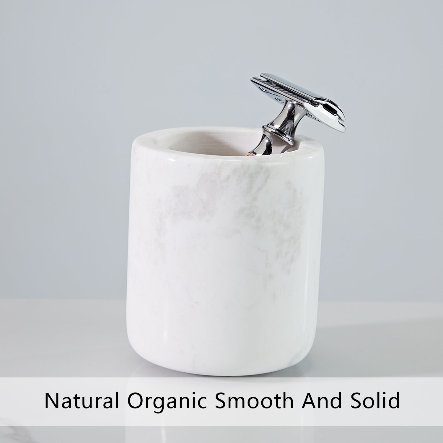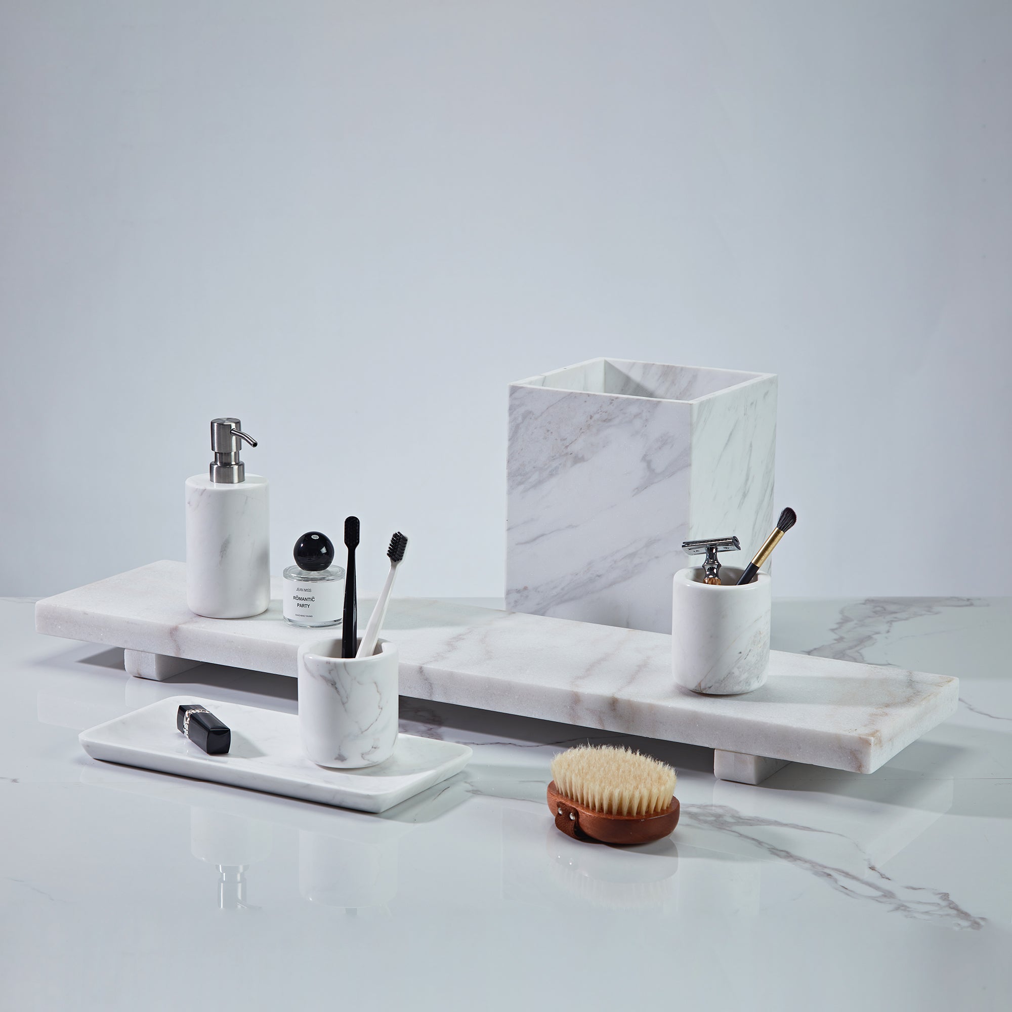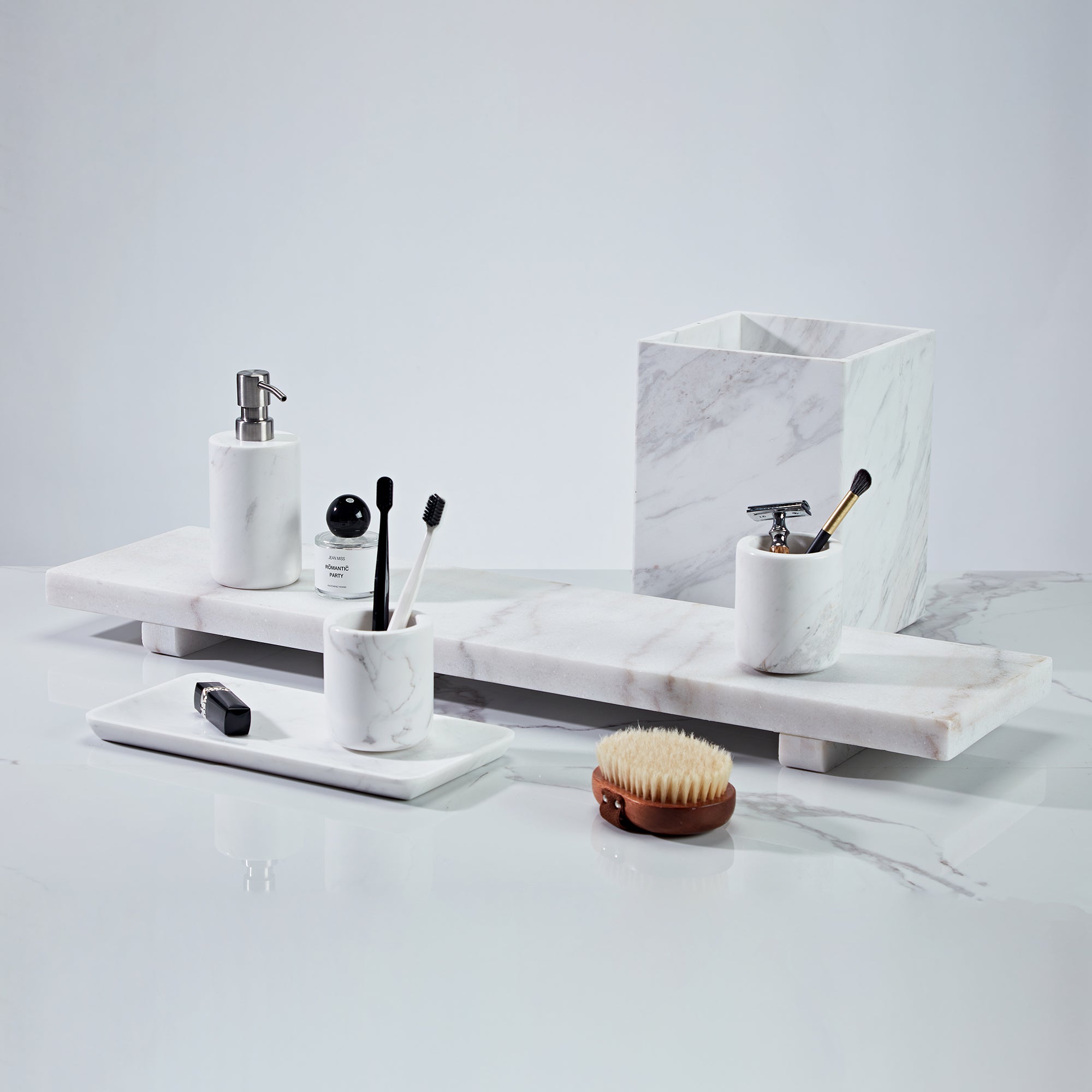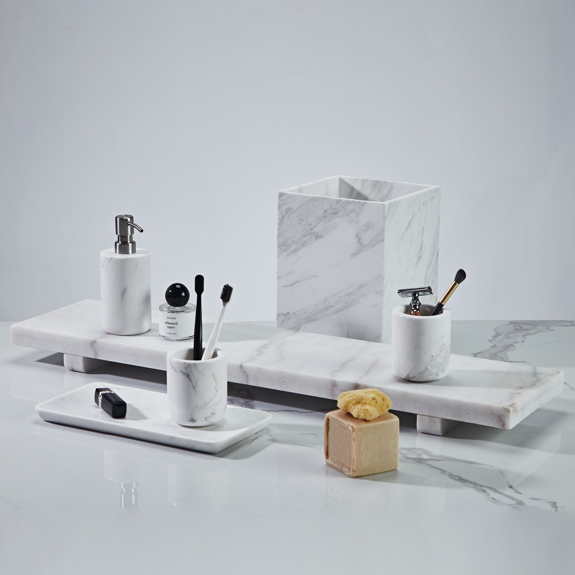 - The solid marble construction ensures durability, while the sleek, polished finish adds a contemporary edge to the classic material. Enhance your daily routine with the refined aesthetics and functional beauty of the White Marble Bath Accessories.