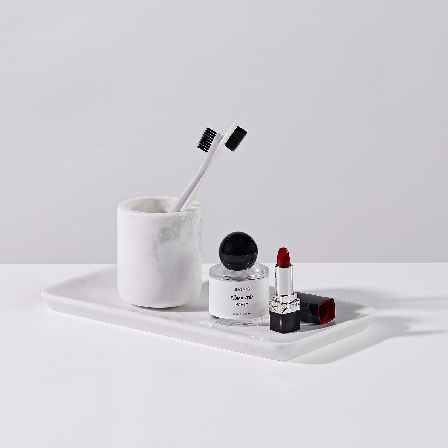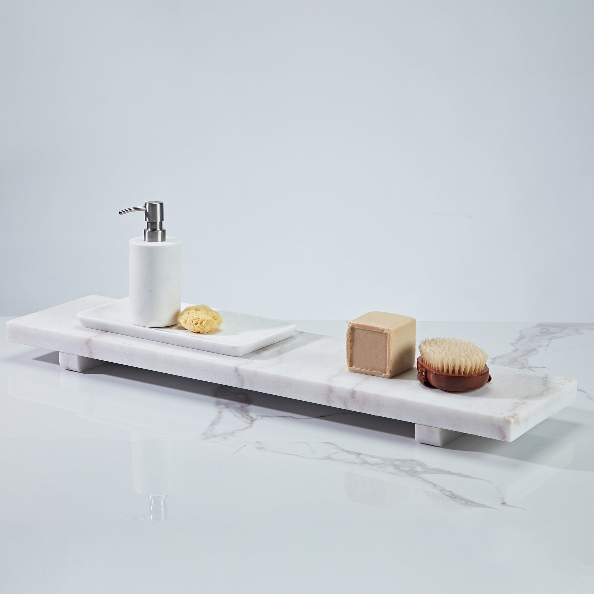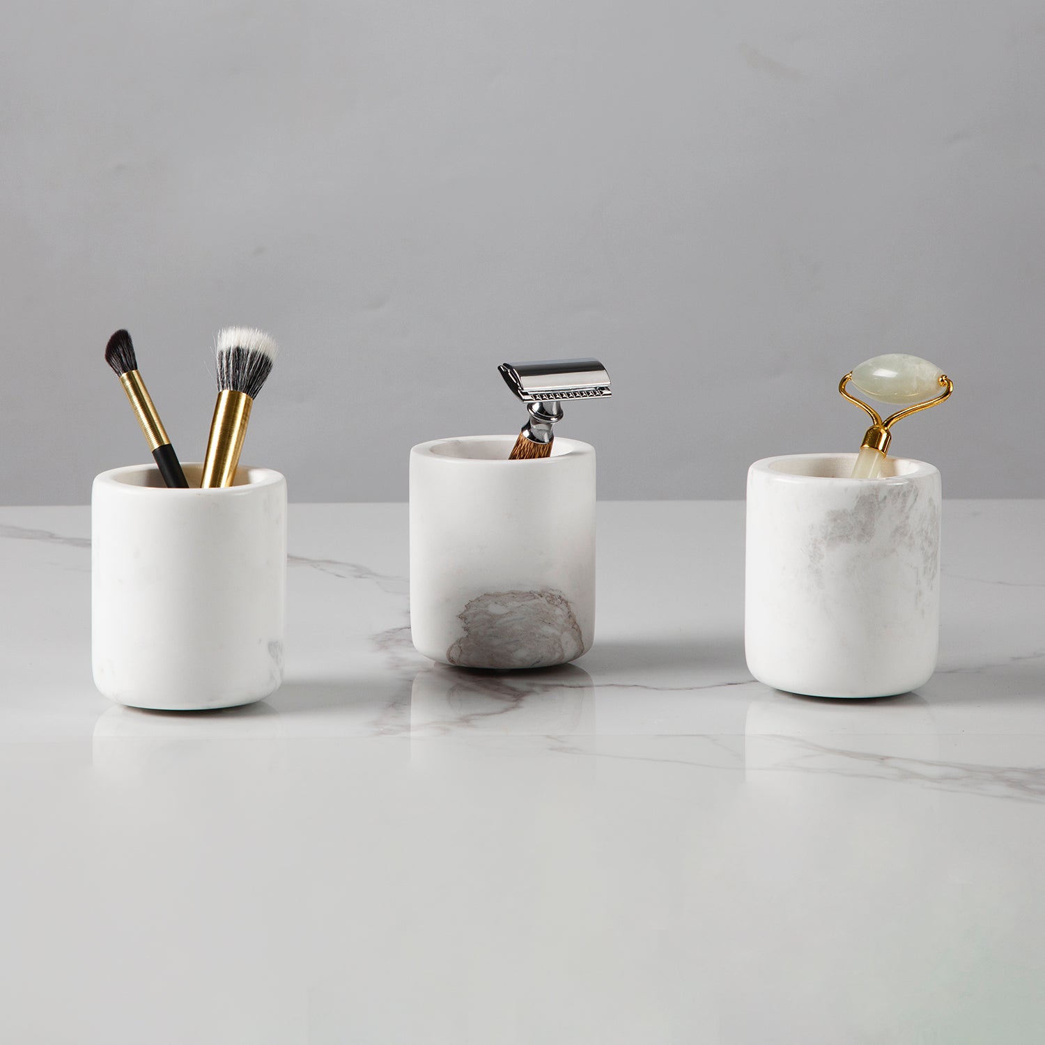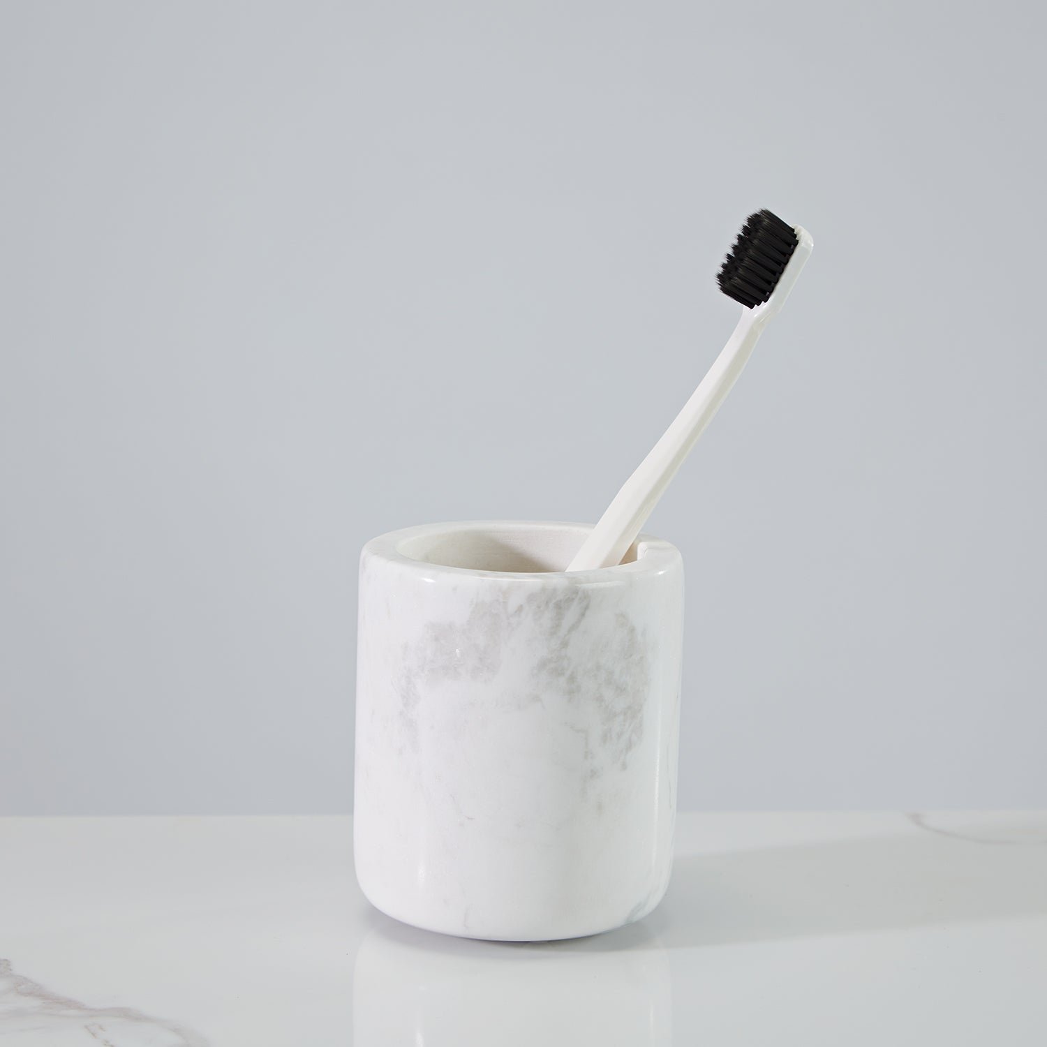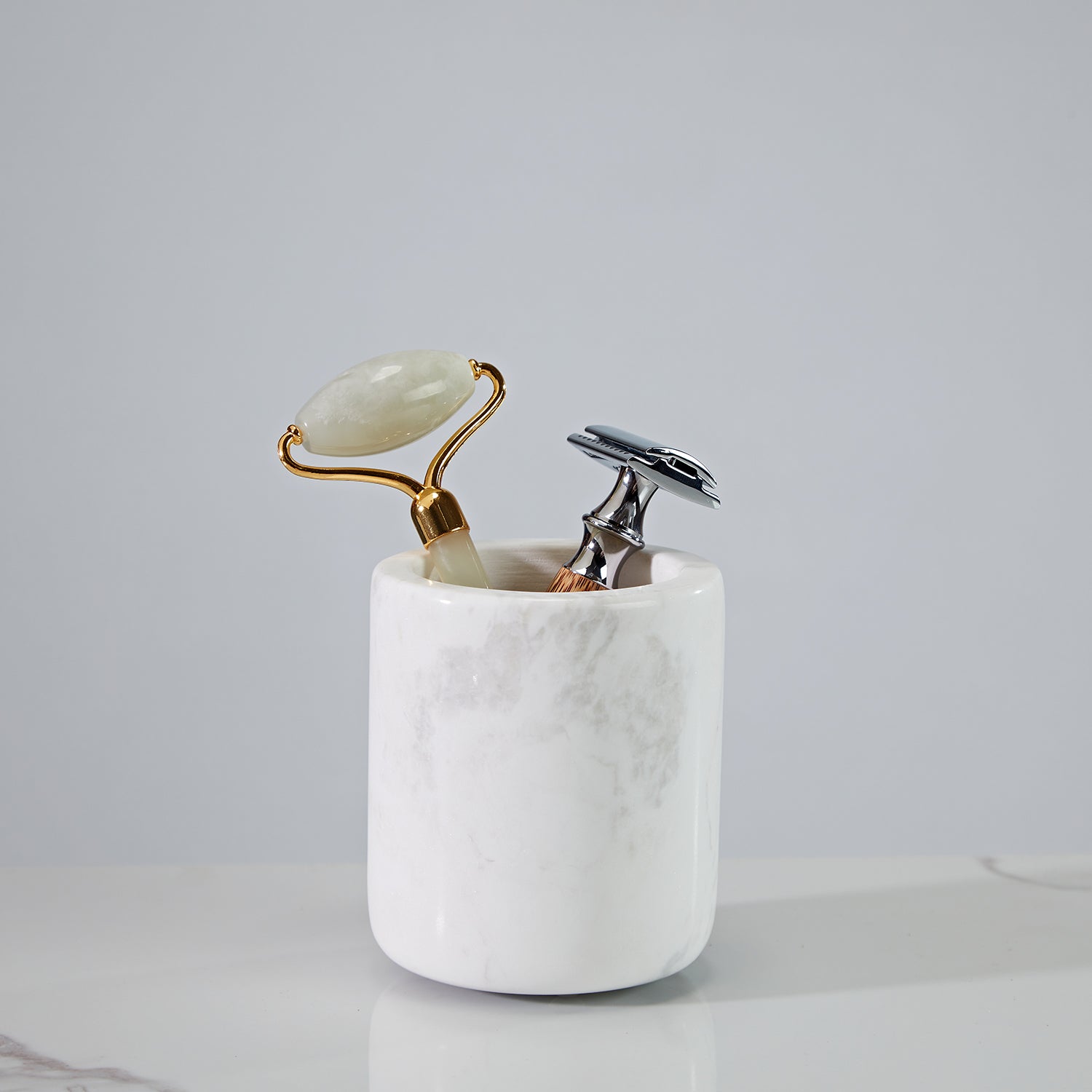 - The solid marble construction ensures durability, while the sleek, polished finish adds a contemporary edge to the classic material. Enhance your daily routine with the refined aesthetics and functional beauty of the White Marble Bath Accessories.