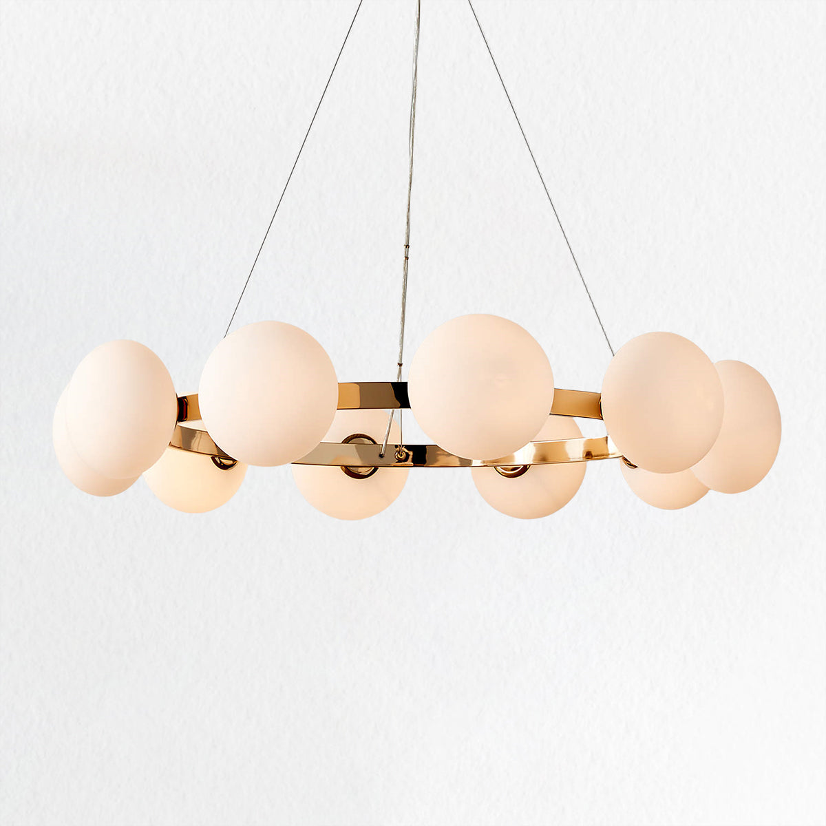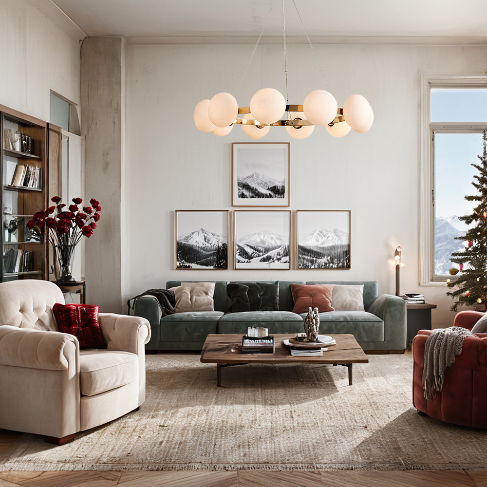 - Adorned with ten opulent glass globes that delicately diffuse light, this piece adds a touch of modern sophistication to your home decor.