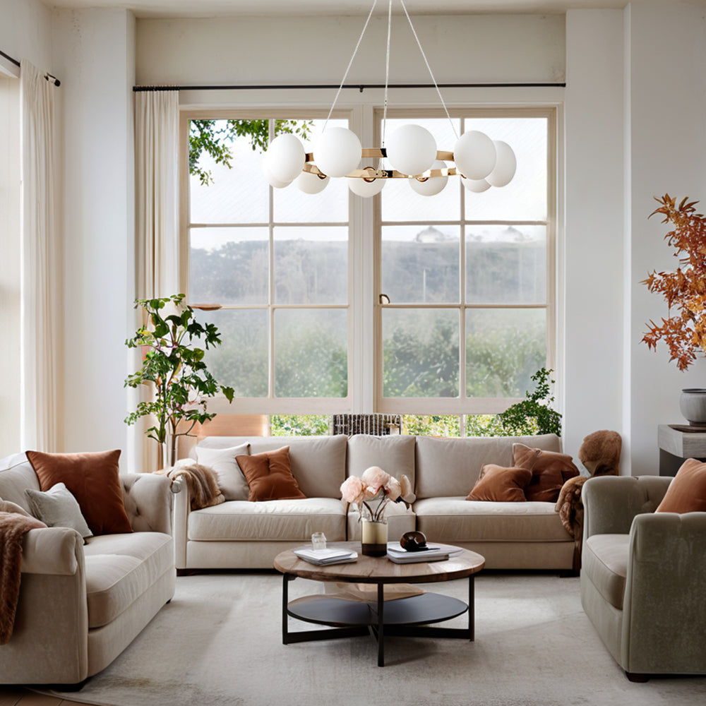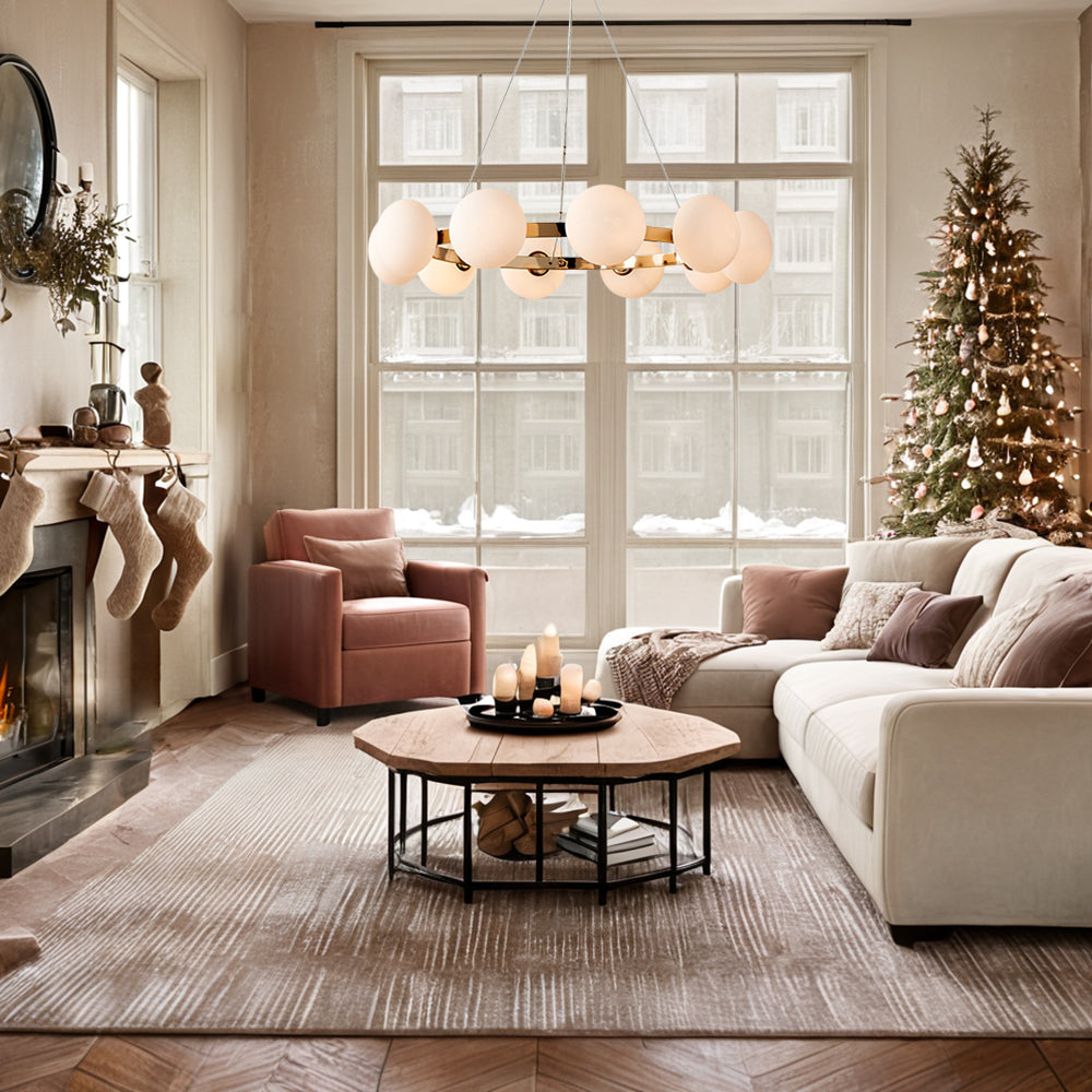 - Transform your living room into a cozy haven with our exquisite Modern Glass Round Polished Champagne Chandelier.