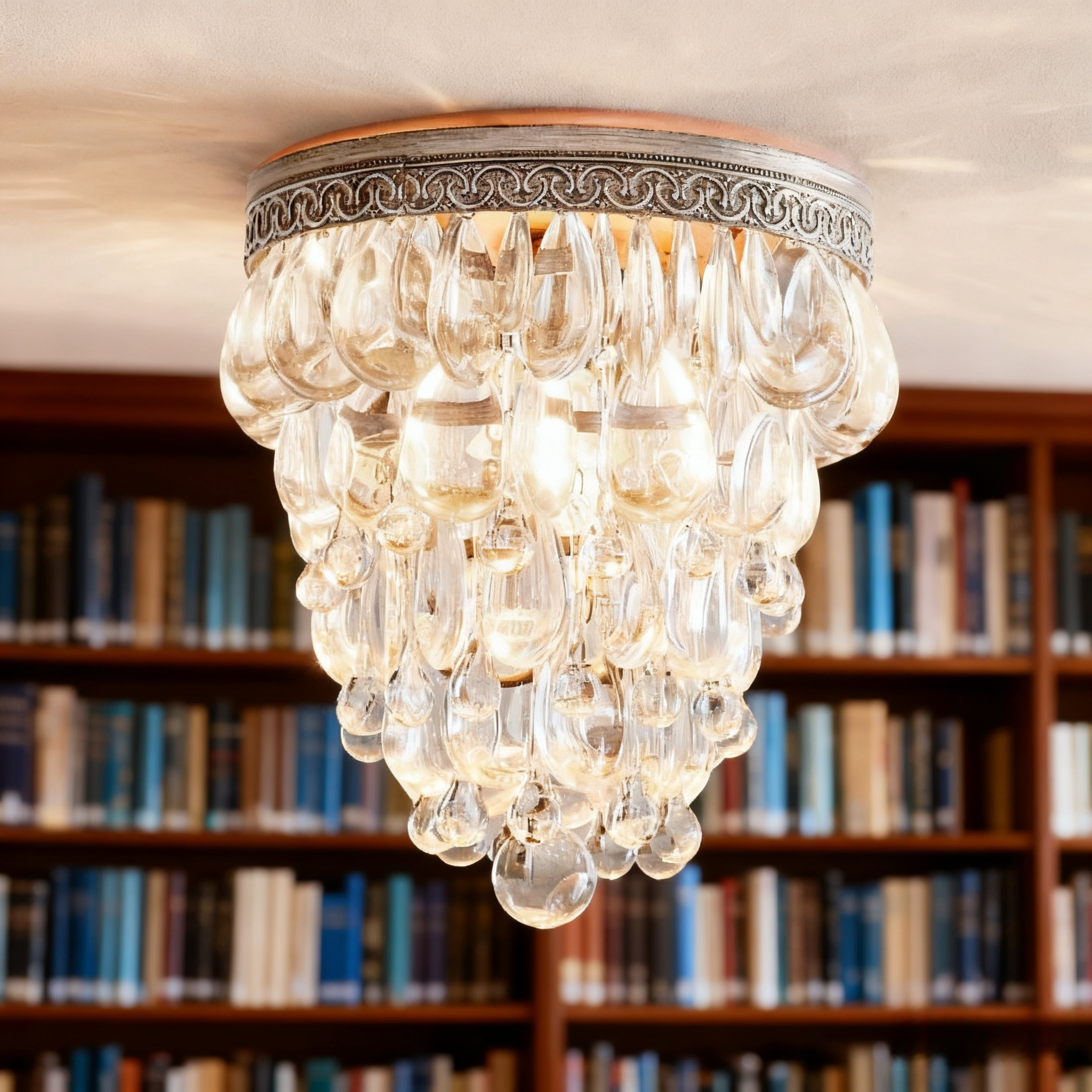- This flush mount offers a fresh interpretation of our classic Ceiling Lamps For Living Room Collection. Its updated design features a sleek, spherical frame adorned with crystal droplets in tear and raindrop shapes, adding a touch of sophistication to your home decor.
