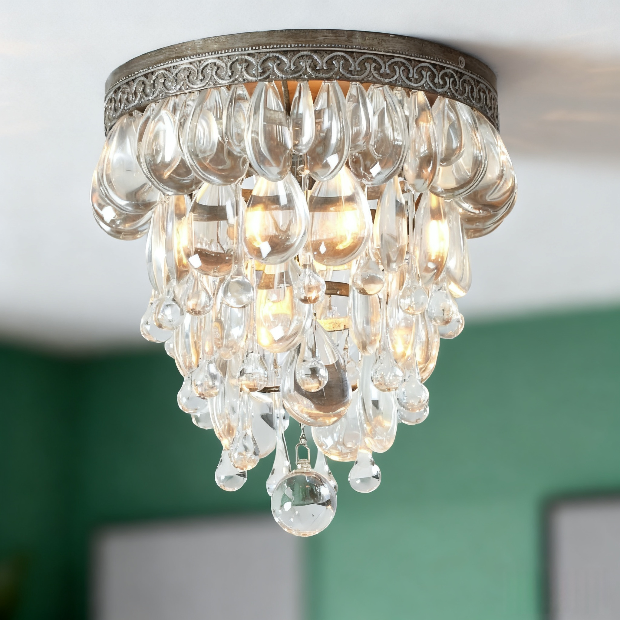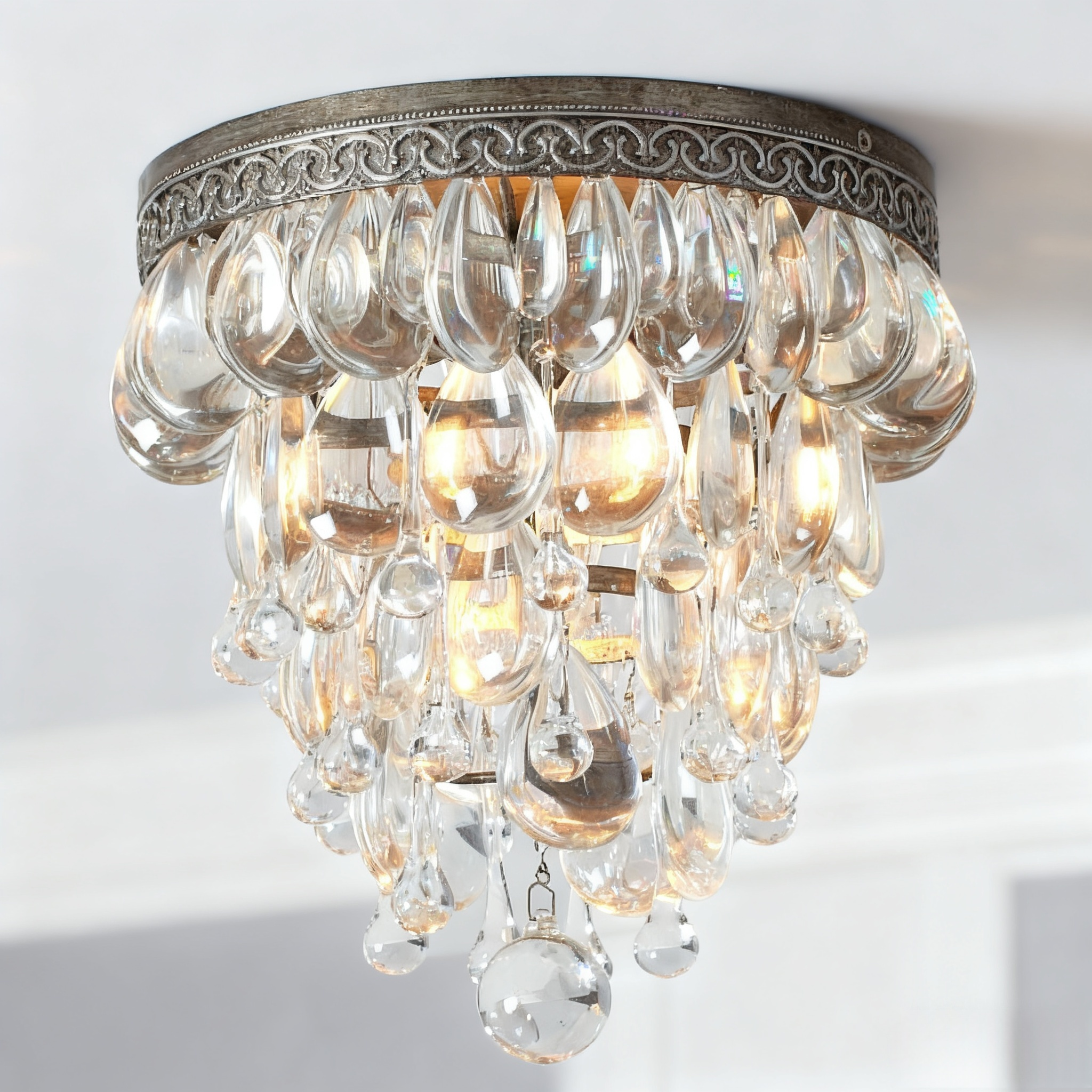 - Featuring dozens of faceted-glass crystals, this flush mount creates a stunning cascade of light, with raindrop accents that beautifully illuminate dining room tables or entryways, making it the perfect choice for elegant lighting in smaller spaces.