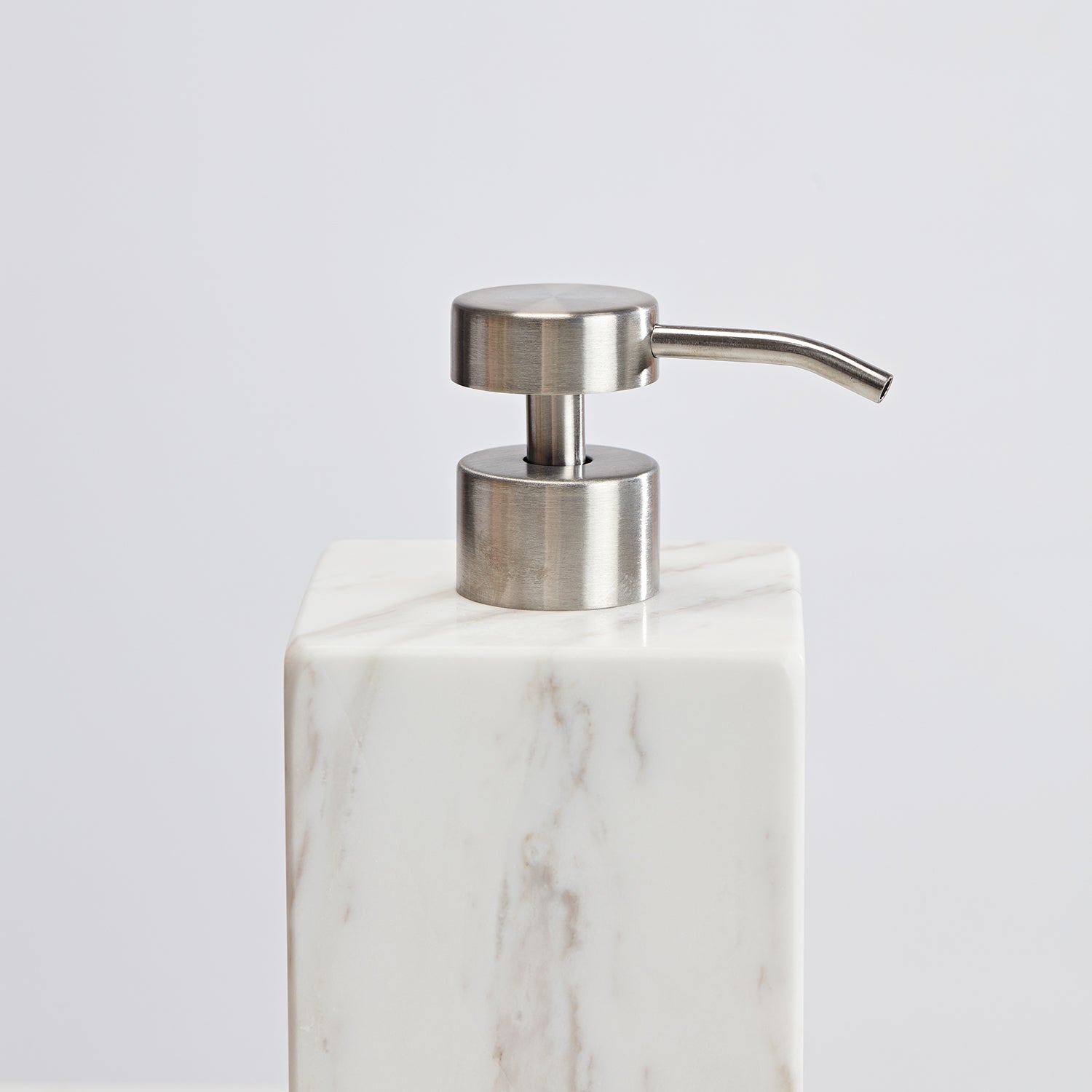 - Material: Crafted from Arabascato marble, known for its strength and distinctive dusty grey veining, complemented by a sleek stainless steel pump.