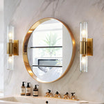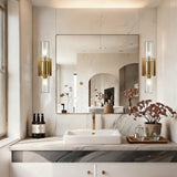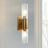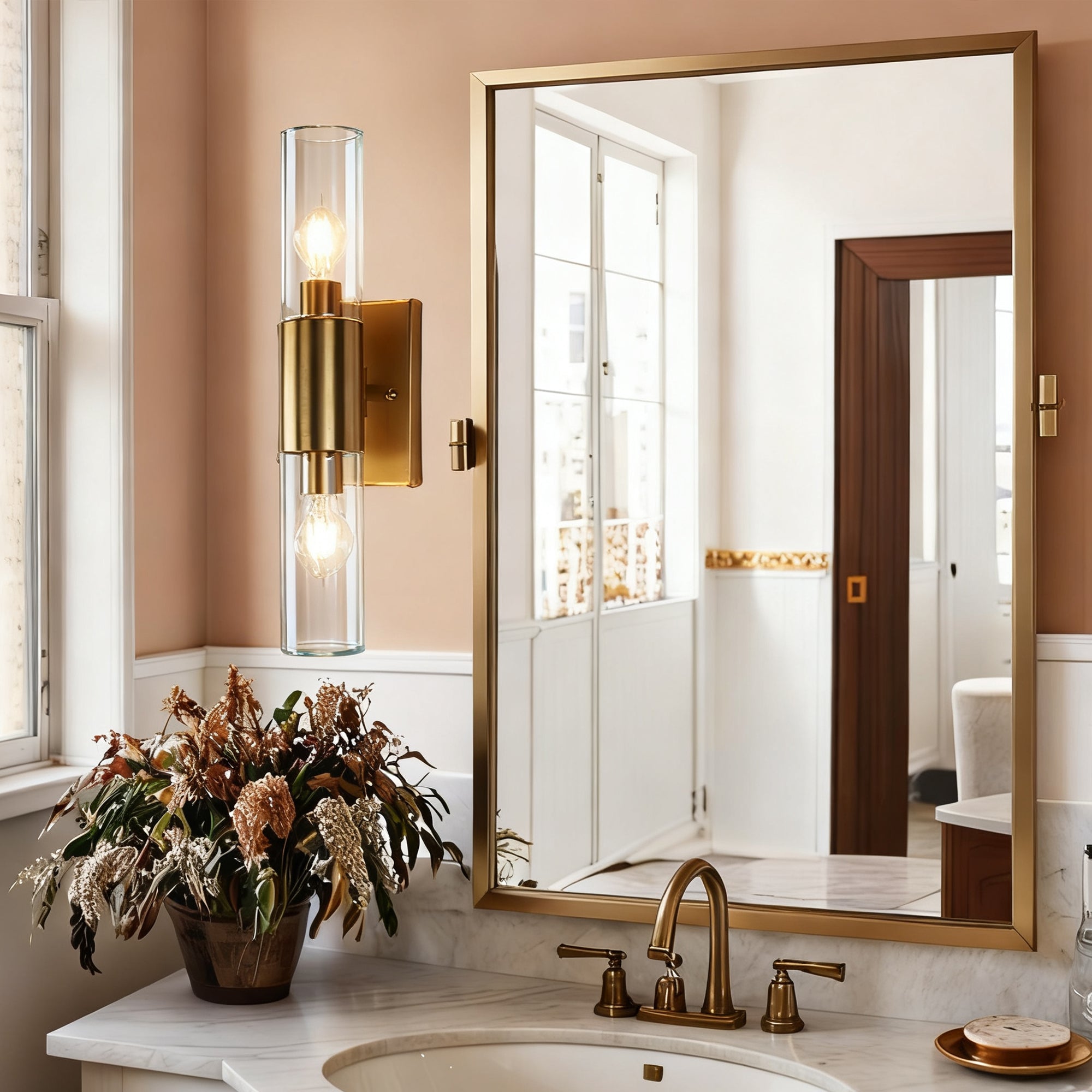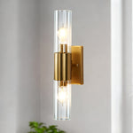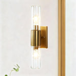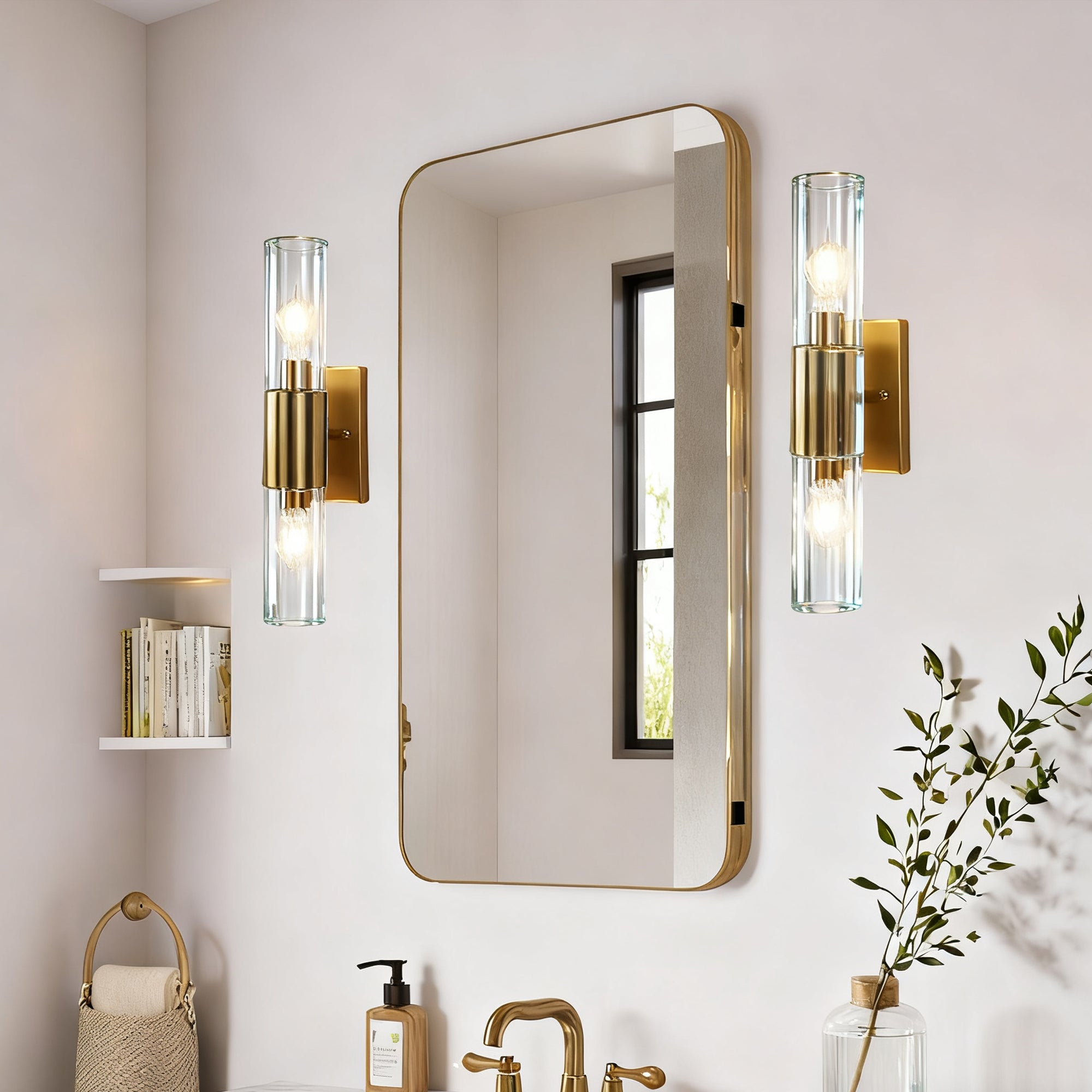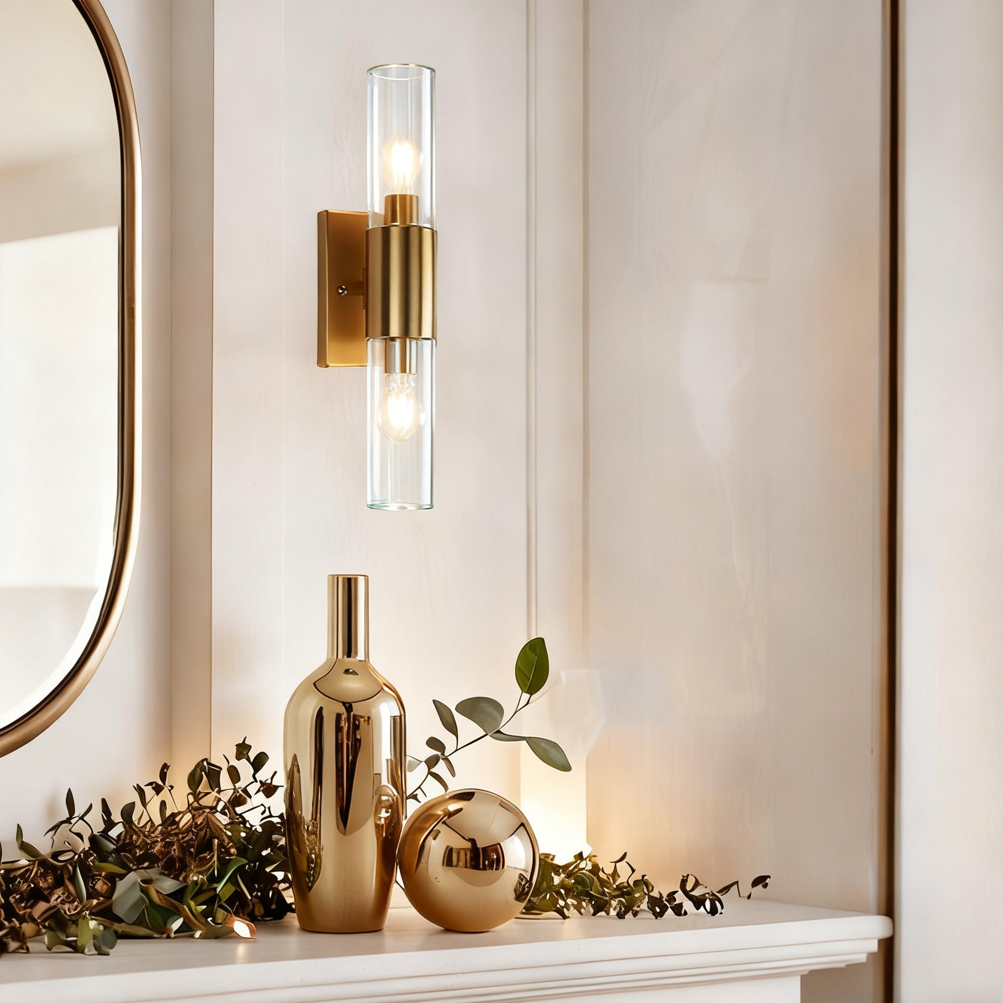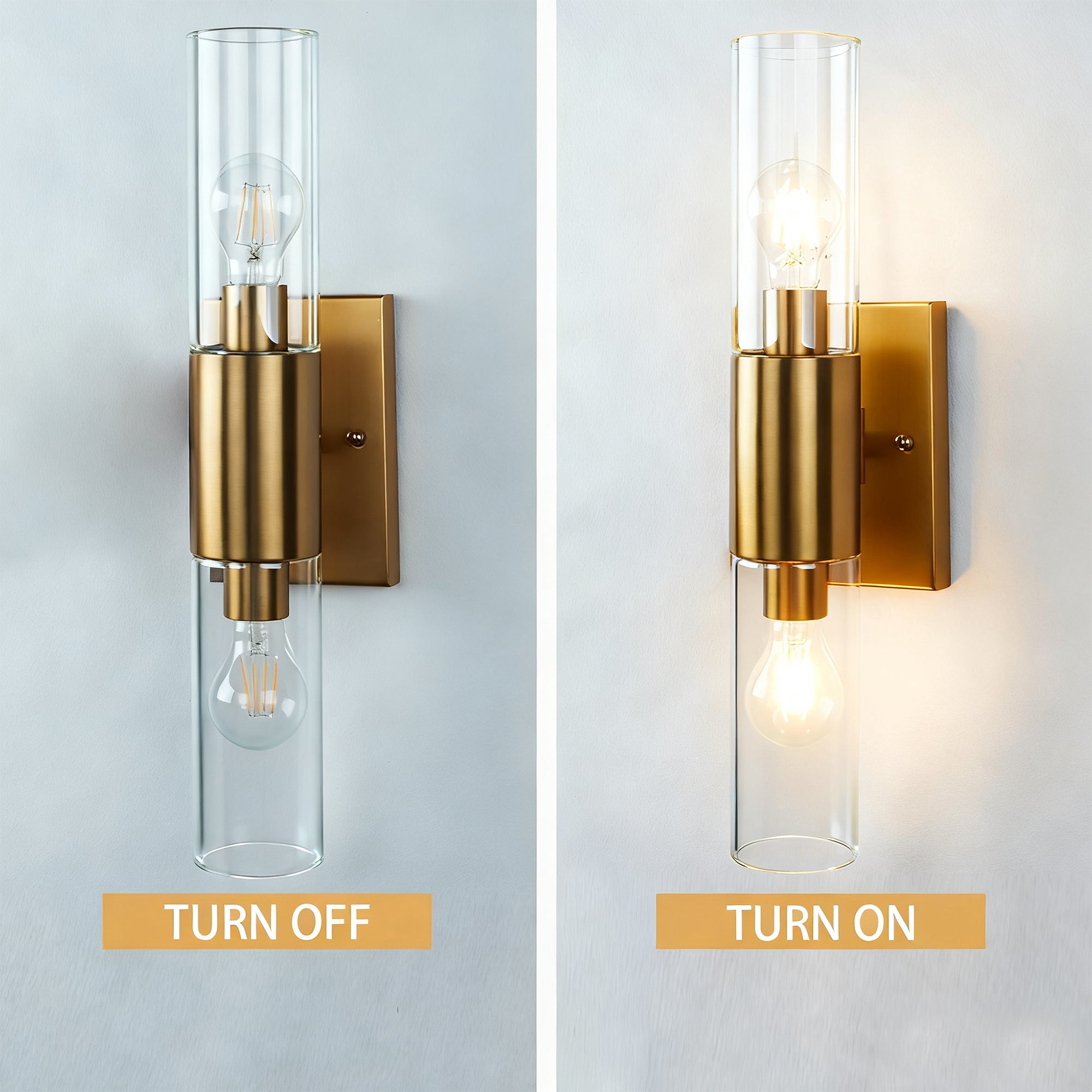 - The Double Tube Glass Wall Sconce from our Sconce Collection features clean geometric lines that bring a rustic aesthetic with a subtle industrial edge, perfect for enhancing your bathroom or any space in need of stylish lighting.
