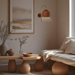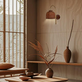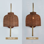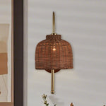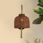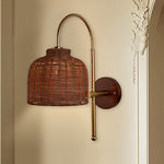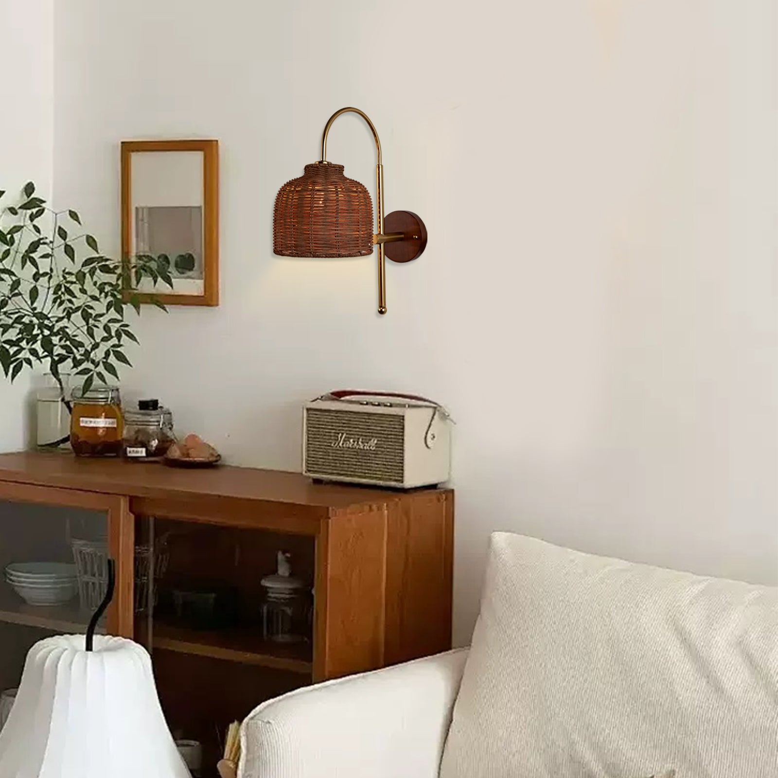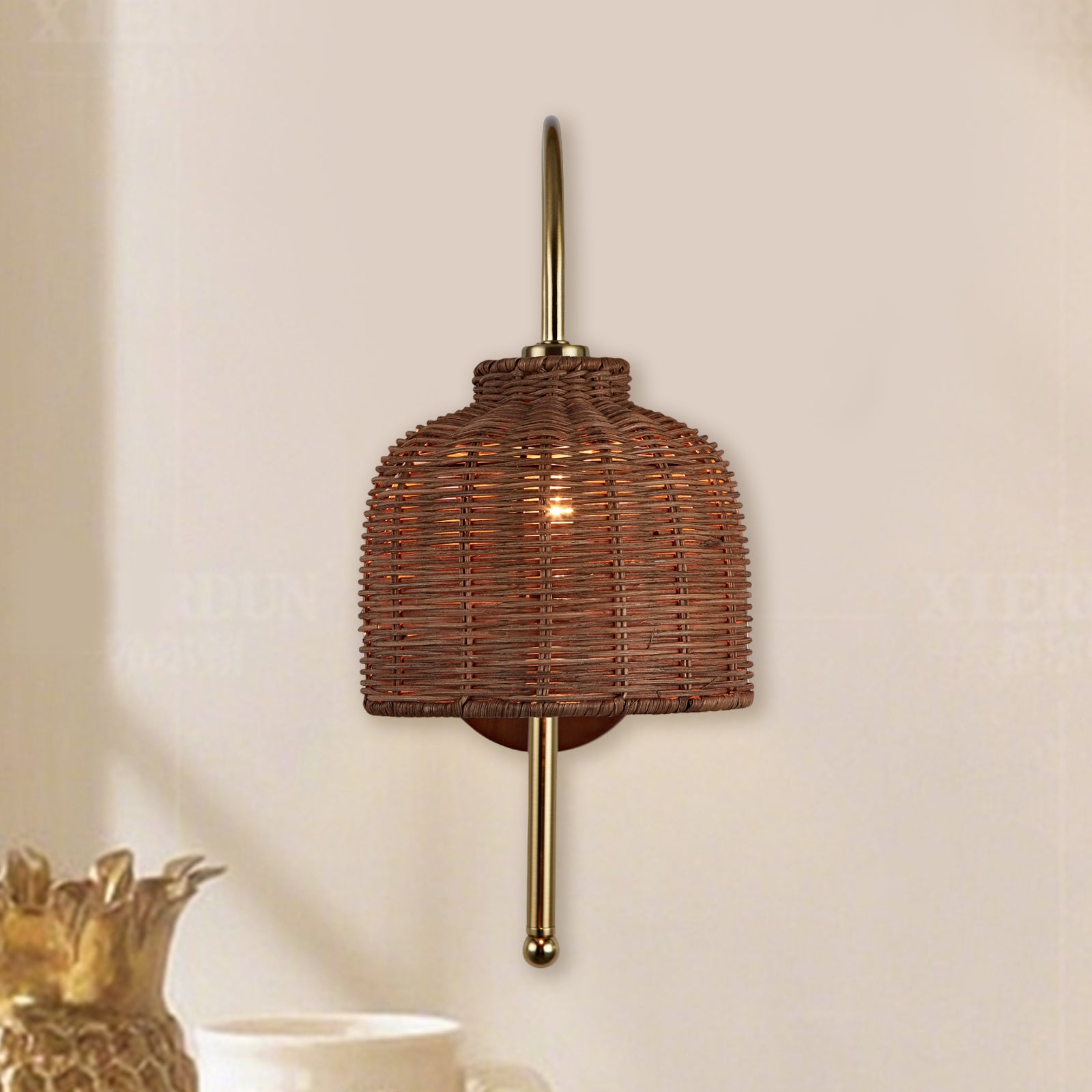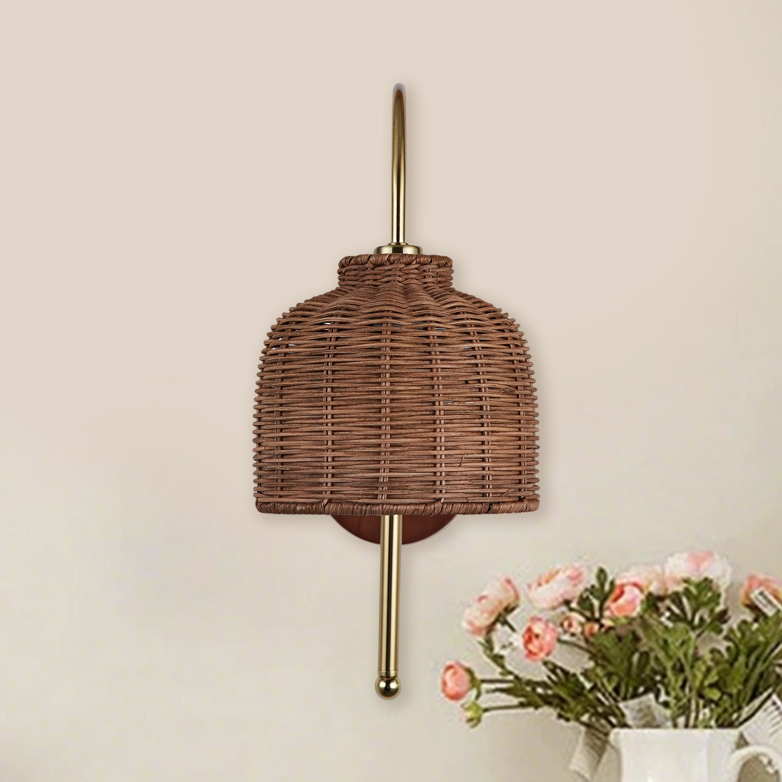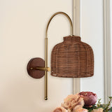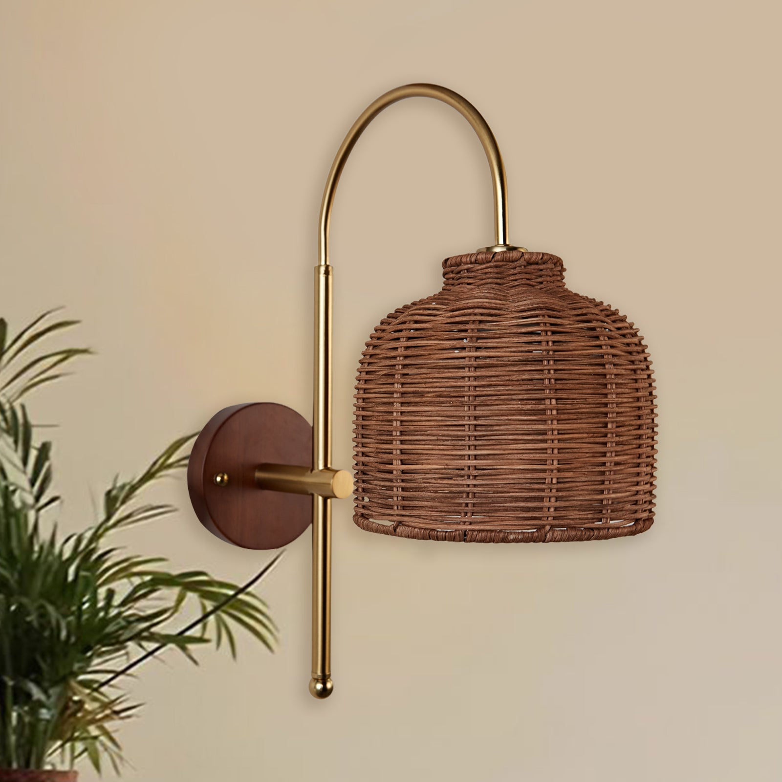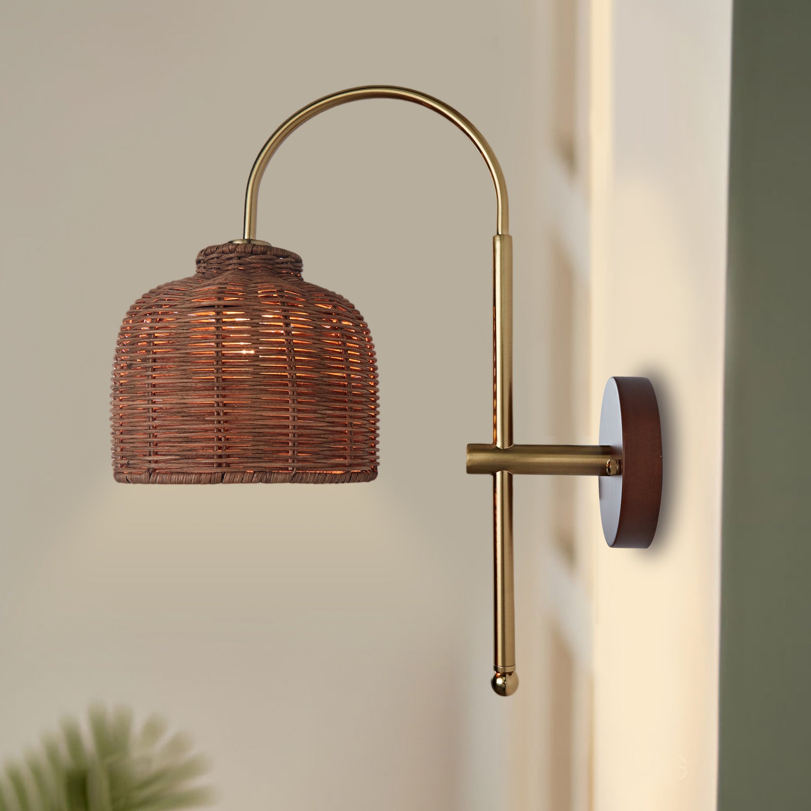 - A curvy rattan shade complements an arching metal arm and a unique wooden canopy for a wall sconce brimming with charm.