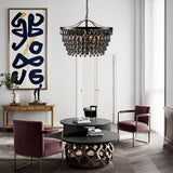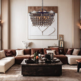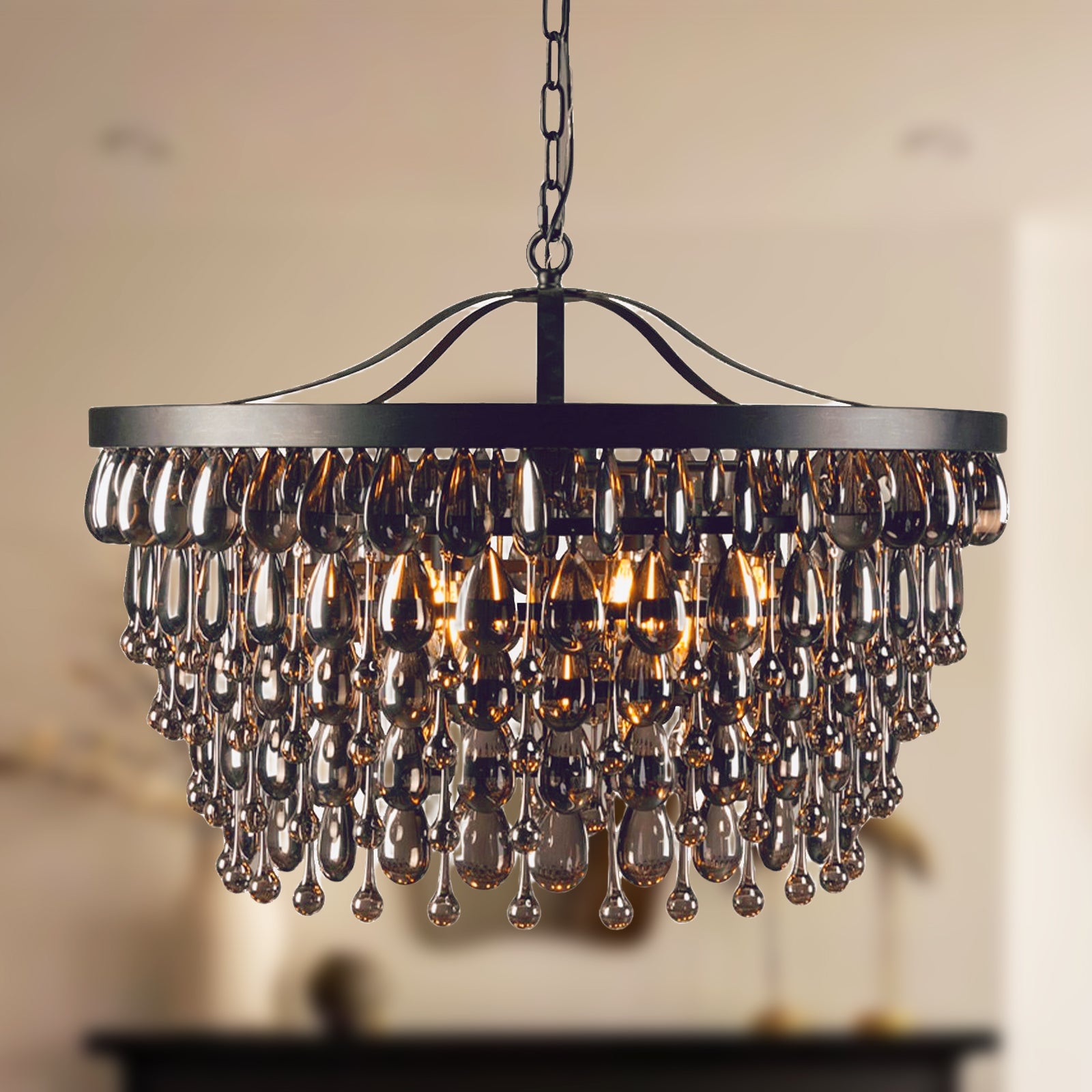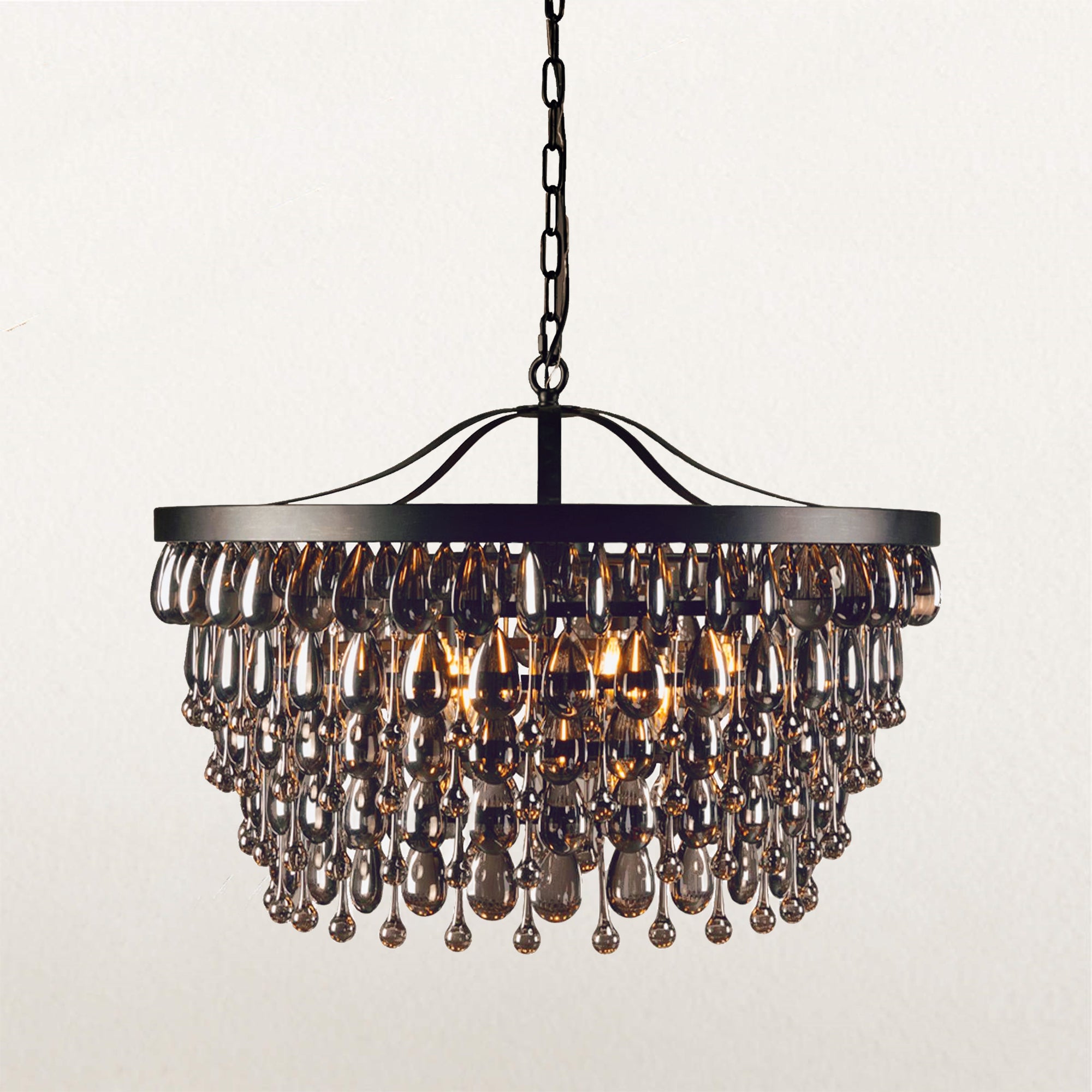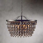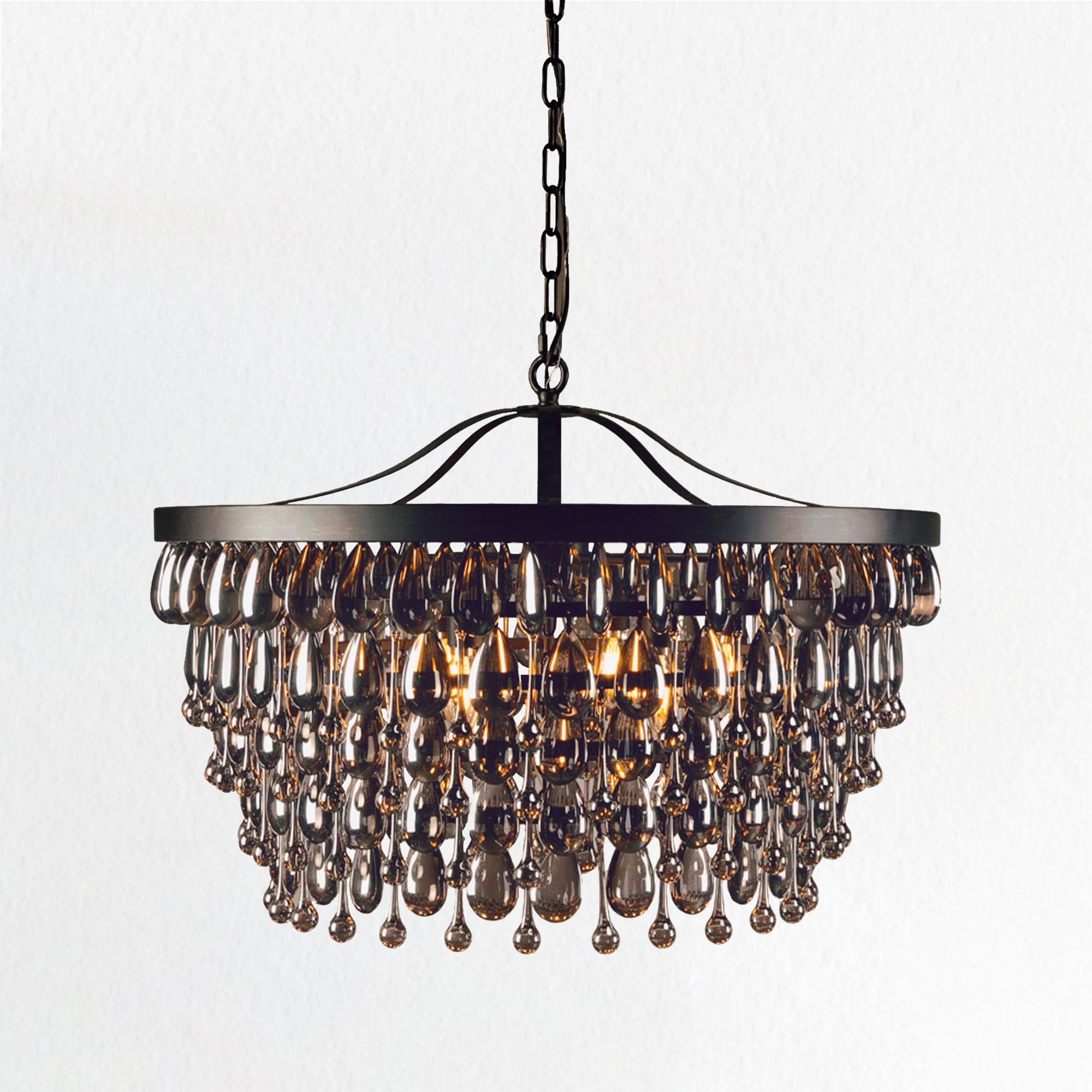 - Dripping in grey glass beads, this chandelier exudes vintage glamour and sophistication. The circular iron frame holds seven bulbs and over 300 cascading crystal droplets, creating a dazzling shine that will elevate the ambiance of your space.