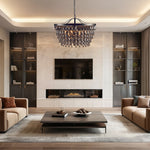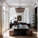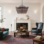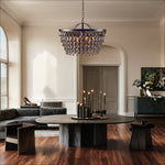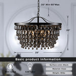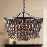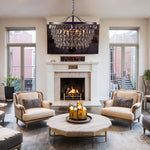 Vintage Glamour Black Iron Chandelier with Grey Glass Beads and Crystal Droplets - Circular Iron Frame with Black Finish and Vintage Glamour - Ideal for Ceiling Lamp for Bedroom and Dining Room Light Fixtures