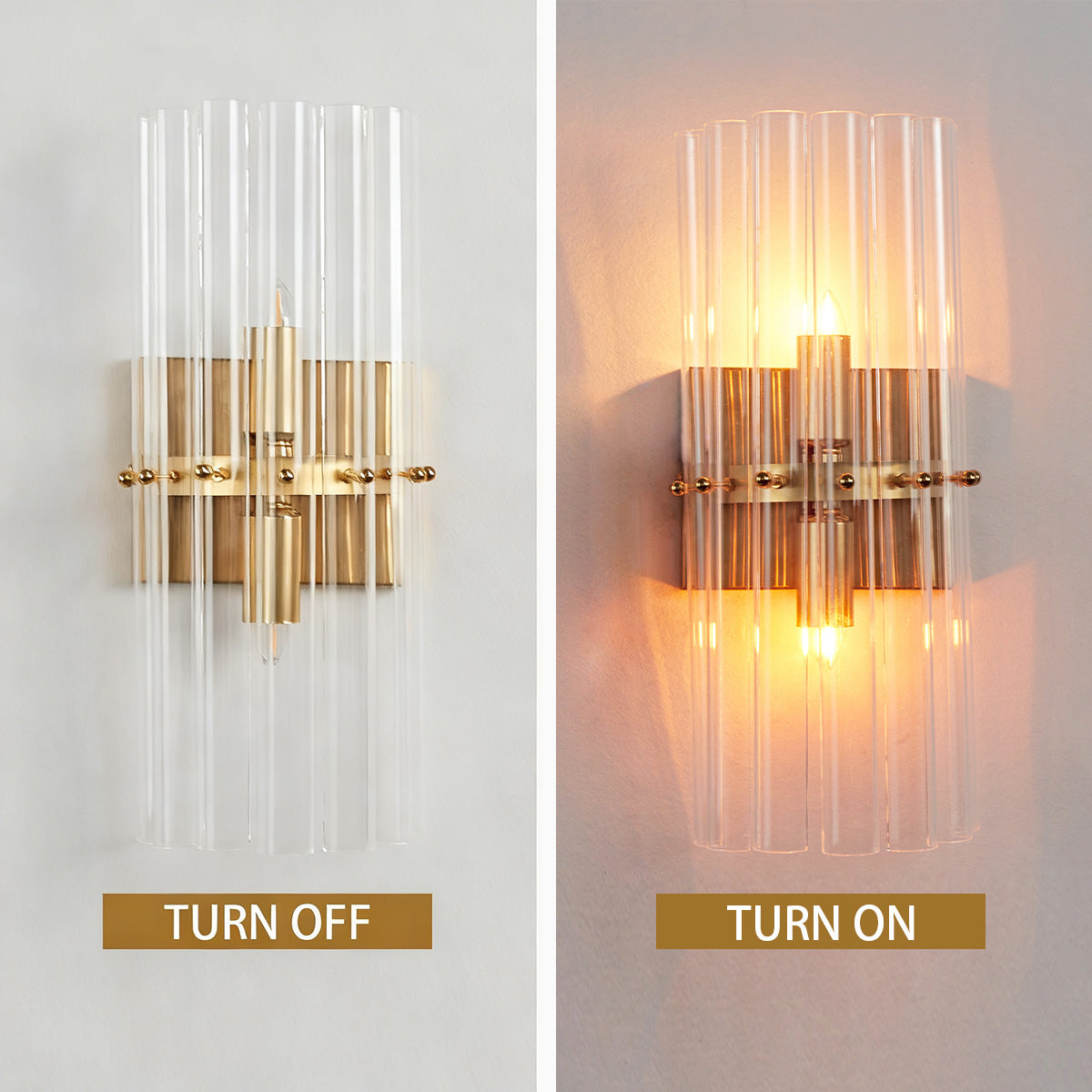 - Brighten up your space with our stunning Modern Crystal Brass Sconce! This chic wall light fixture draws inspiration from vintage designs, giving it a timeless appeal that's perfect for any room.