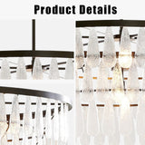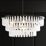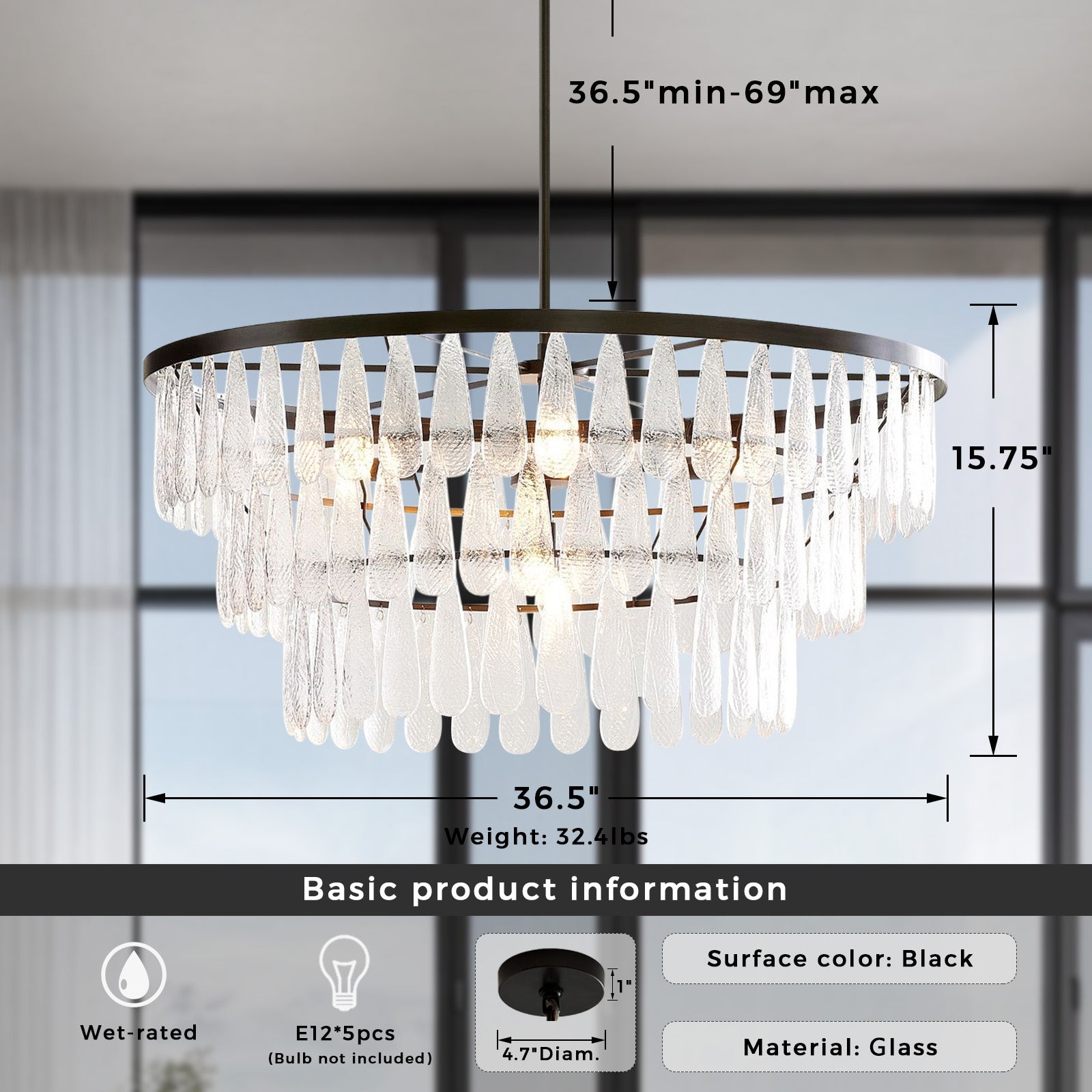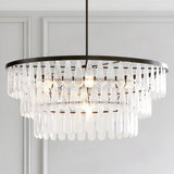 - Crafted with care, the chandelier features a sleek finished ring paired with textured teardrop tiles, creating a rustic yet elegant look that adds character to any room.